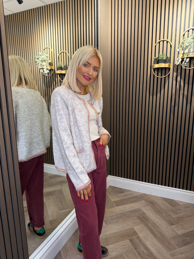 This is a beautiful beige knitted cardigan with multicolour stitching on the cuffs and hemline. Gold buttons down the front.