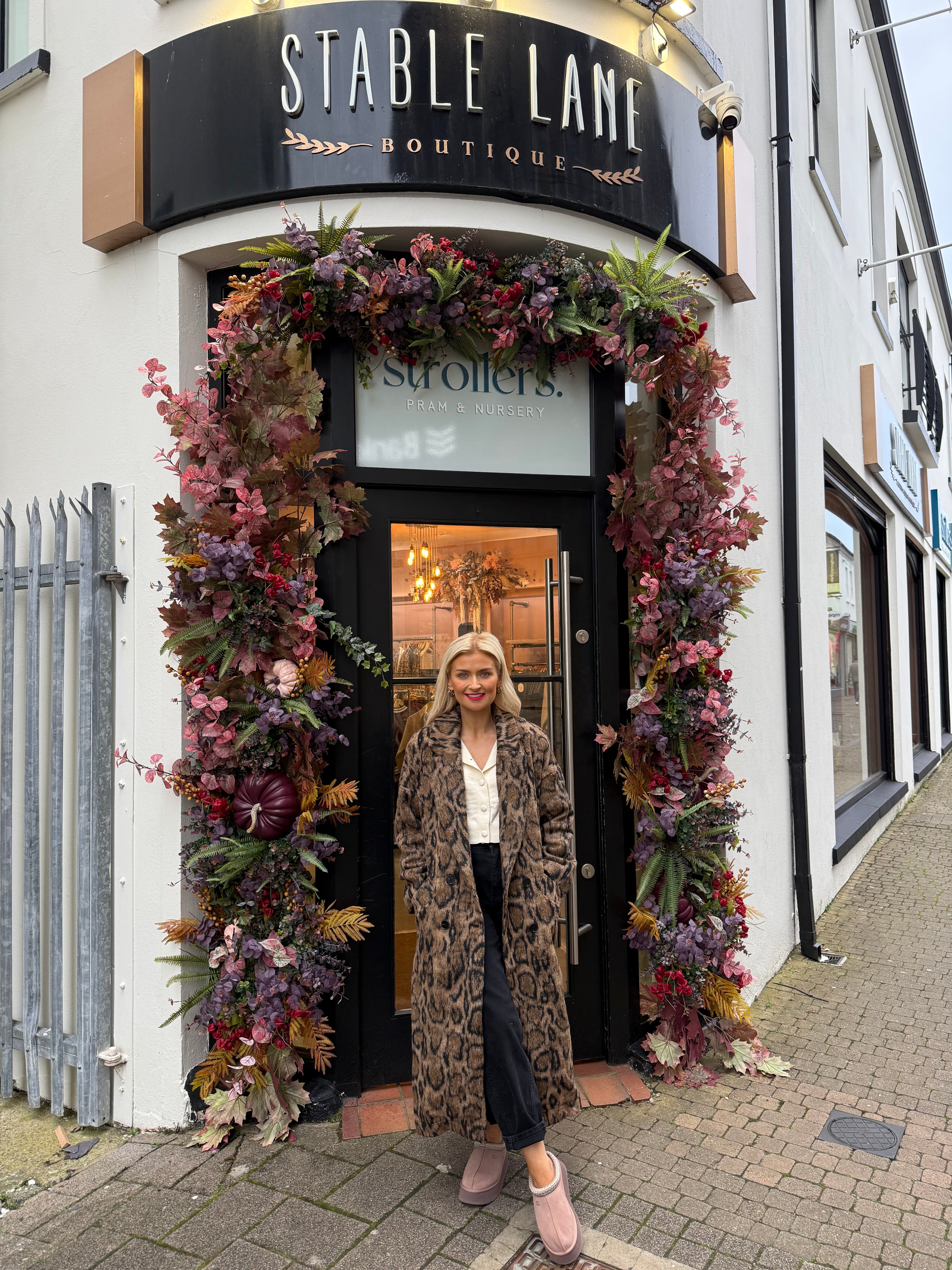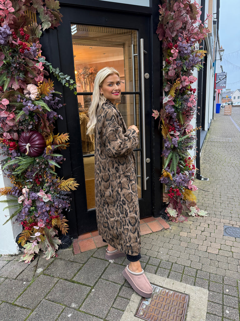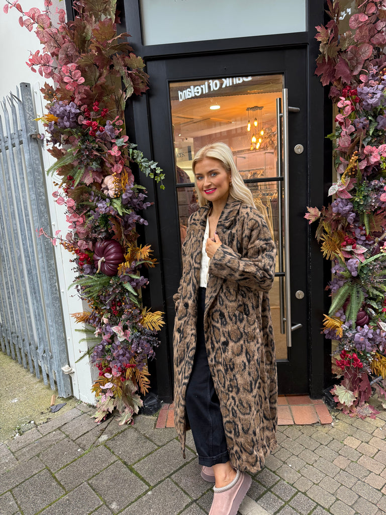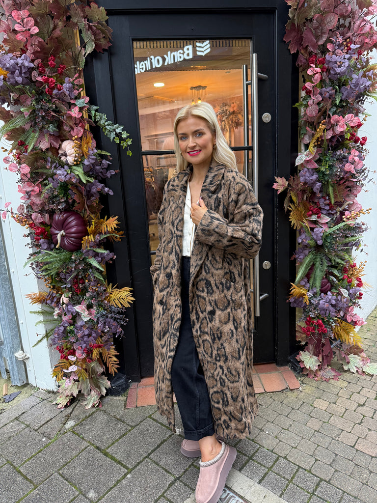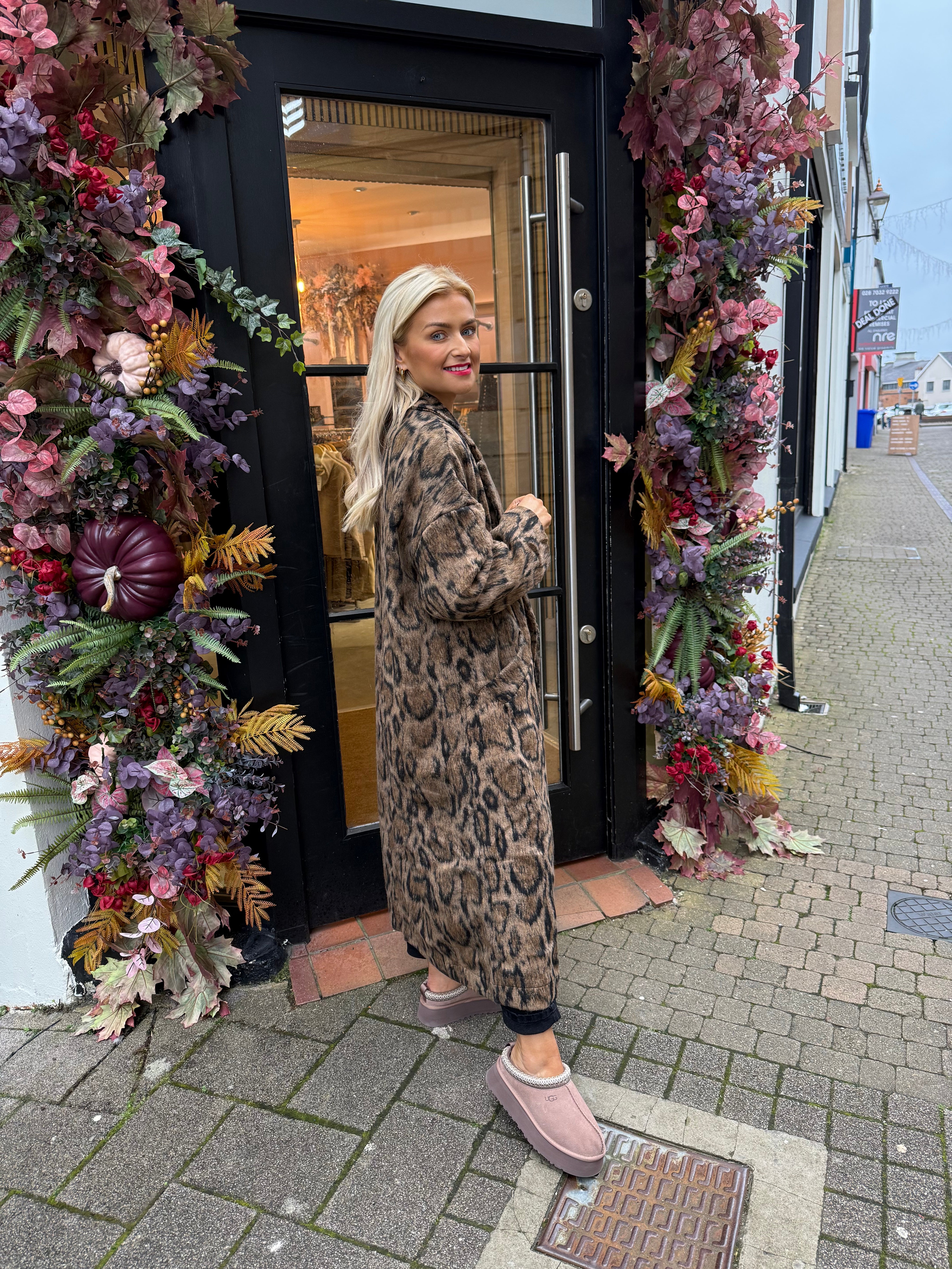 Longline, faux faut leopard print coat. The perfect addition to your winter wardrobe.