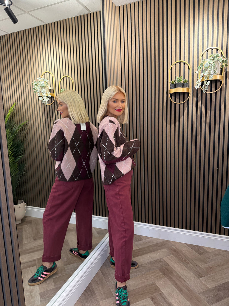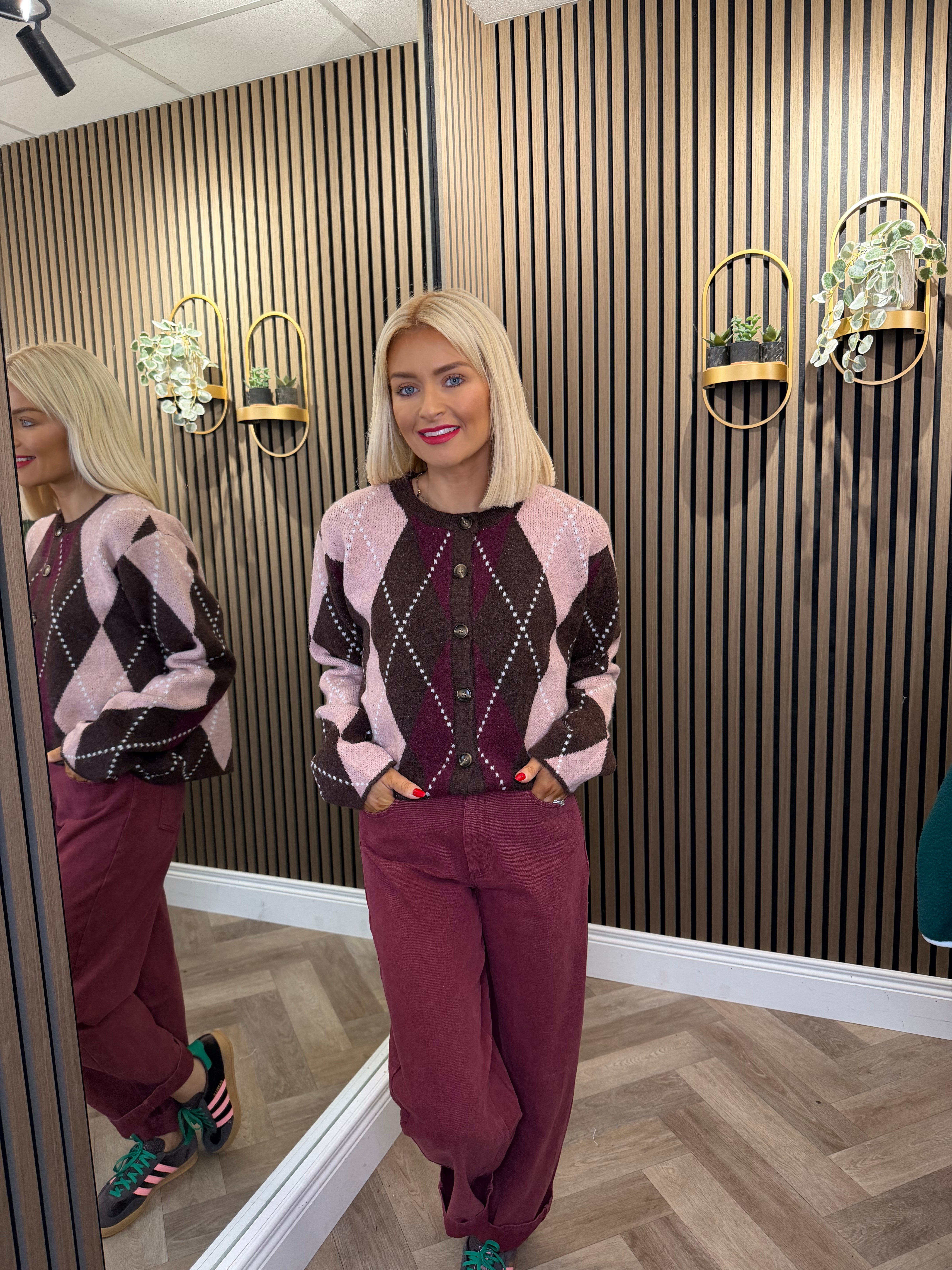 This is a fab round neck cardigan in a burgundy, pink and brown check. Other colours available.