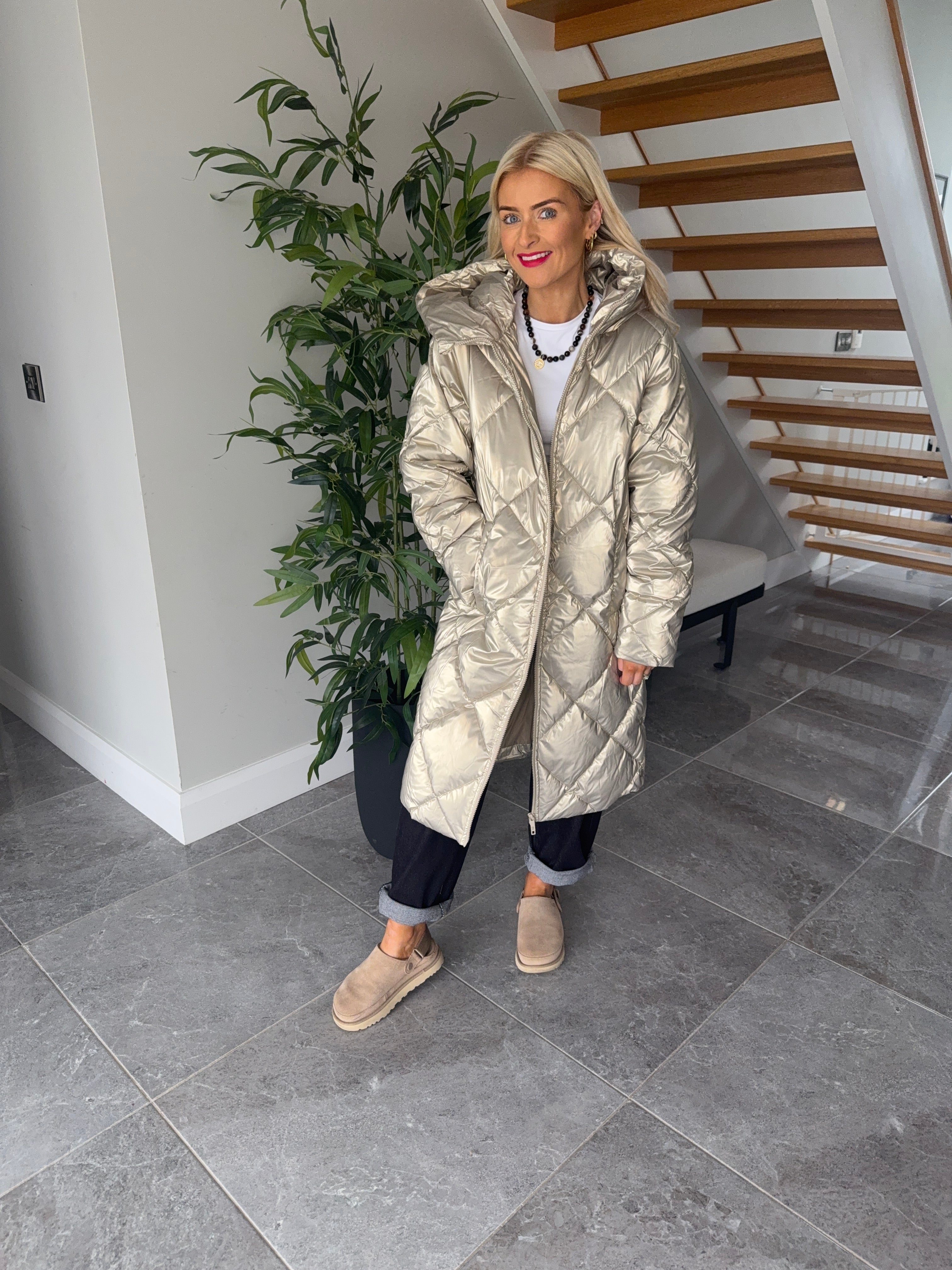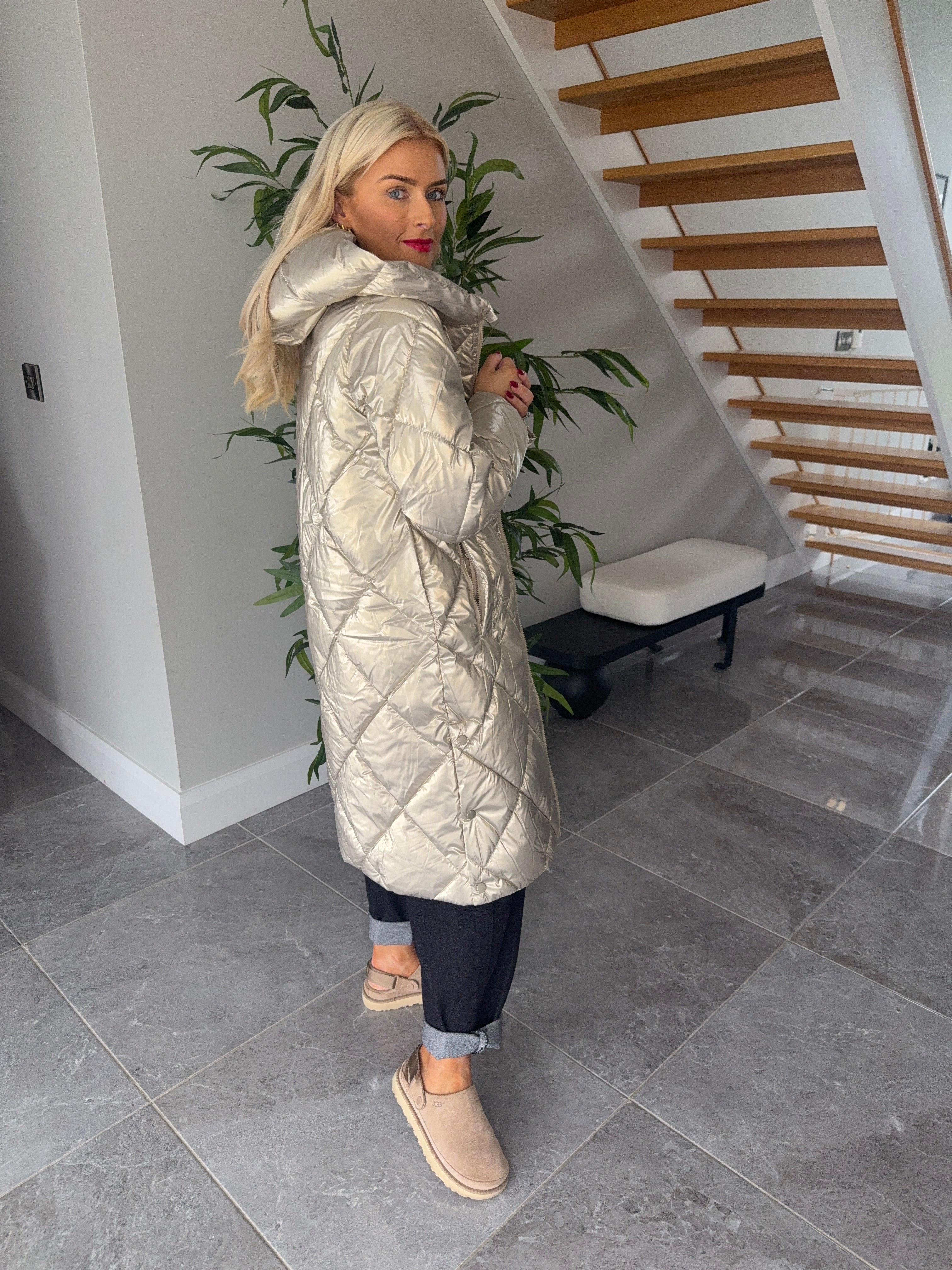 The perfect puffa! This is a gorgeous gold puffa coat. Below knee length, zip side pockets, button side opening, hood.