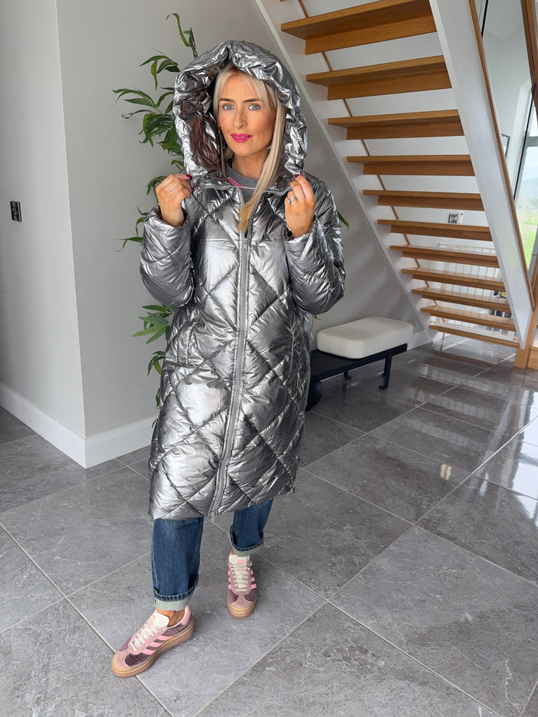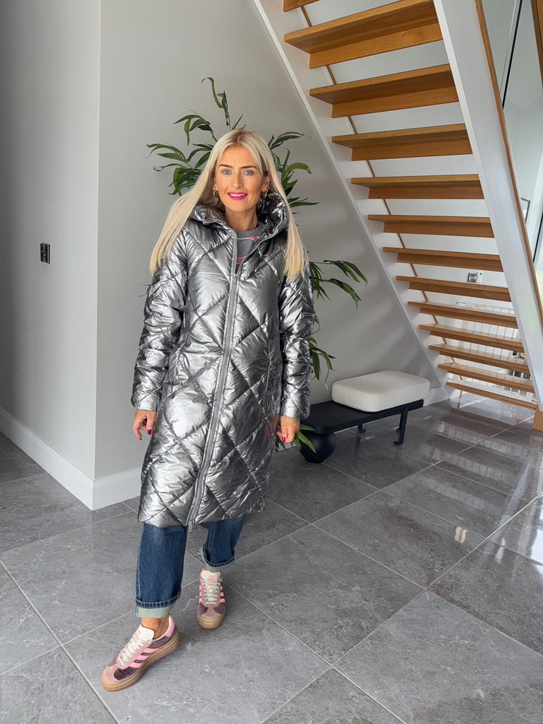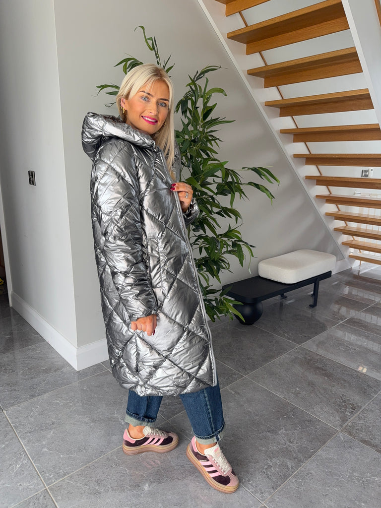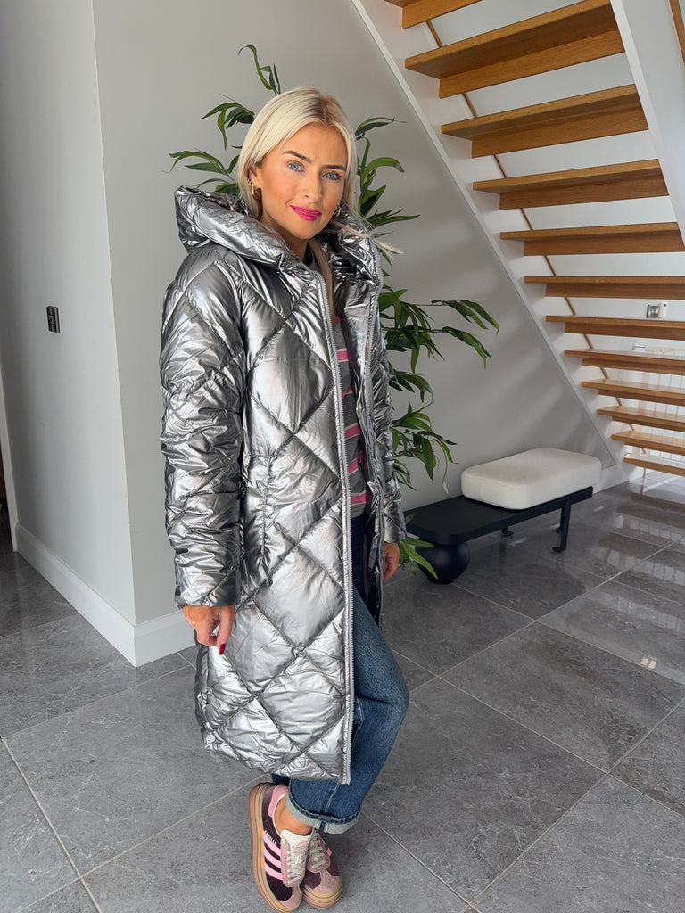 The perfect puffa! This is a gorgeous silver puffa coat. Below knee length, zip side pockets, button side opening, hood.