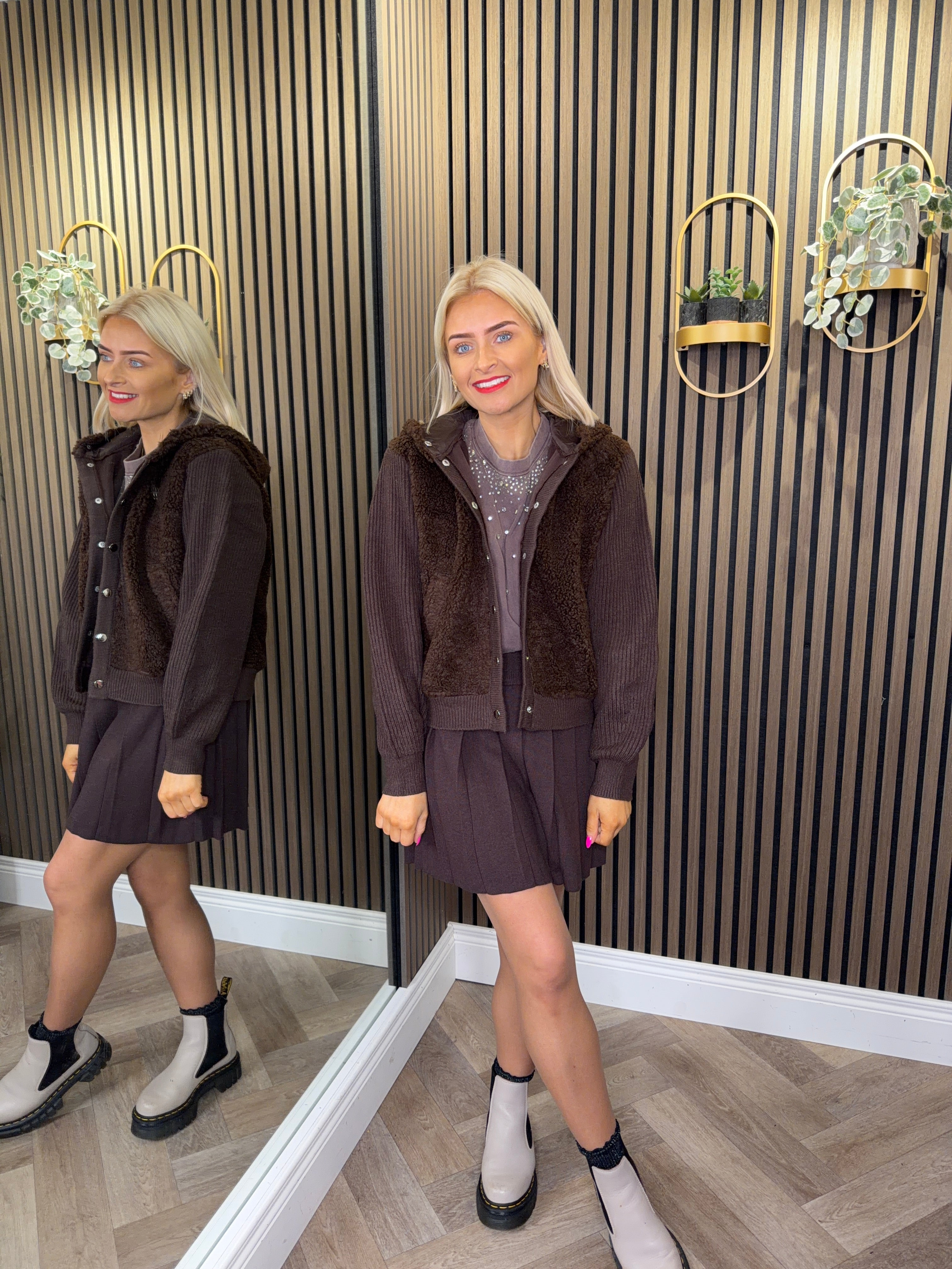 Teddy fabric jacket with knitted sleeve detailing. Button up and side pockets. Teddy fur hood. Available in more colours.