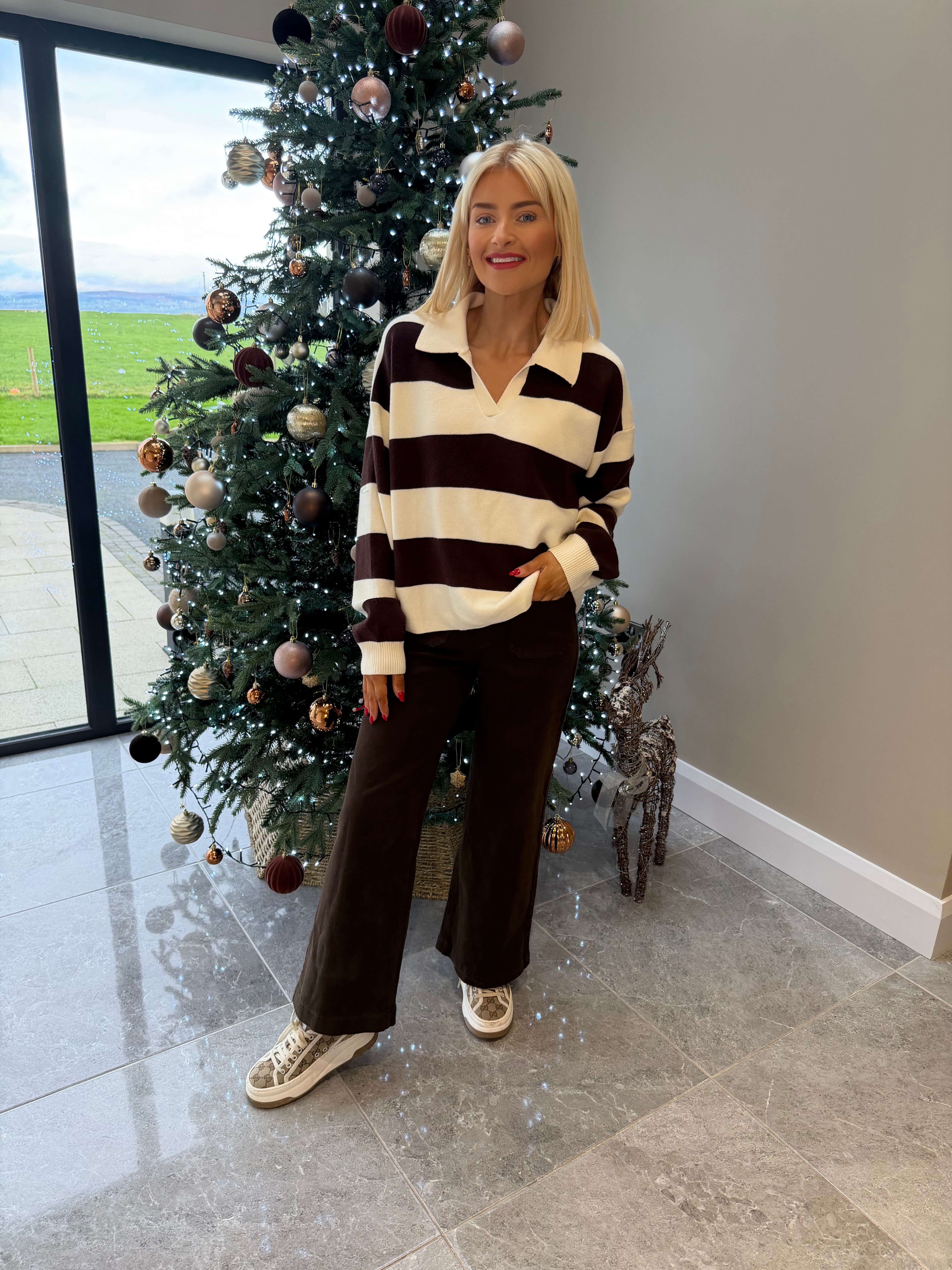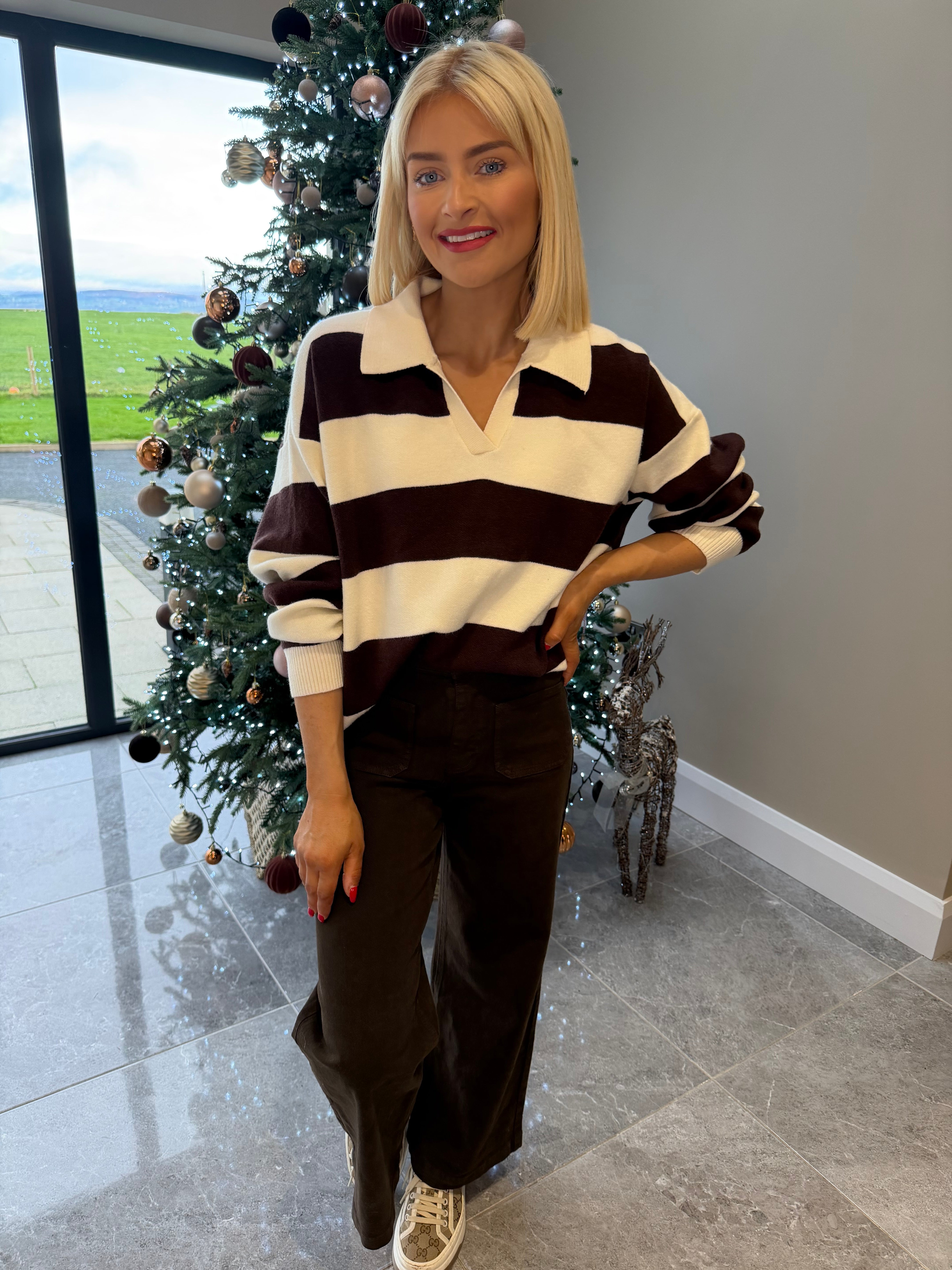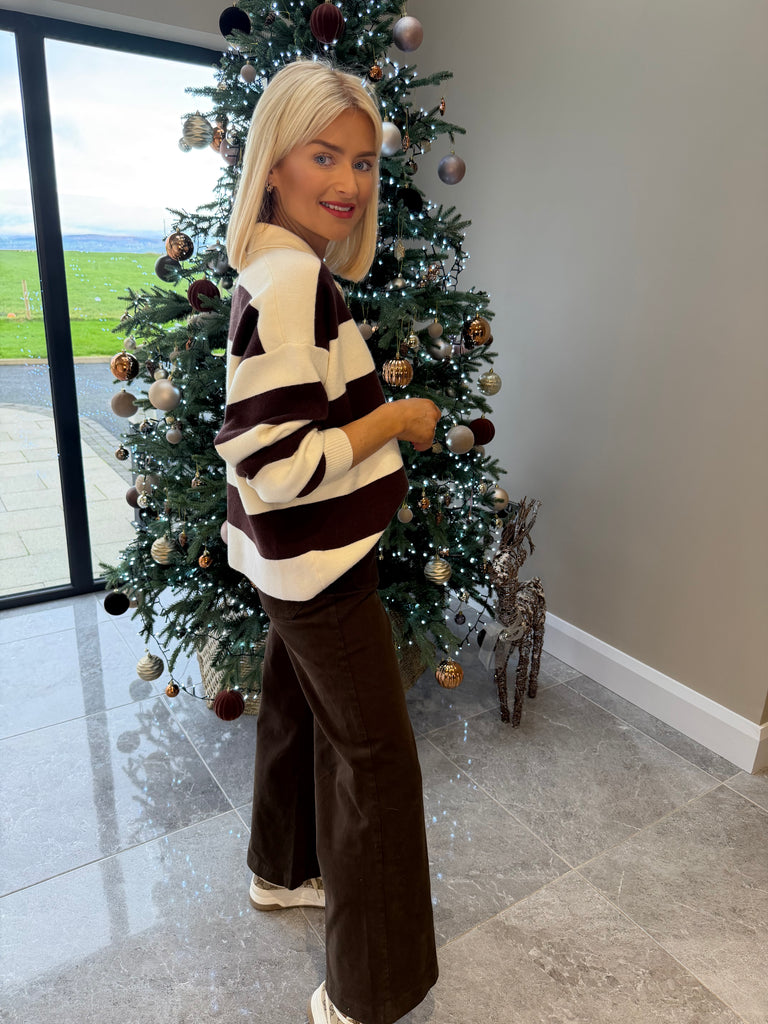 Long sleeve, relaxed style, stripe knit jumper. V neckline. Available in more colours.