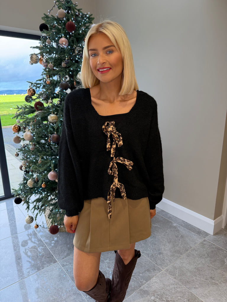 Long sleeve, relaxed fit knit jumper. Leopard print tie detailing at the back.