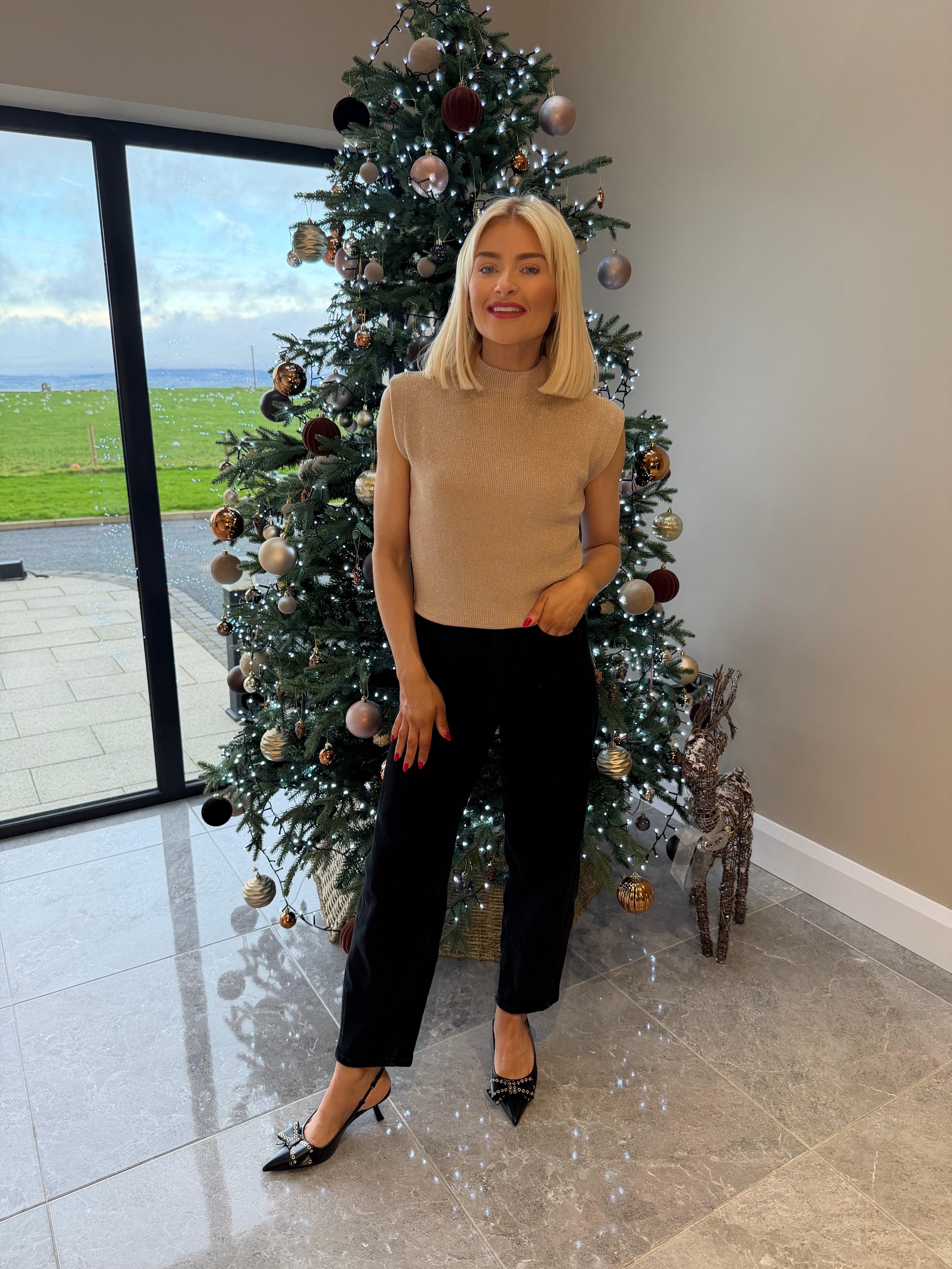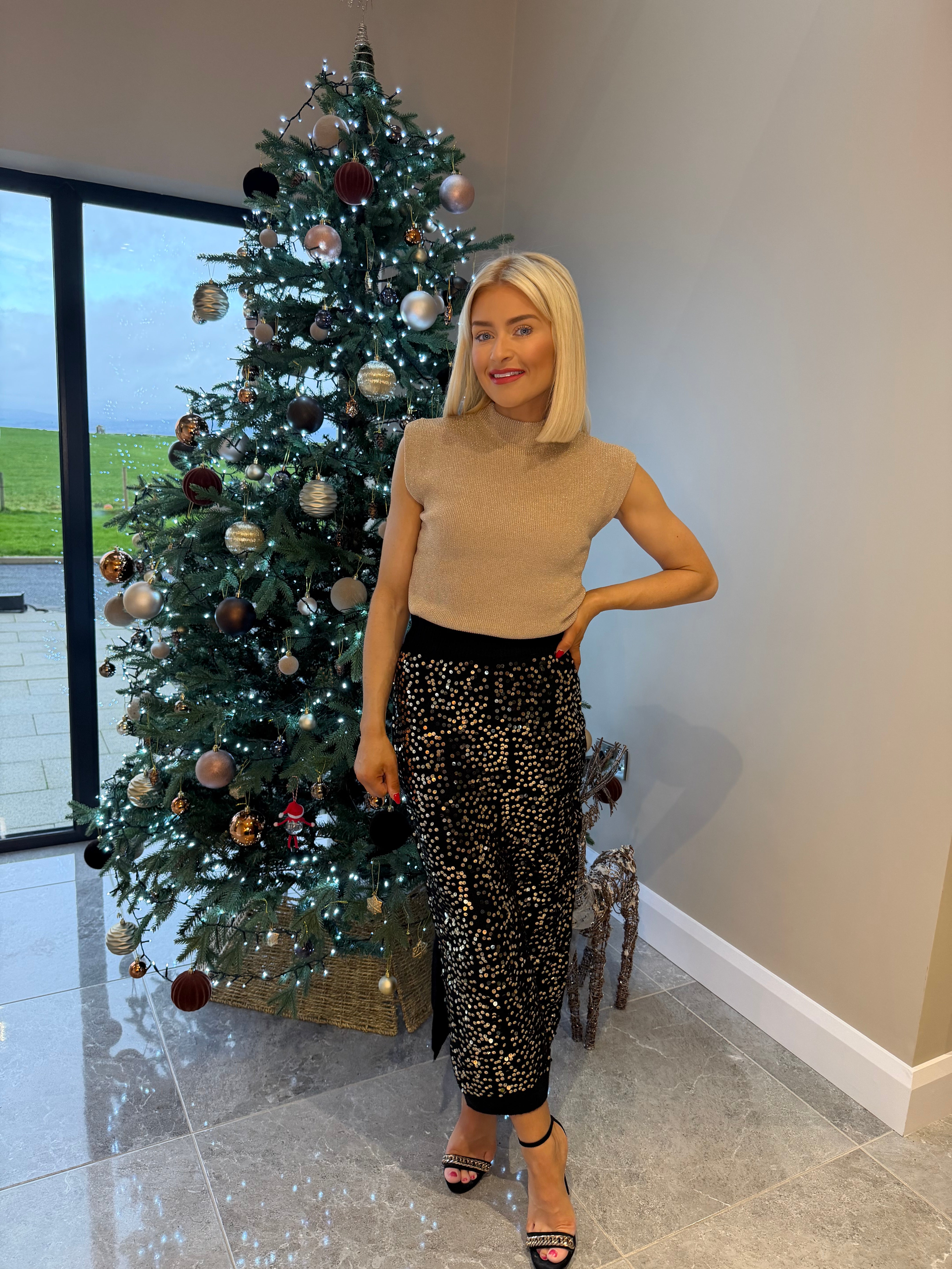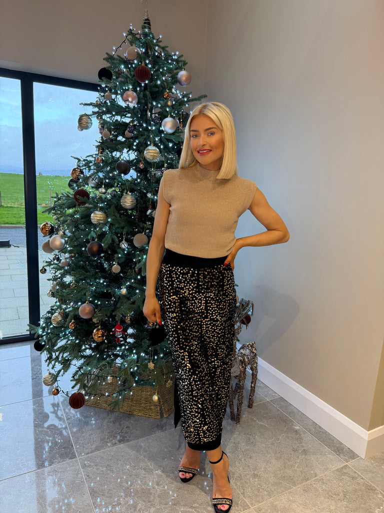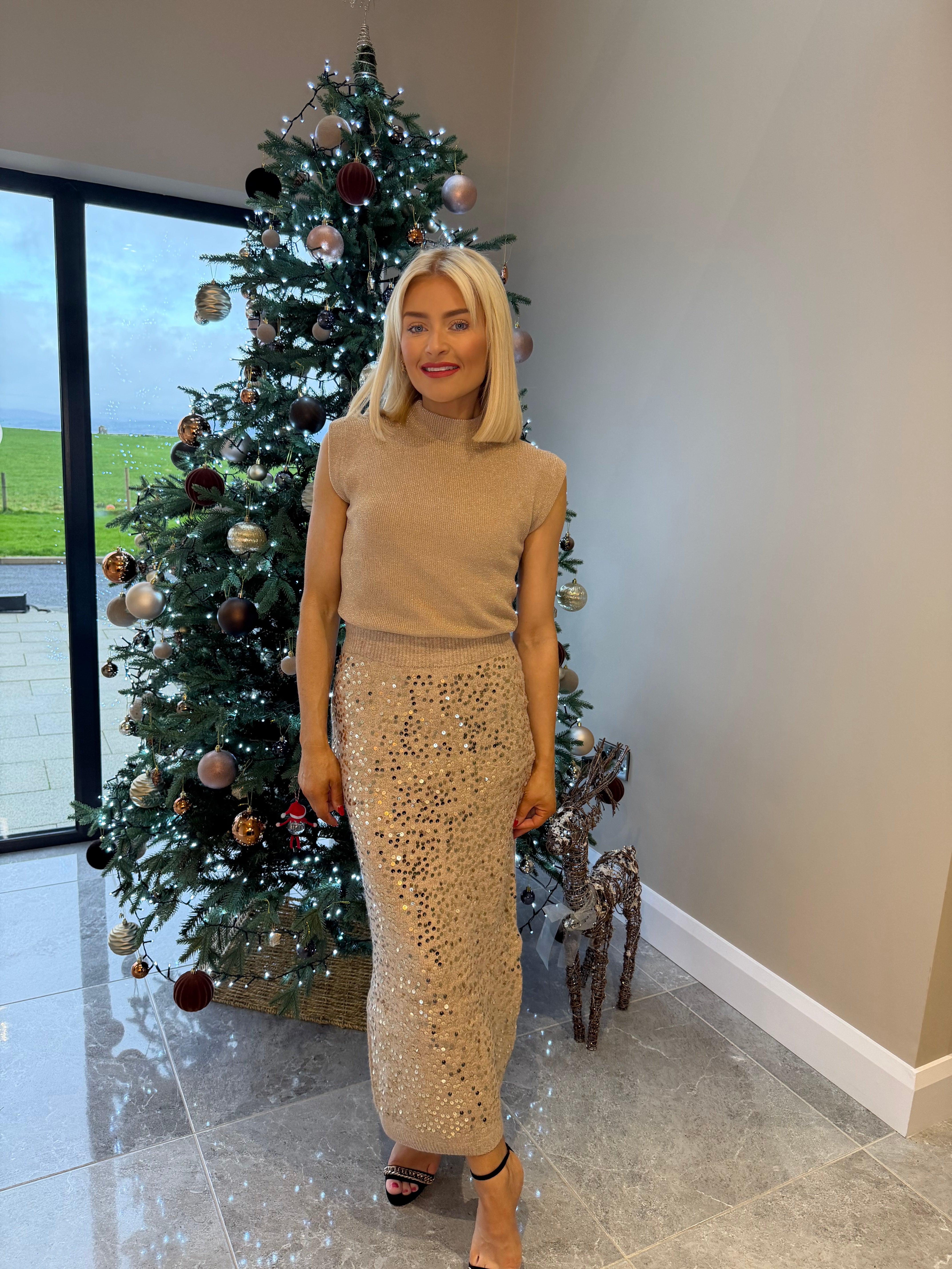 Round neckline, sleeveless knit, sequin style top. Available in more colours.