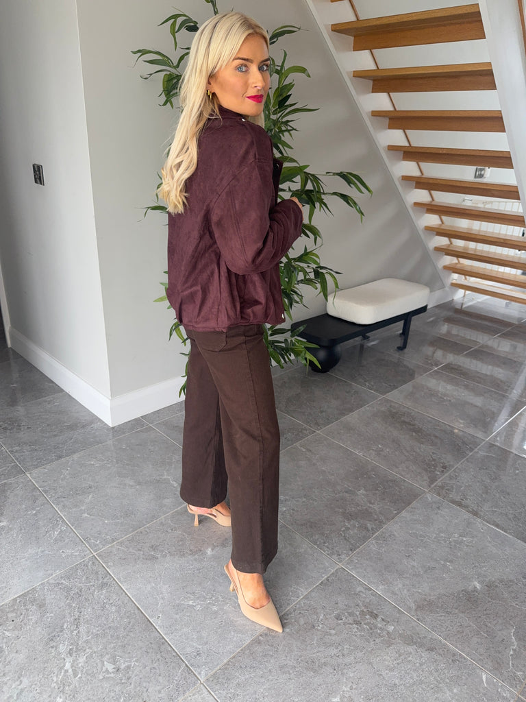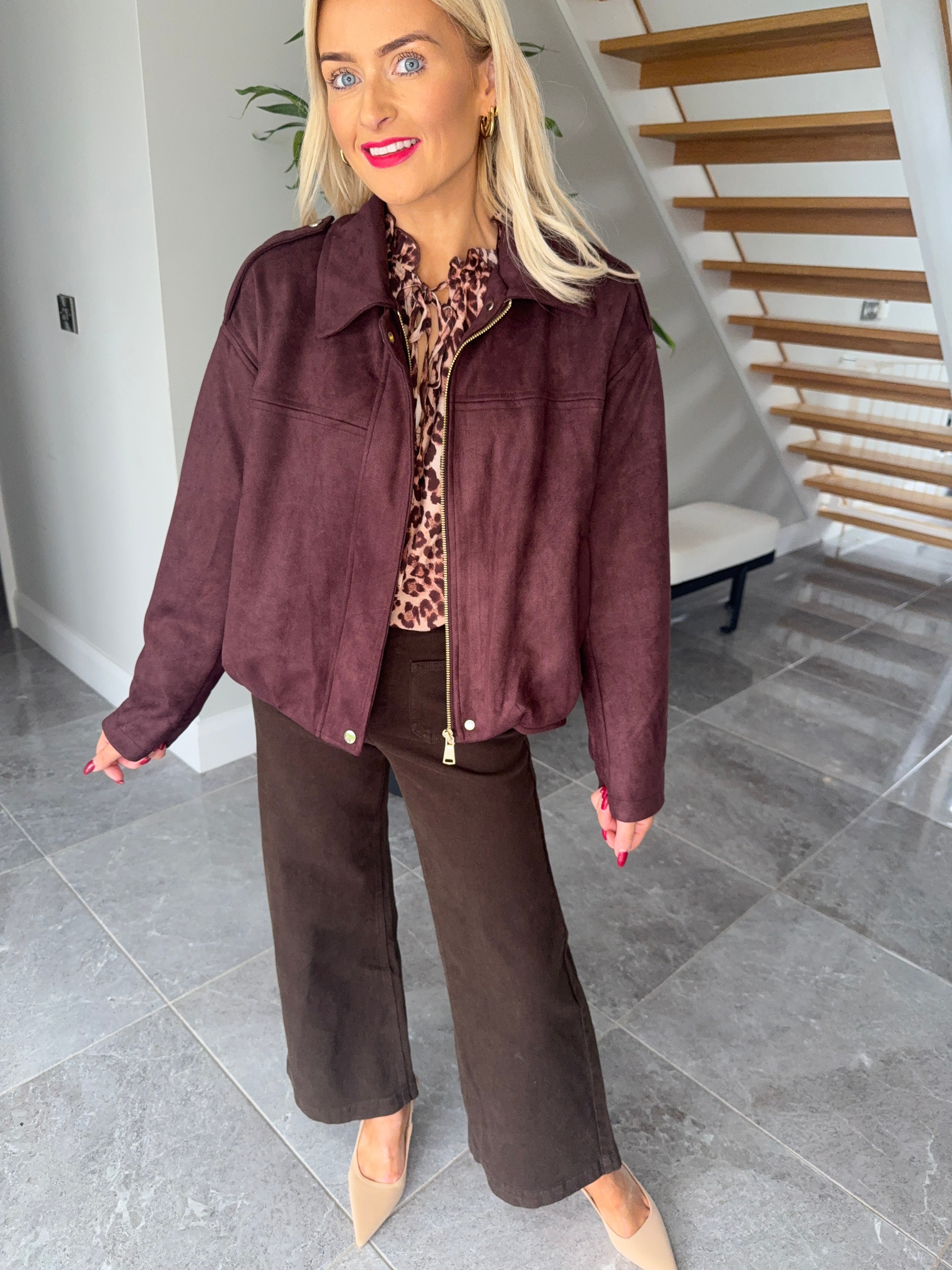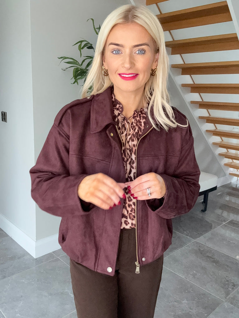 Long sleeve, bomber style, zip up, suede fabric jacket. Gorgeous burgundy shade.