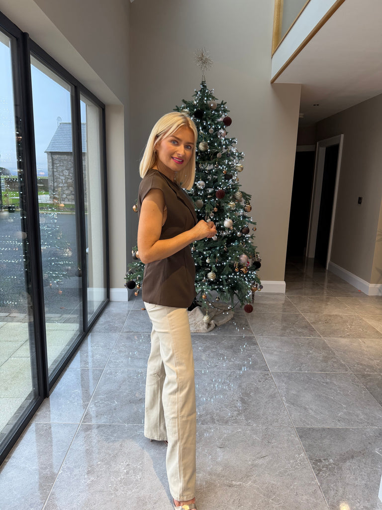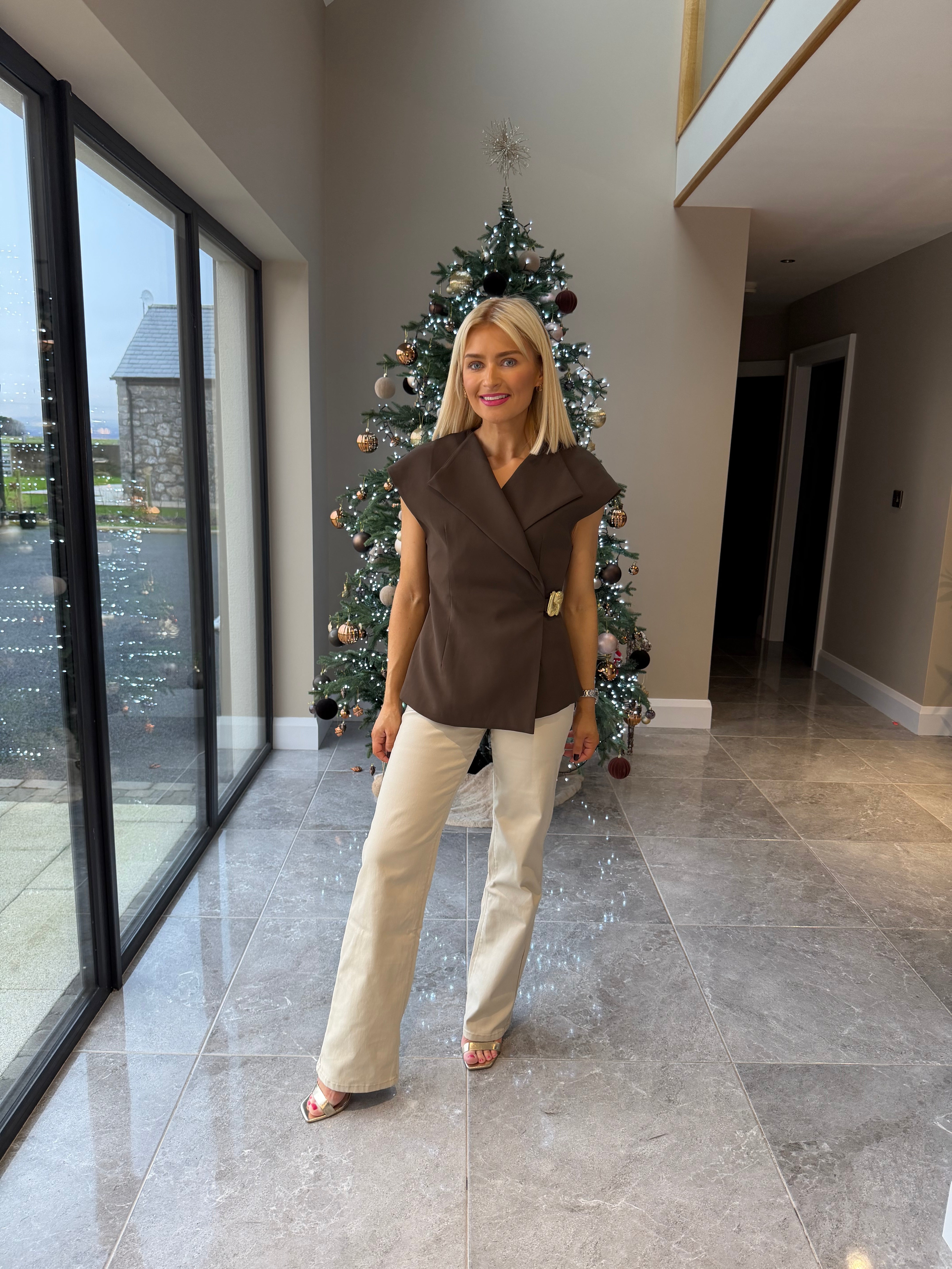 Sleeveless, blazer style top. Large gold button detailing at the side. Available in more colours.