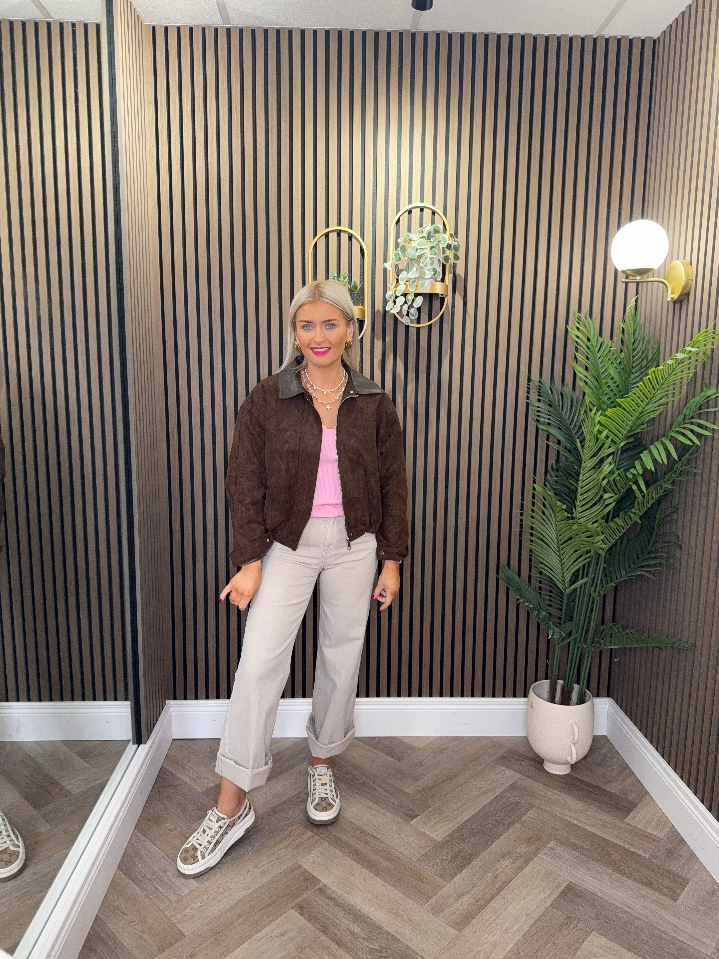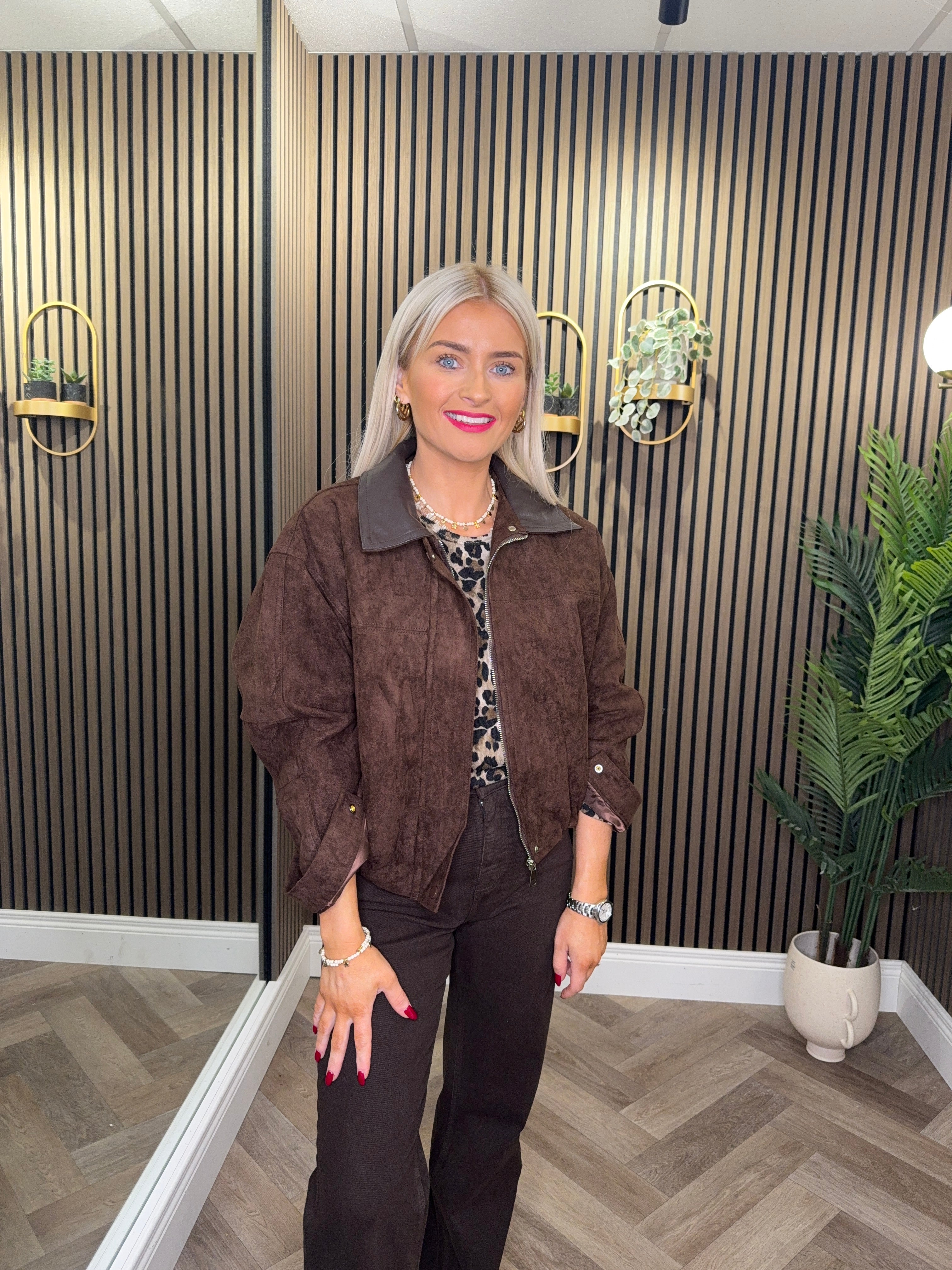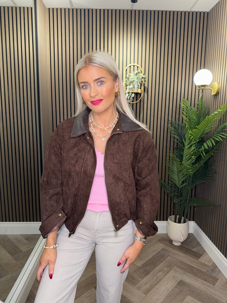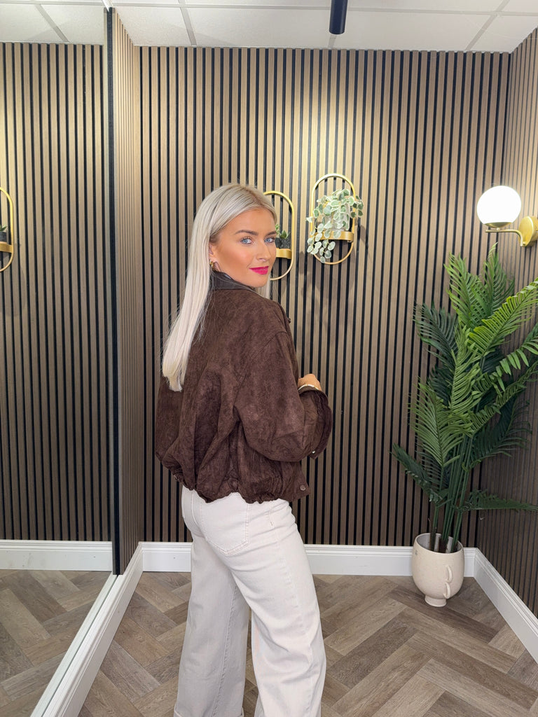 Long sleeve, boxy style bomber jacket. Gorgeous brown suede. Zip up with faux leather collar detailing.