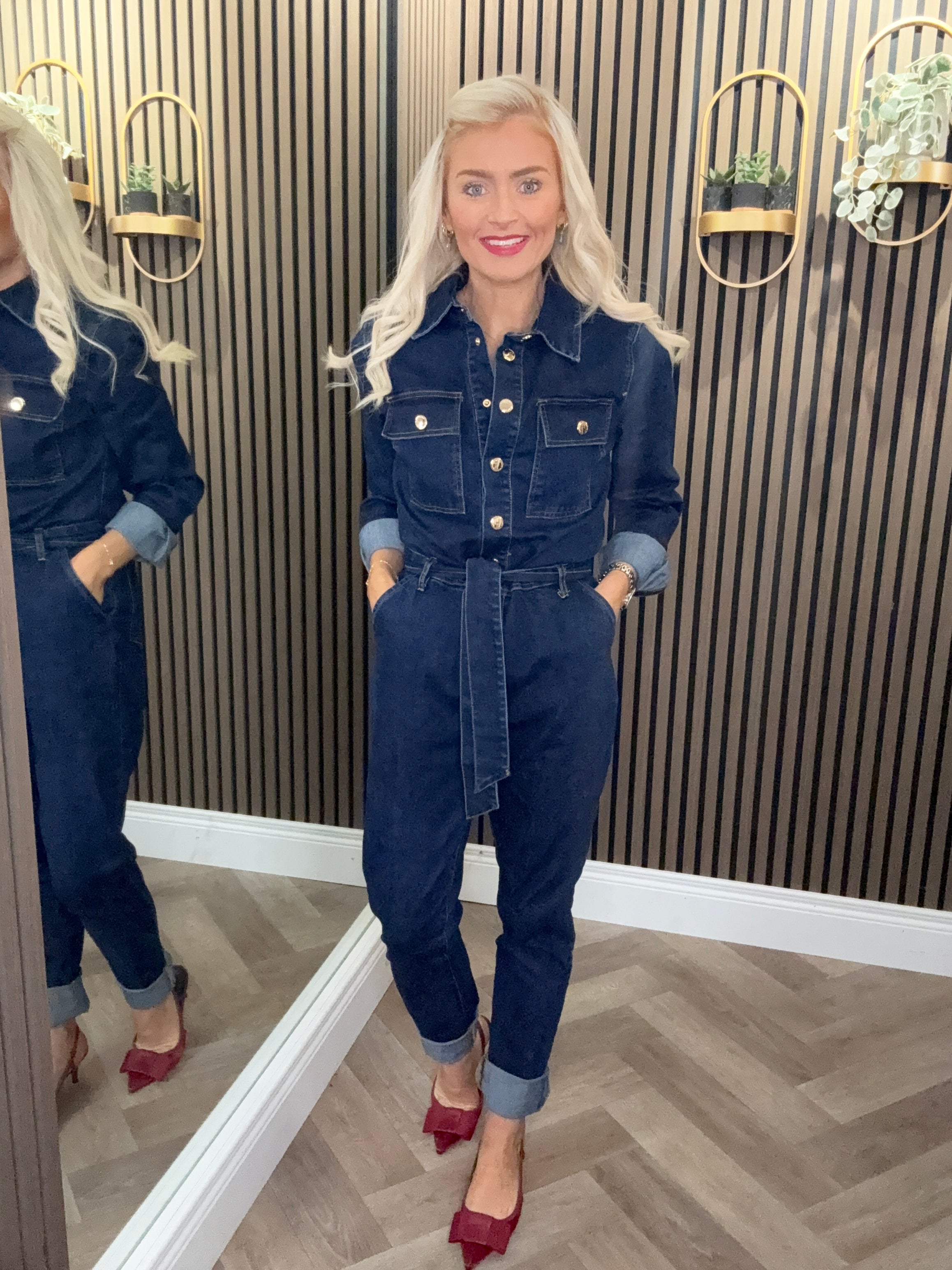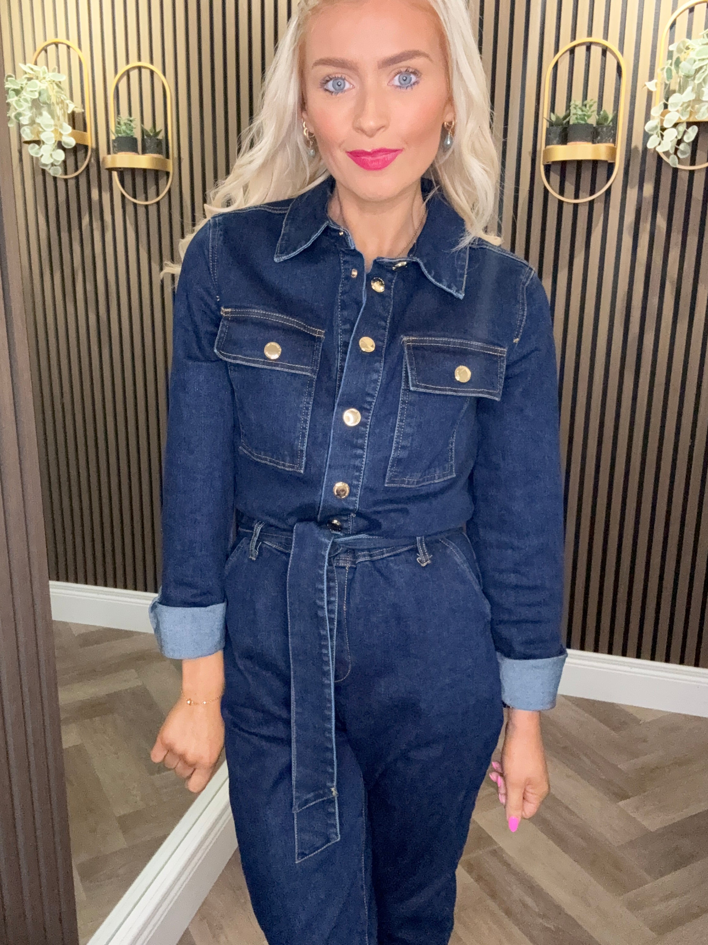 Long sleeve, slim leg, dark denim jumpsuit. Gold button detailing.