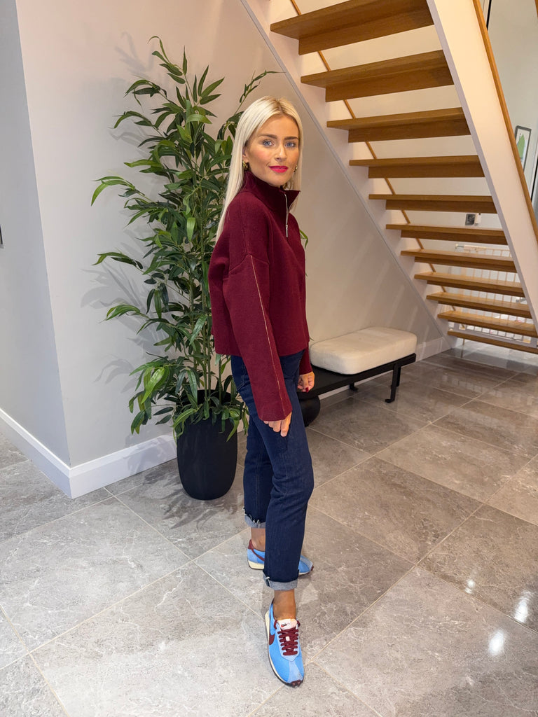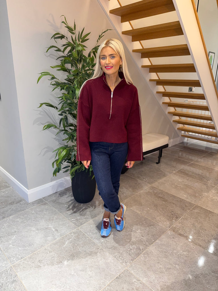 1/4 zip, long sleeve, boxy style knit jumper. Piping detailing down the sleeve. Available in more colours.