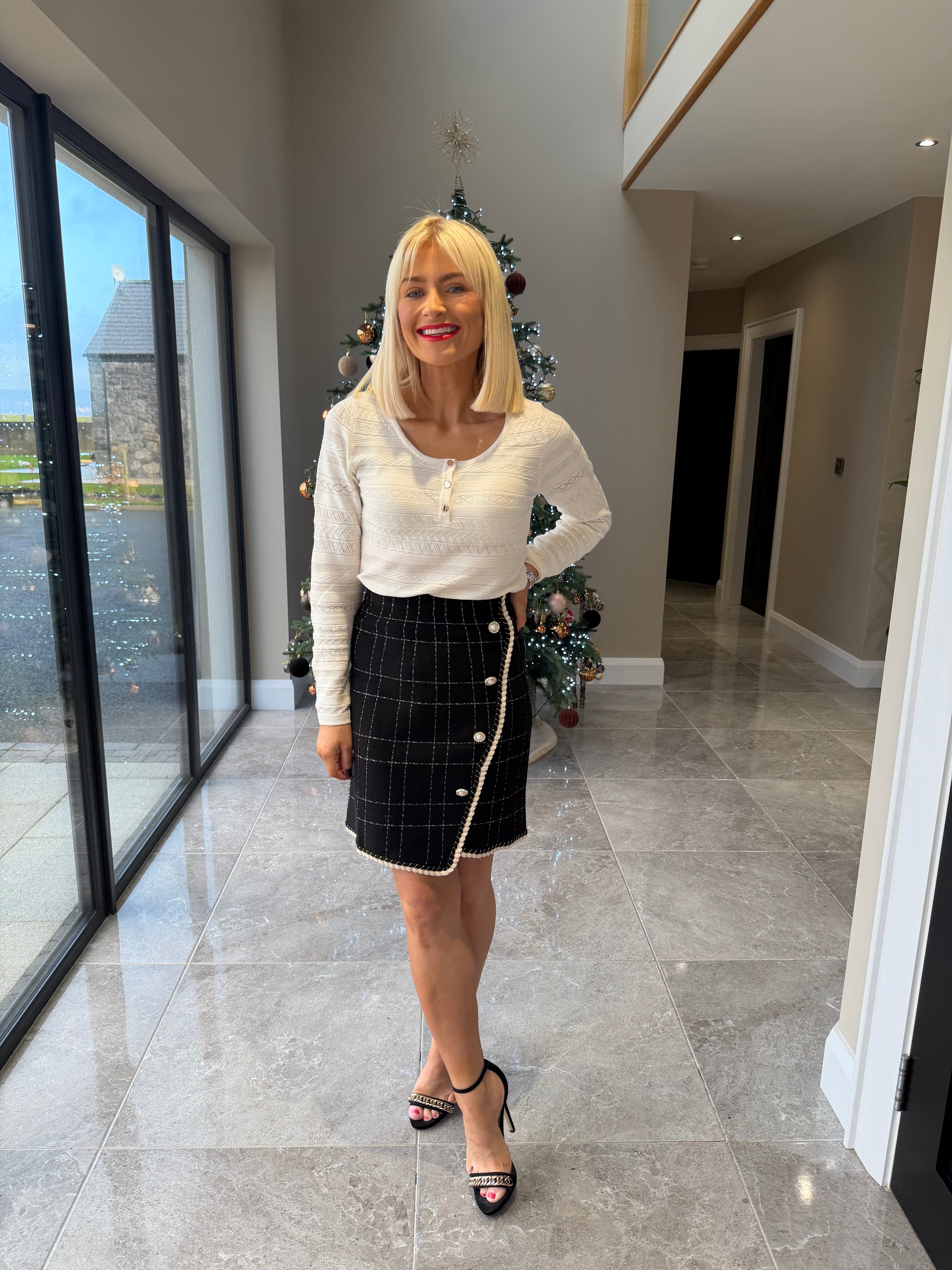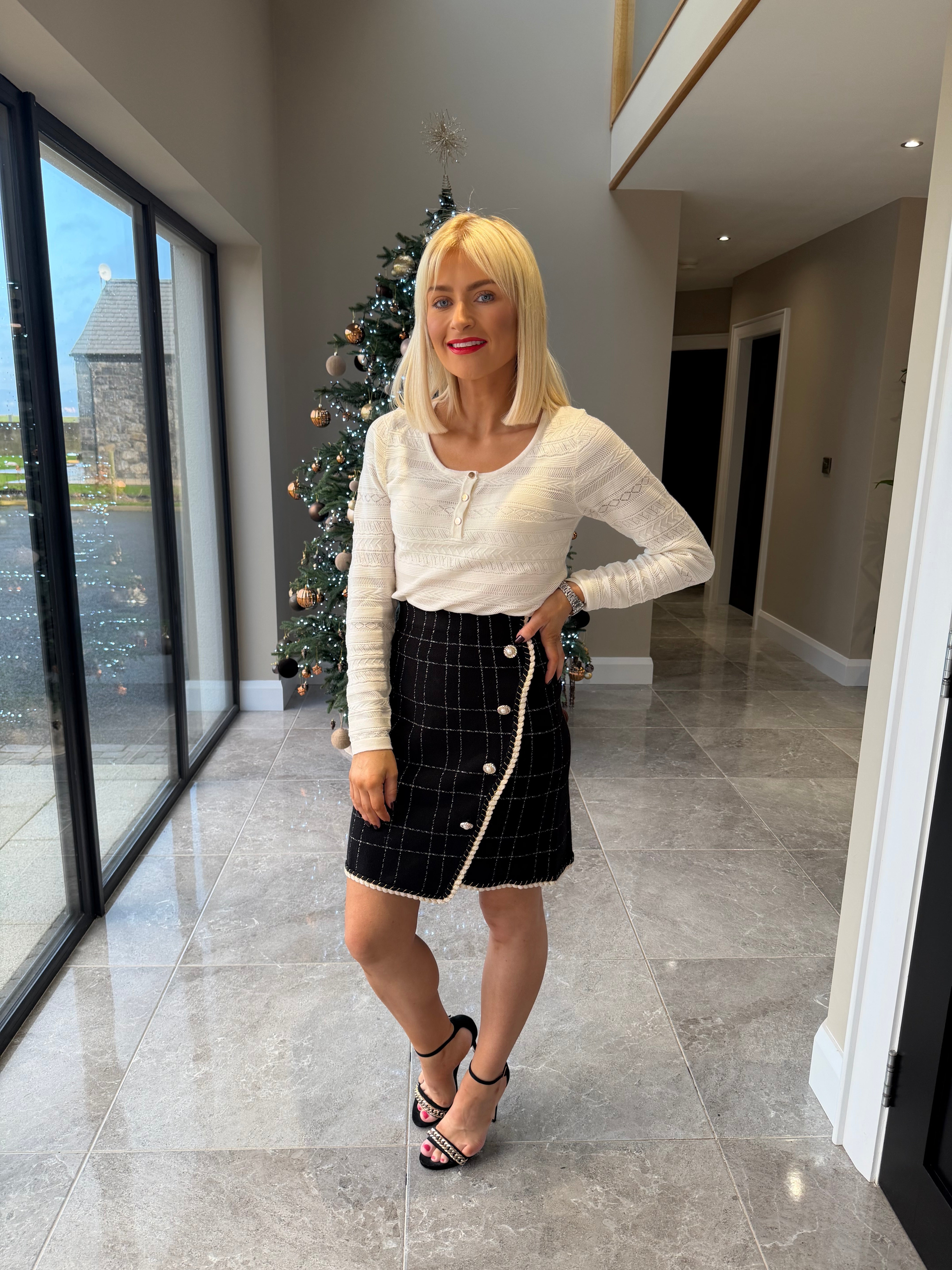 Long sleeve, round neckline, fine knit jumper. Gold small button detailing. Available in more colours.