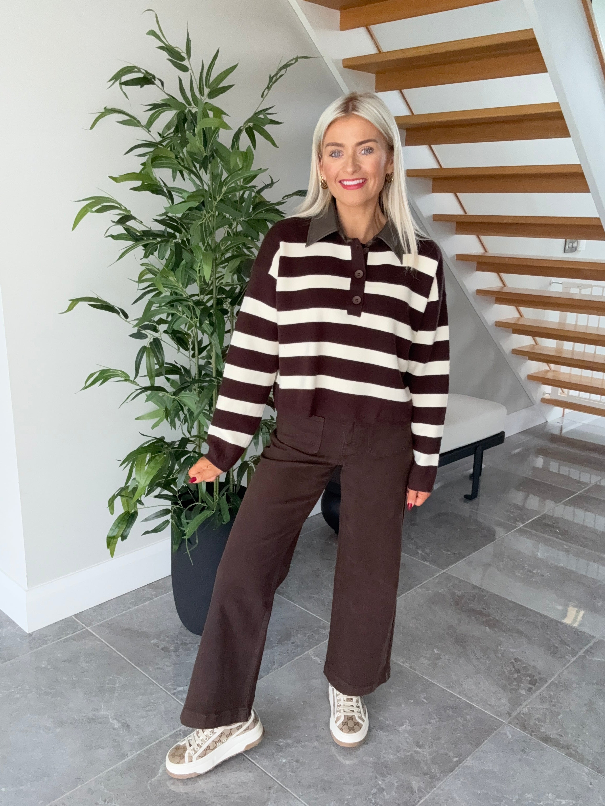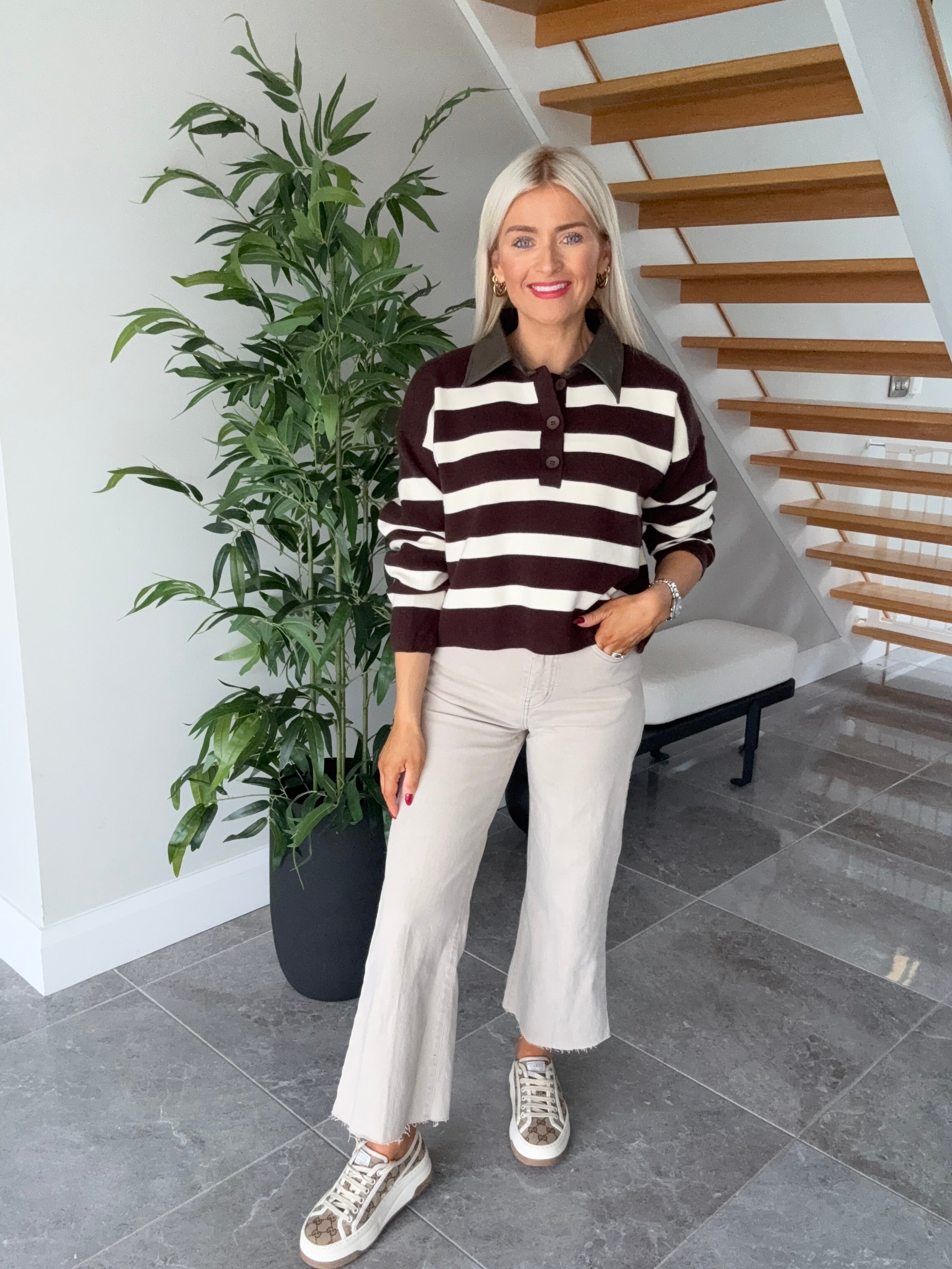 Boxy style, knit style jumper. Faux leather collar with a stripe print. Long sleeve. Available in more colours.
