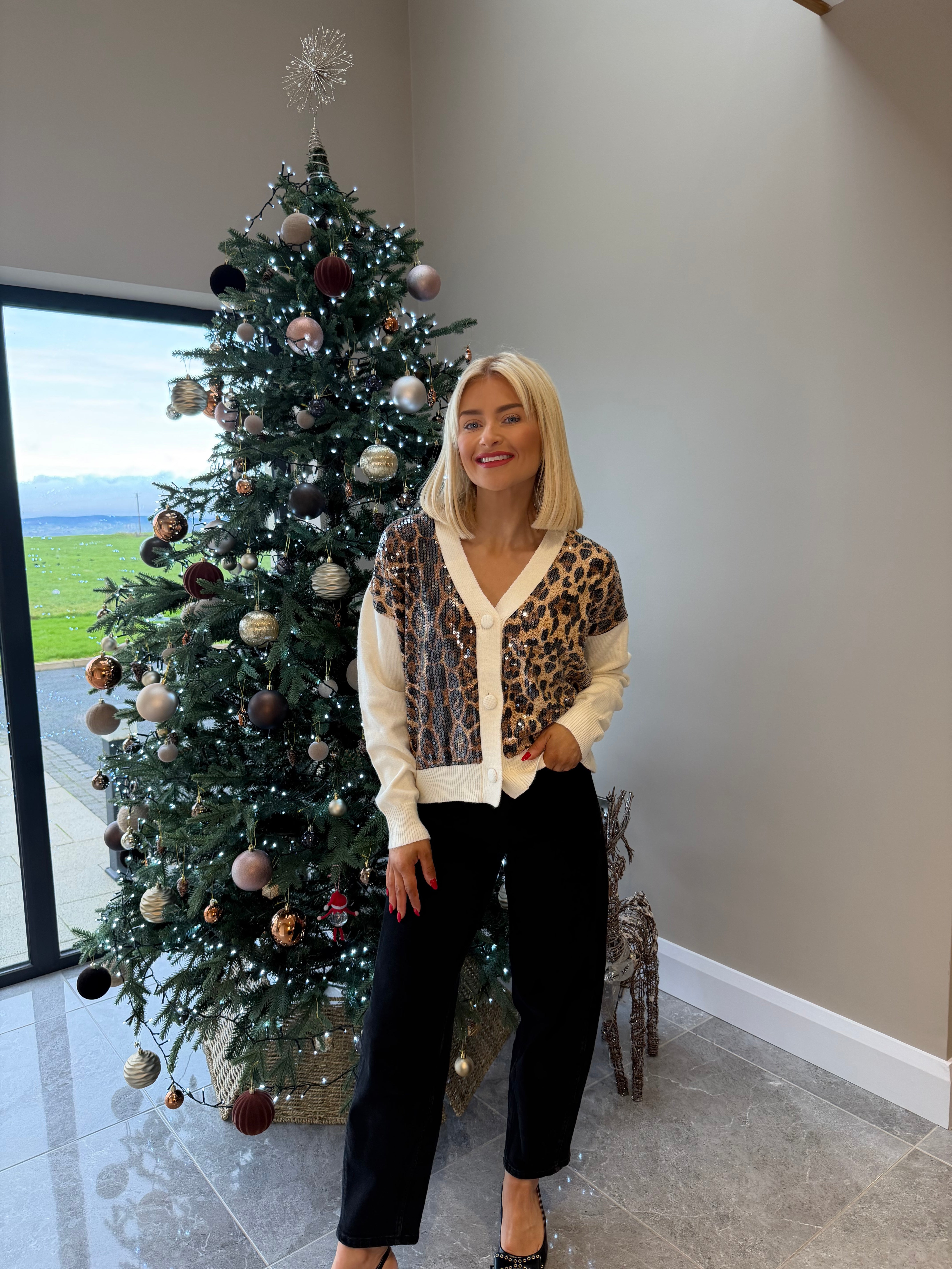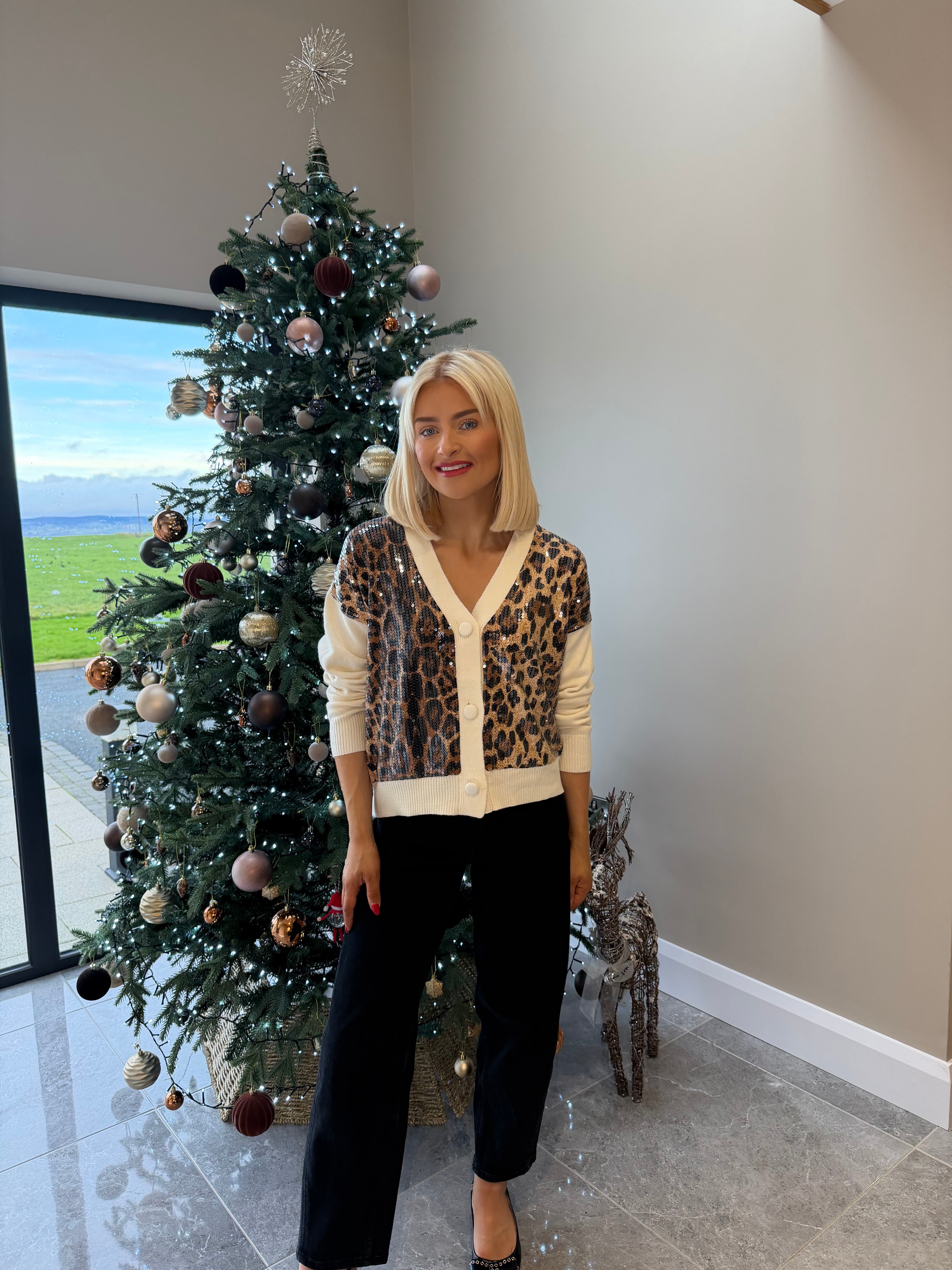 Long sleeve, cream and leopard print cardigan. Sequin detailing. V neckline.