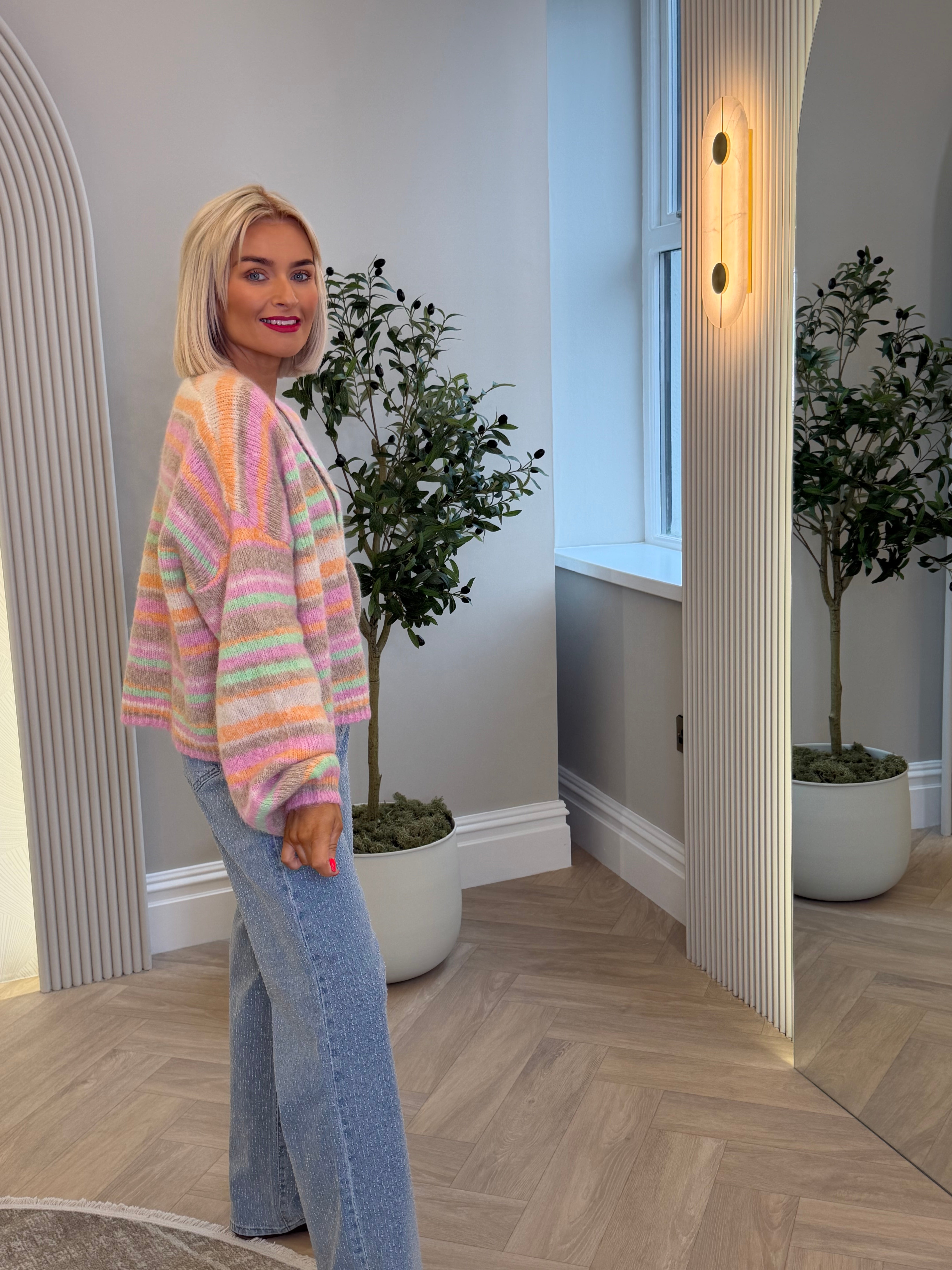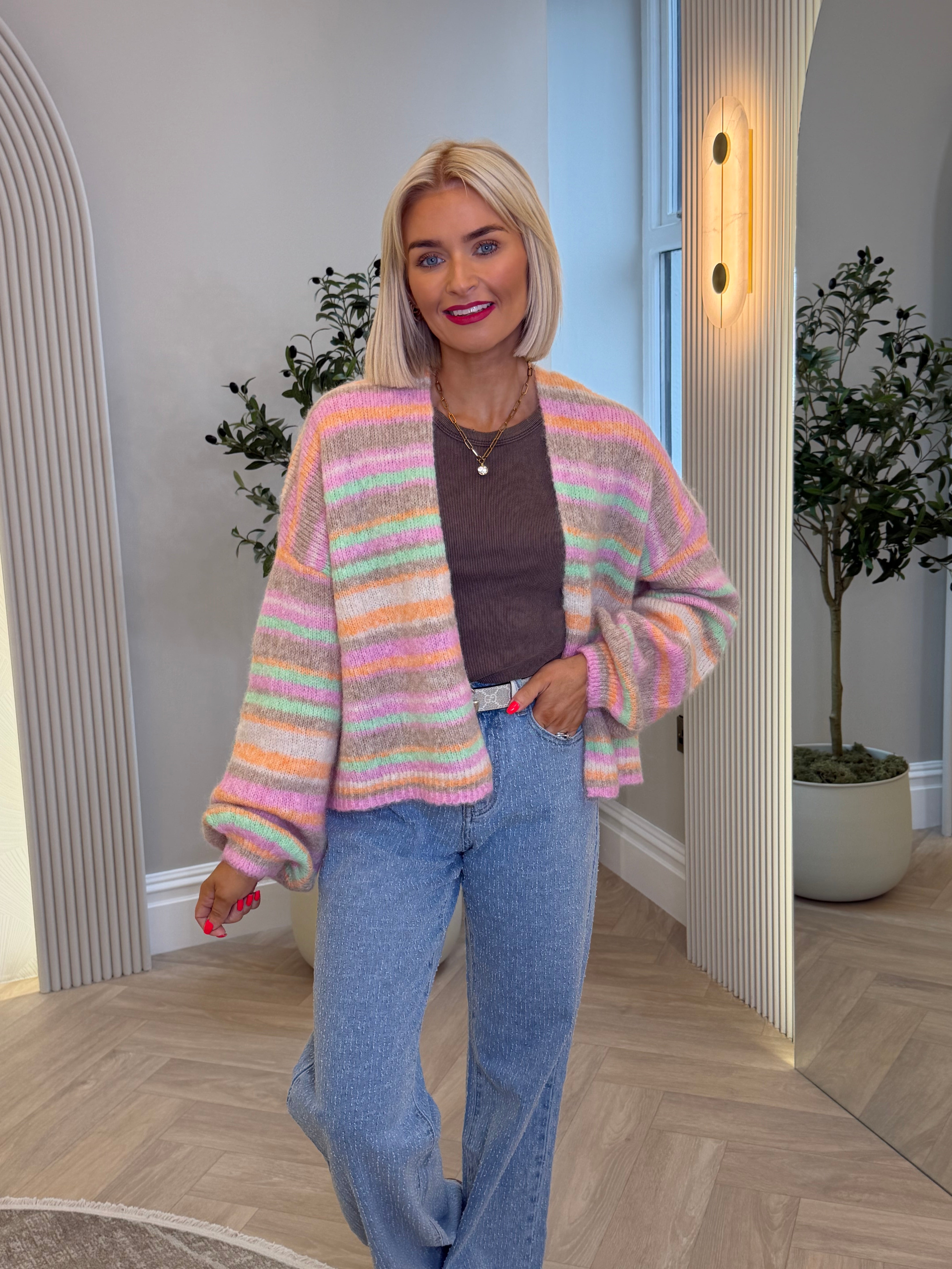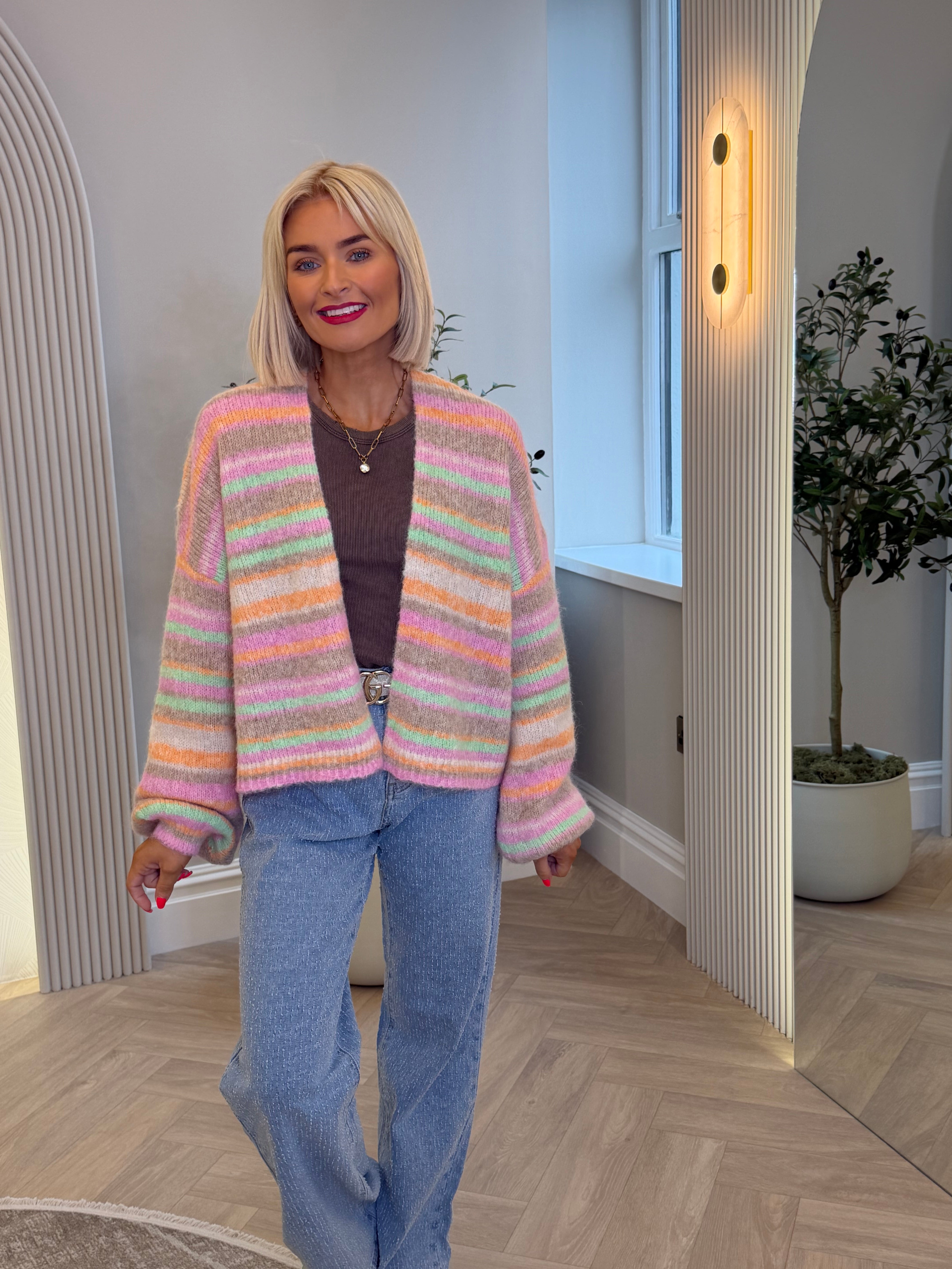 Long balloon style sleeve cardigan. Stripe knit with a relaxed fit.