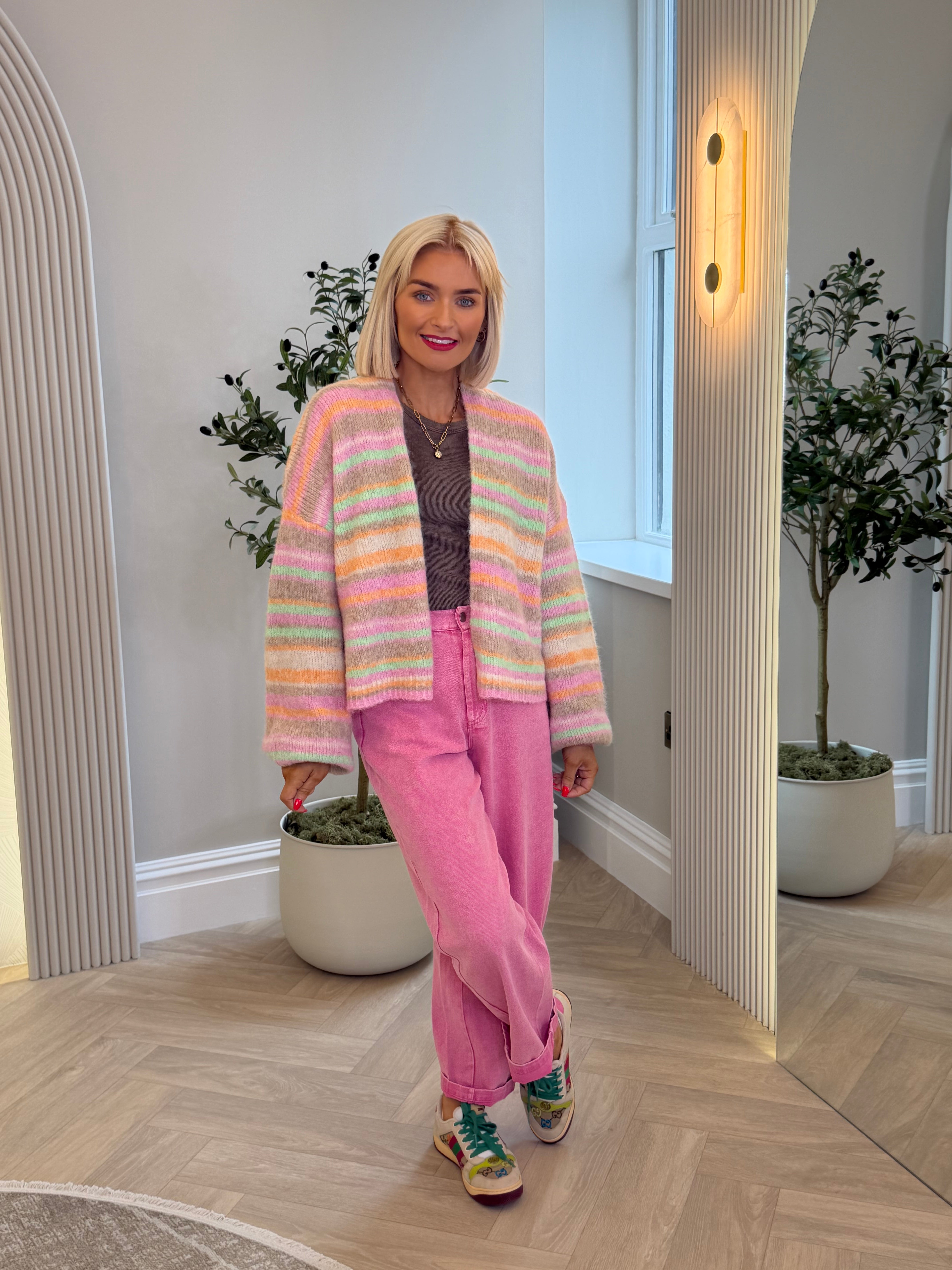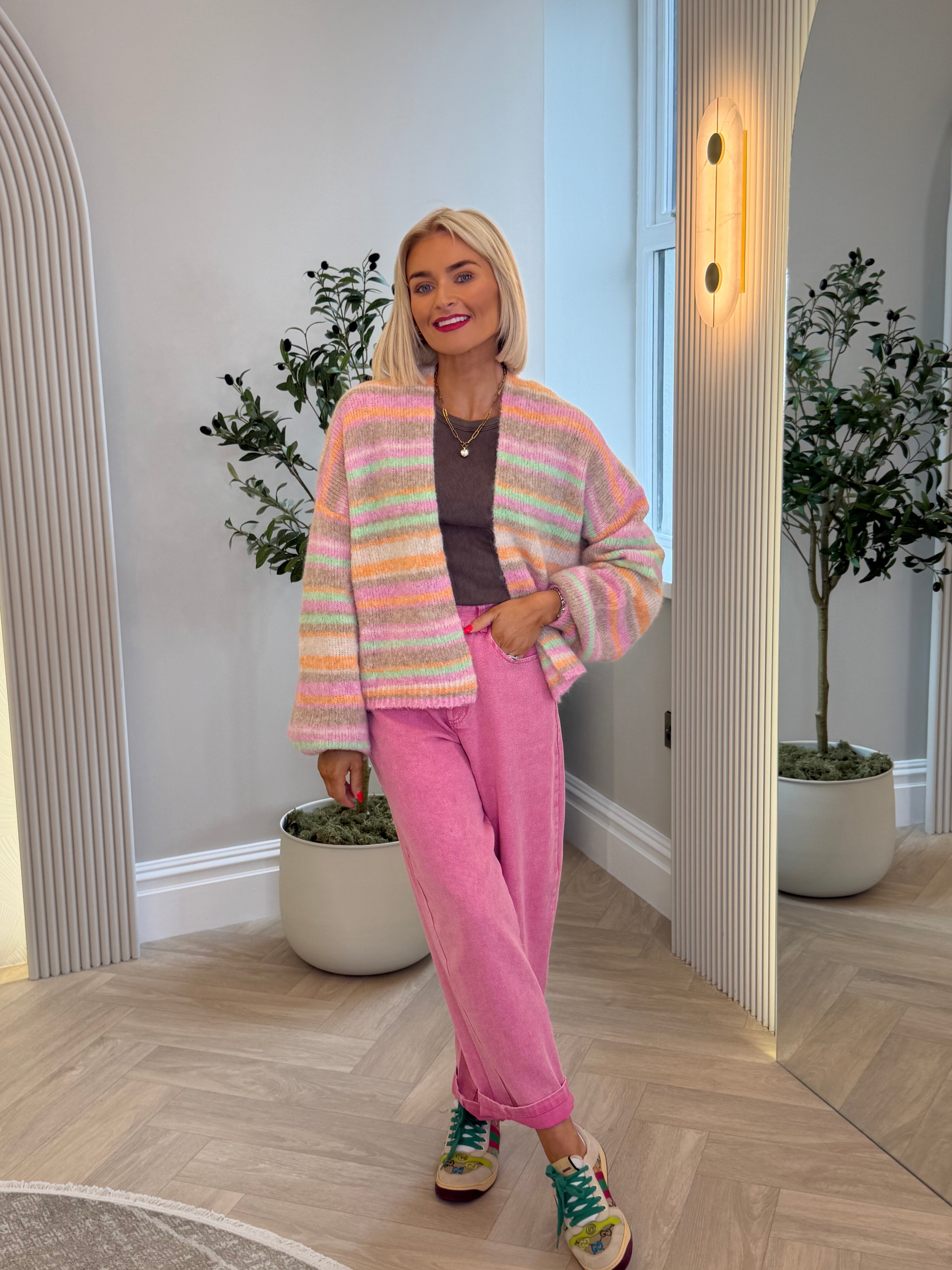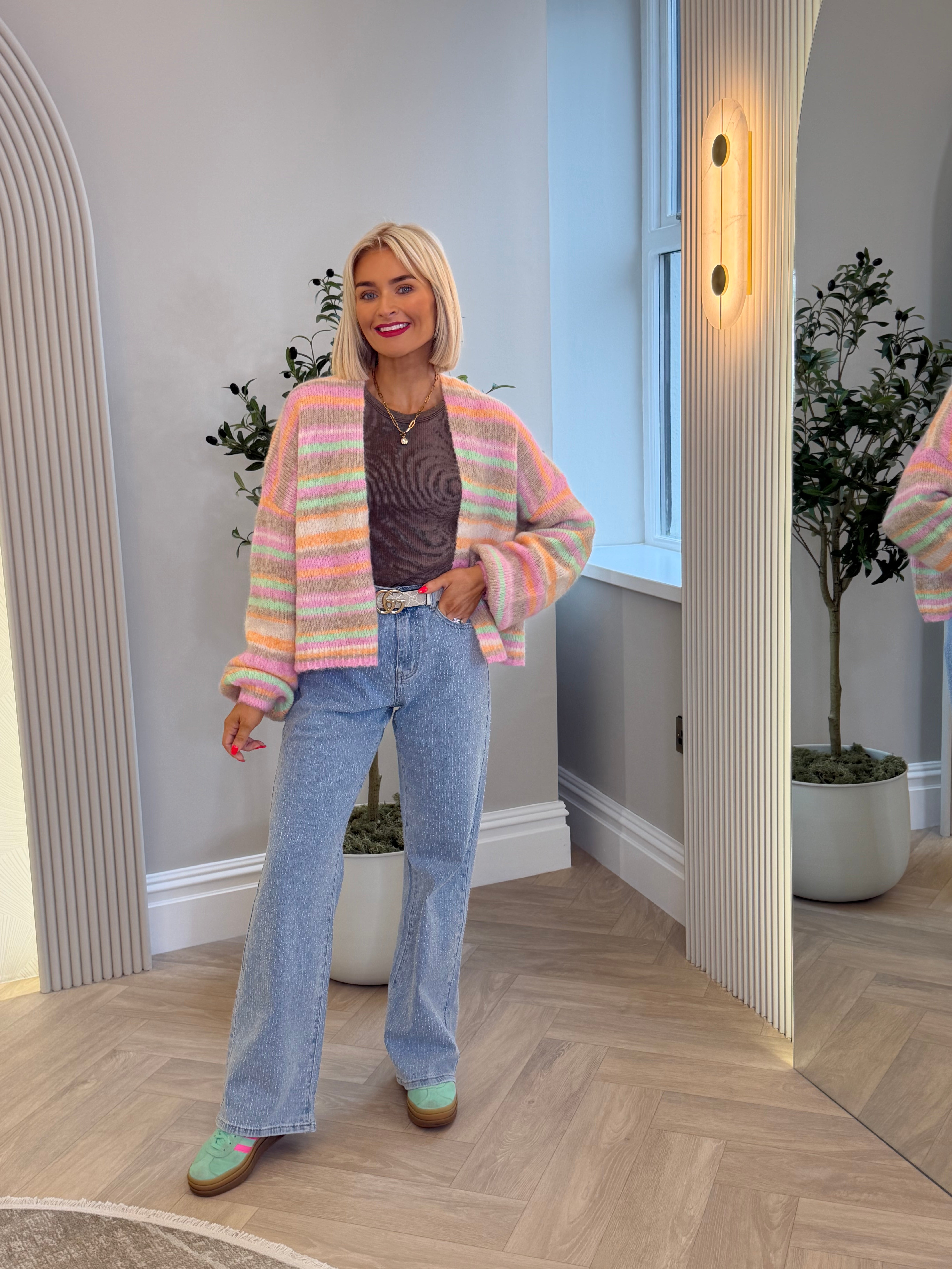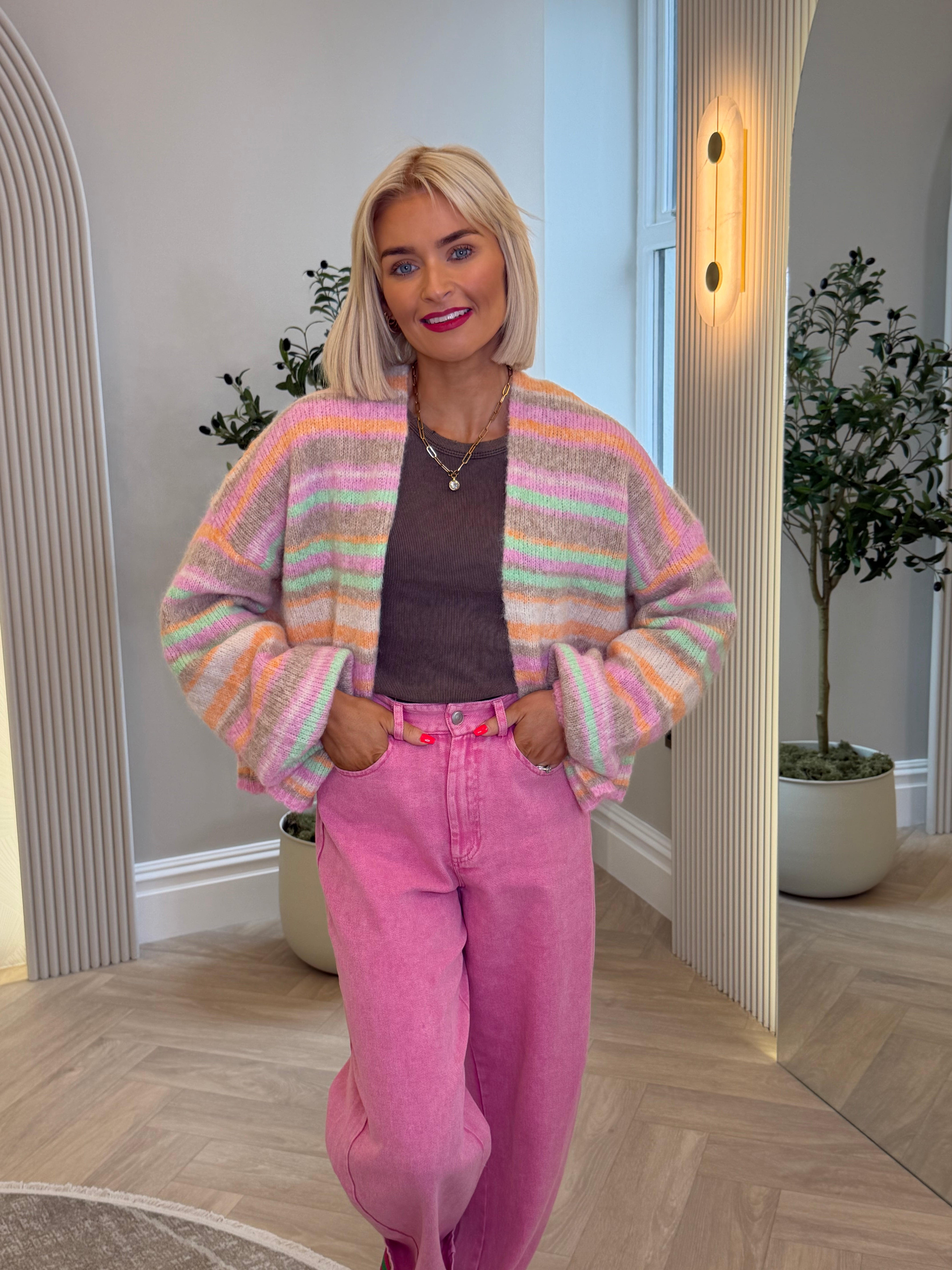 Long balloon style sleeve cardigan. Stripe knit with a relaxed fit.