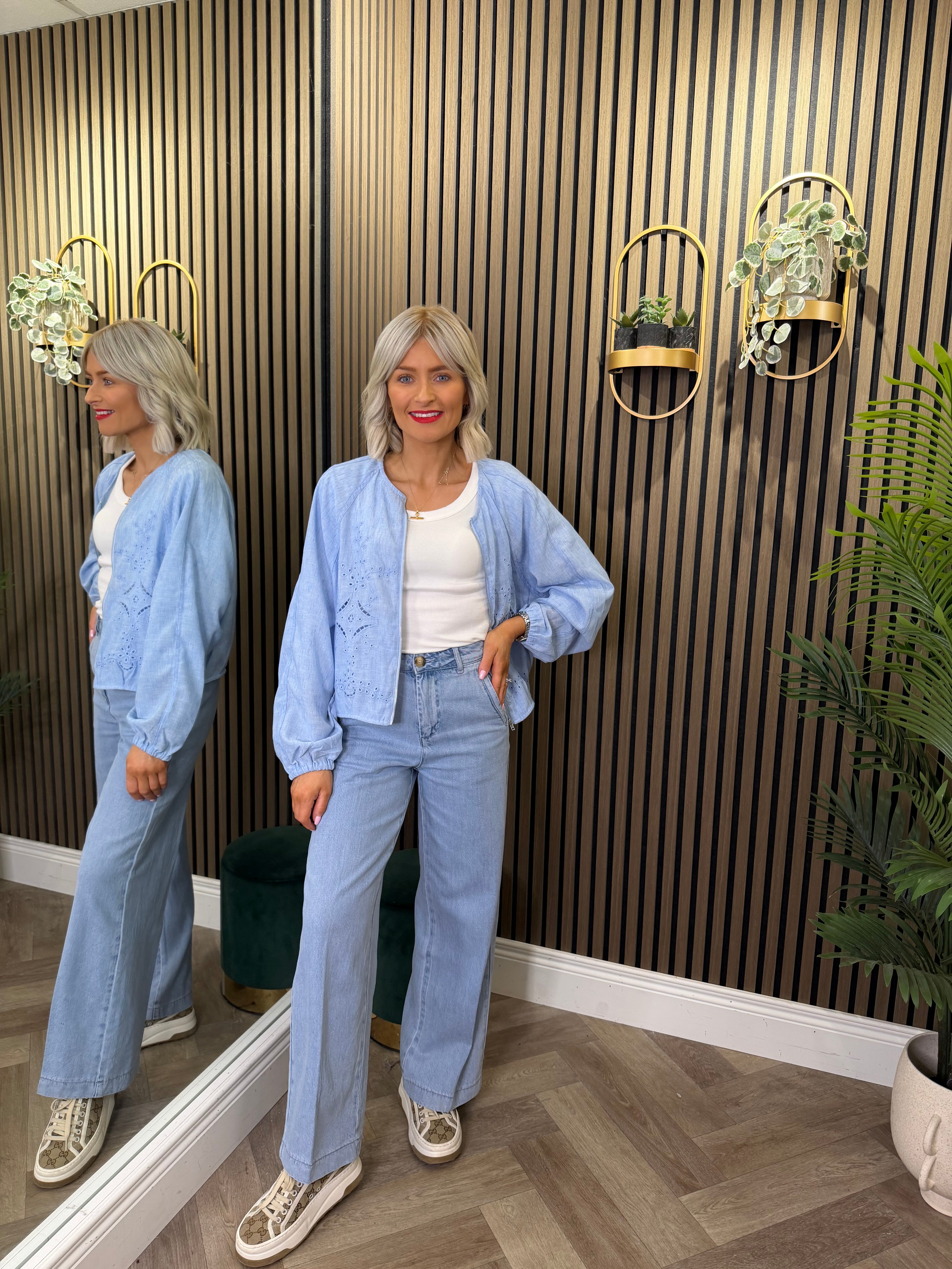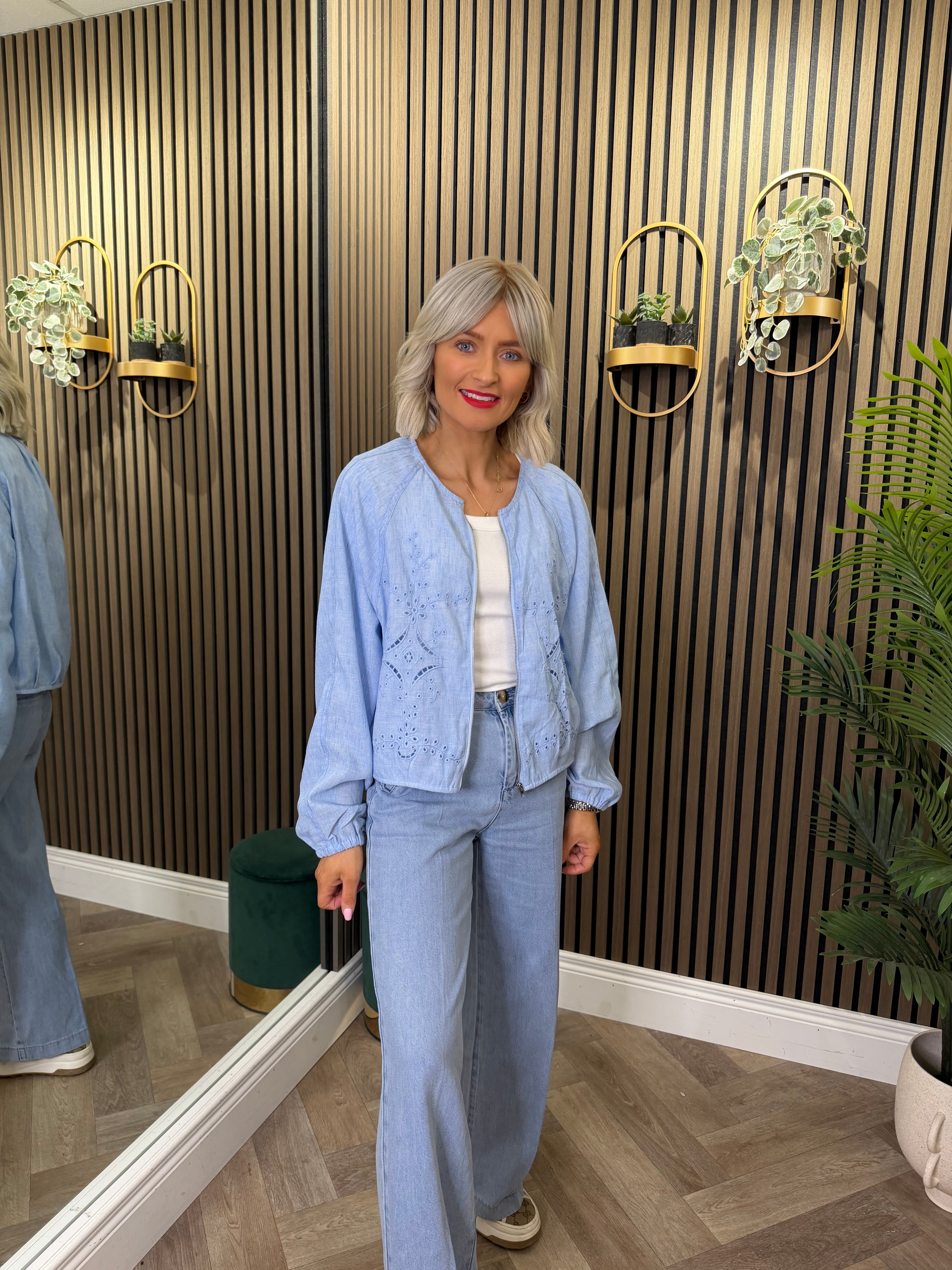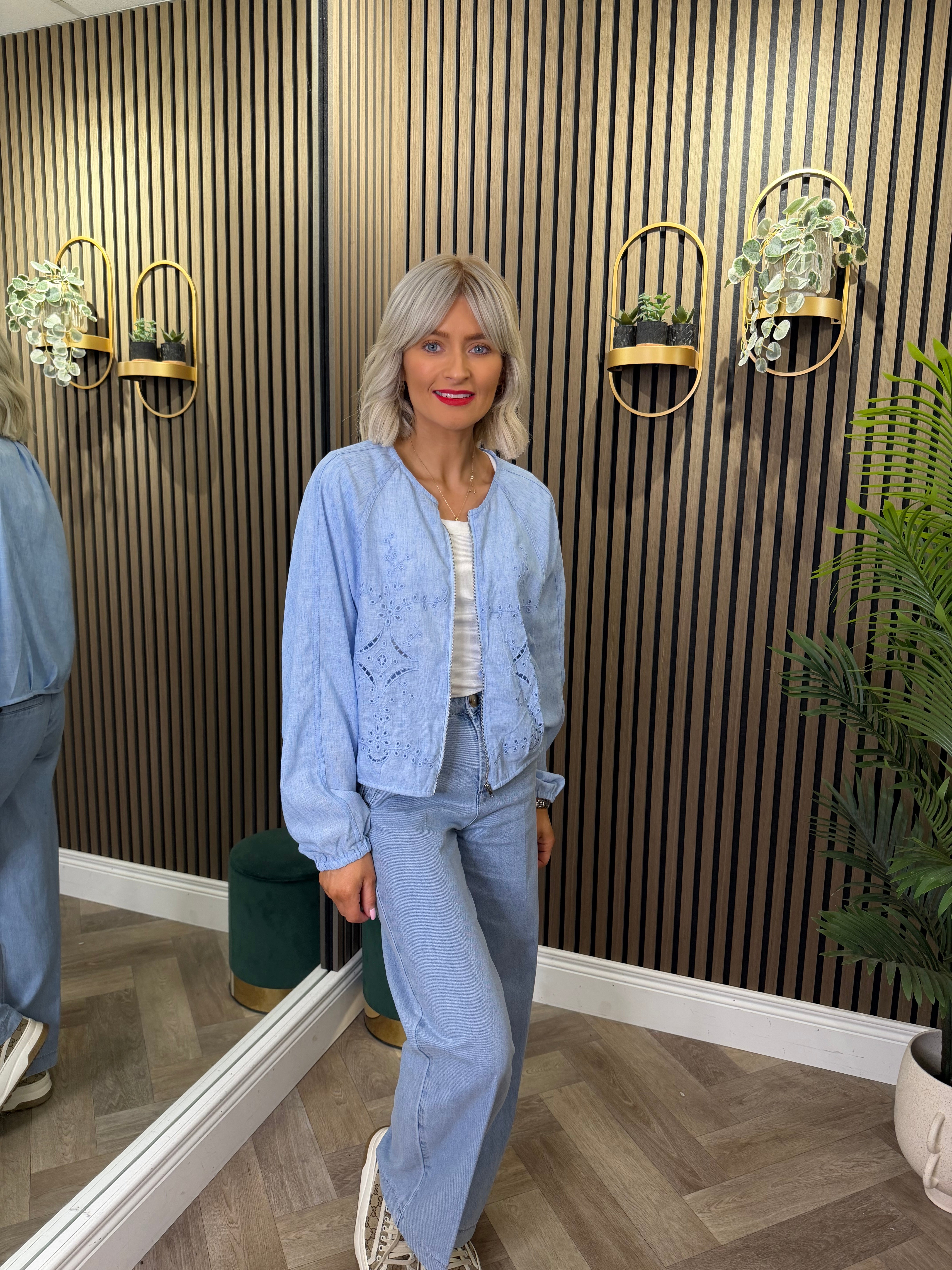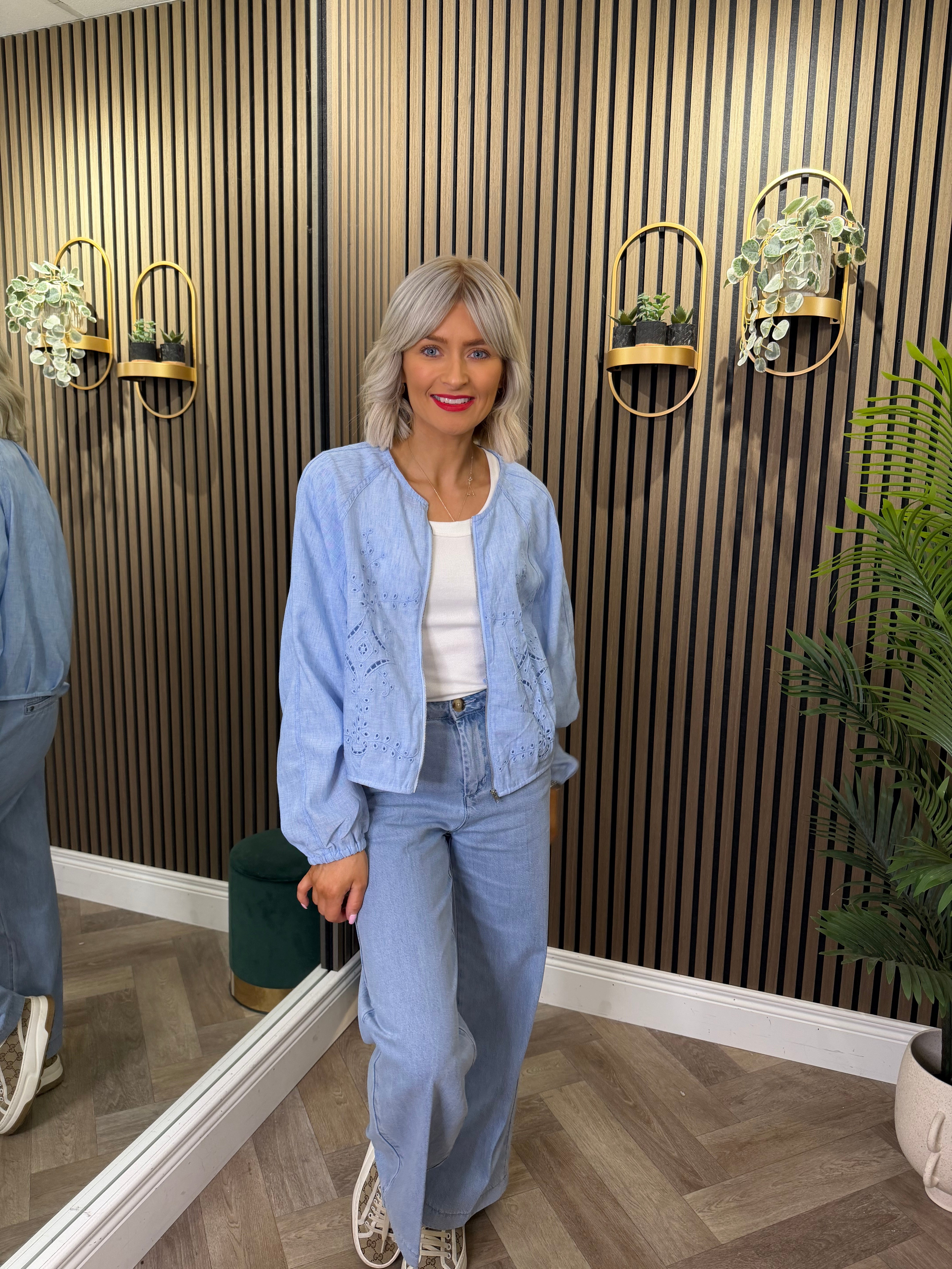 Long sleeve, lightweight, linen style jacket. Baby blue shade with zip up detailing.