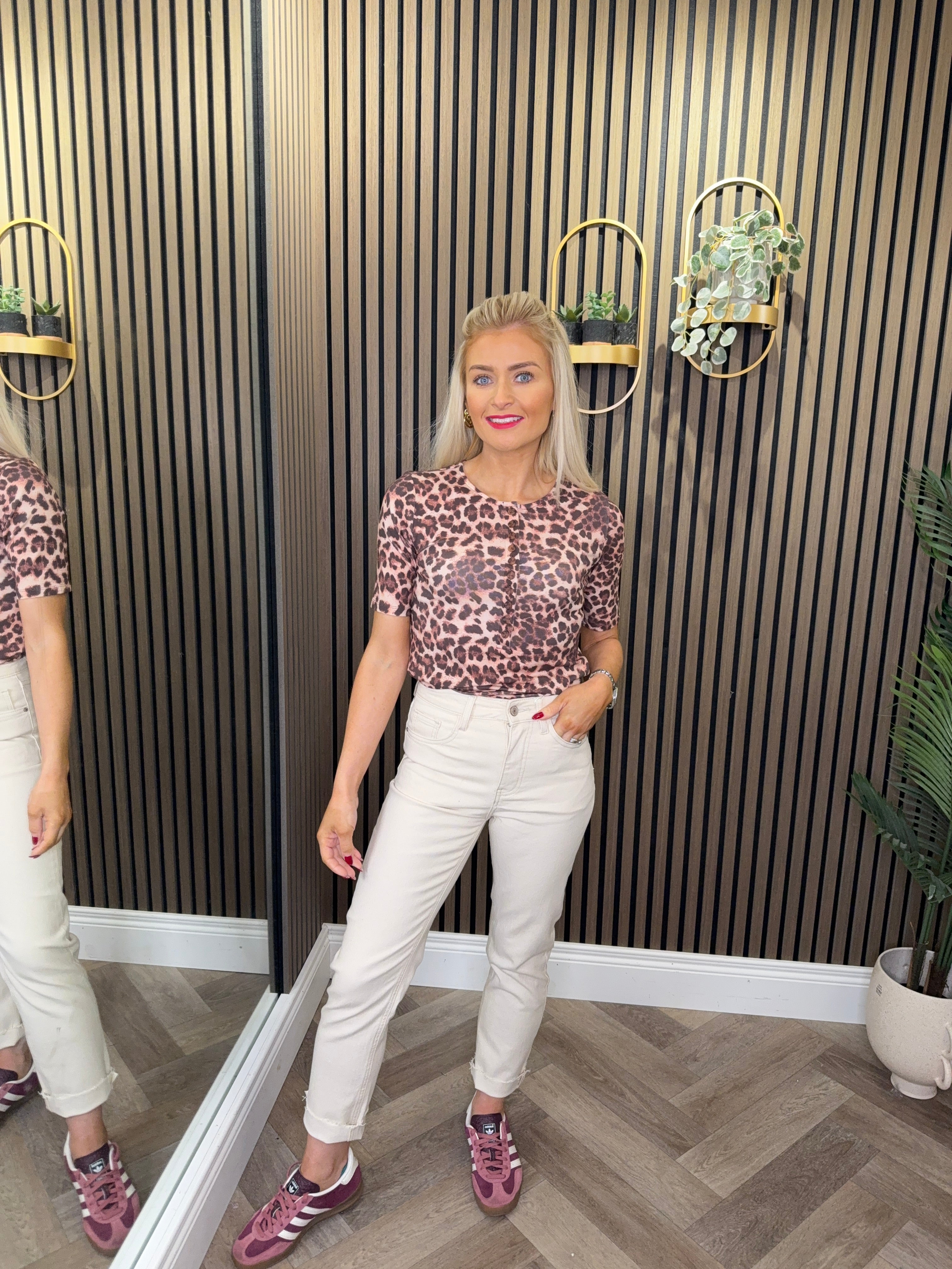 Short sleeve, round neckline with button detailing leopard print t-shirt.