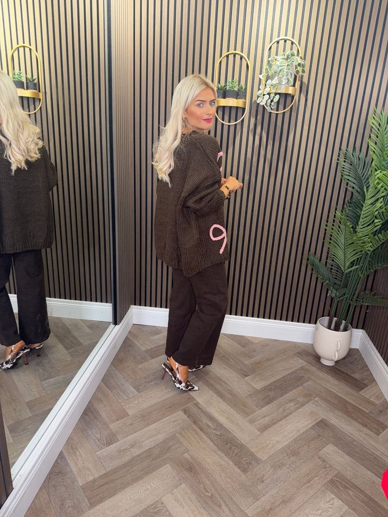 Long sleeve, round neckline, oversized/relaxed fit chunky knit jumper. Gorgeous baby pink knit bow detailing.