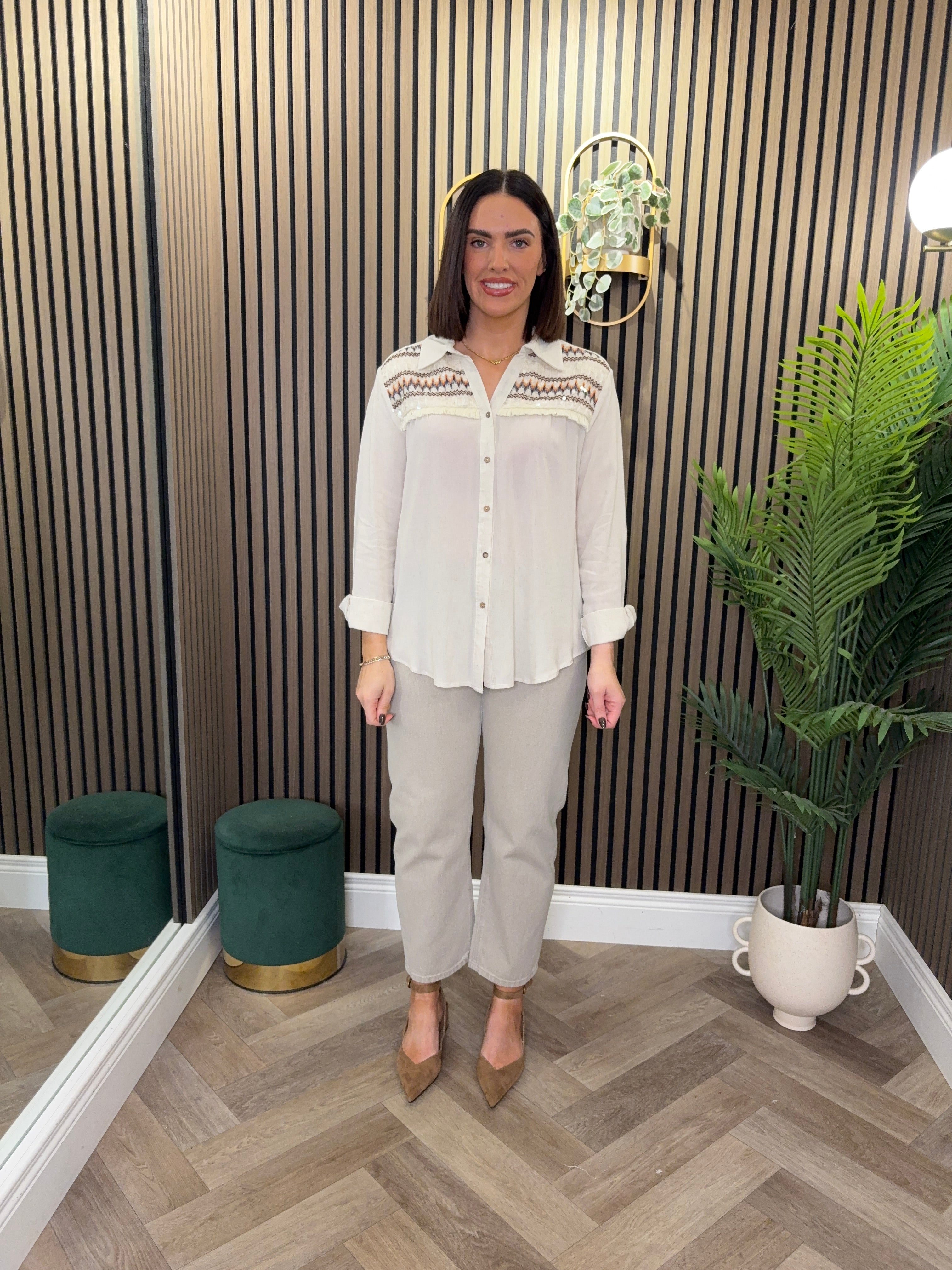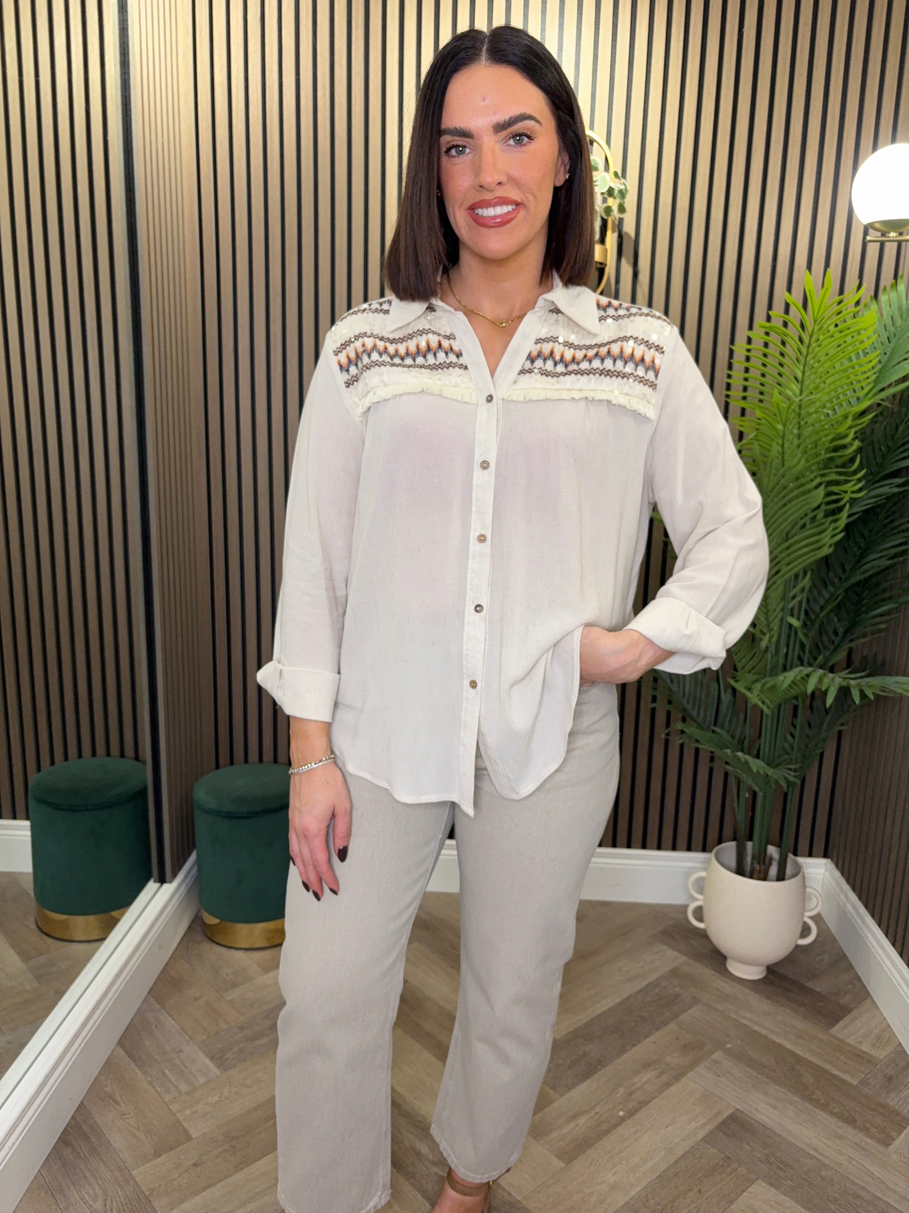 Long sleeve, linen style, button up shirt. Sequin and fray detailing at the top. Lightweight.