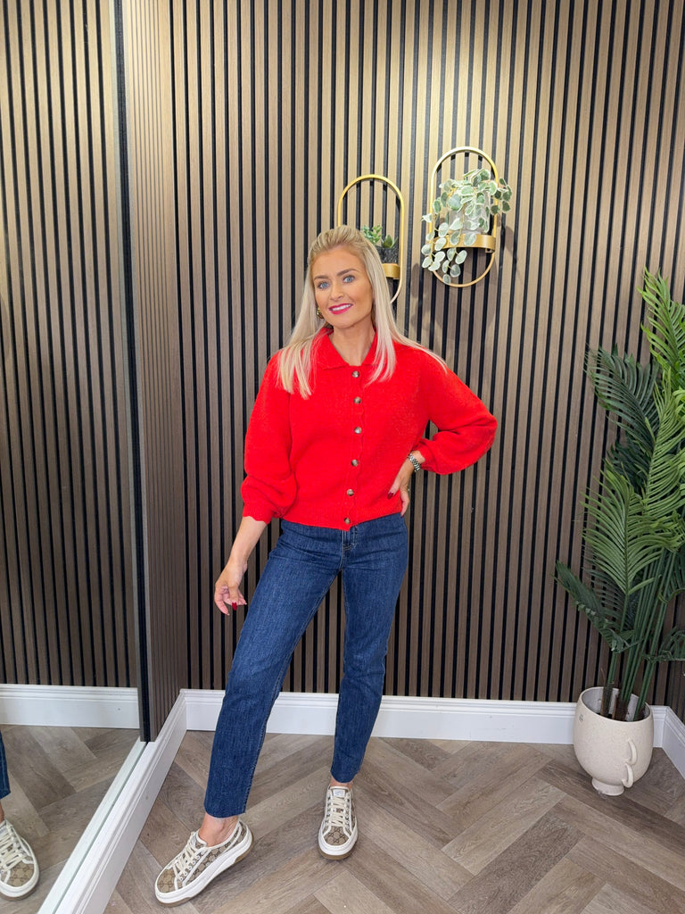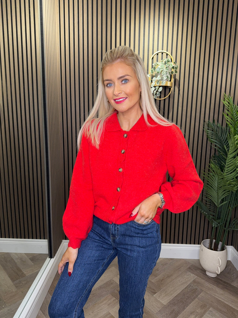Long sleeve, collar detailing, knit red cardigan. Button up.