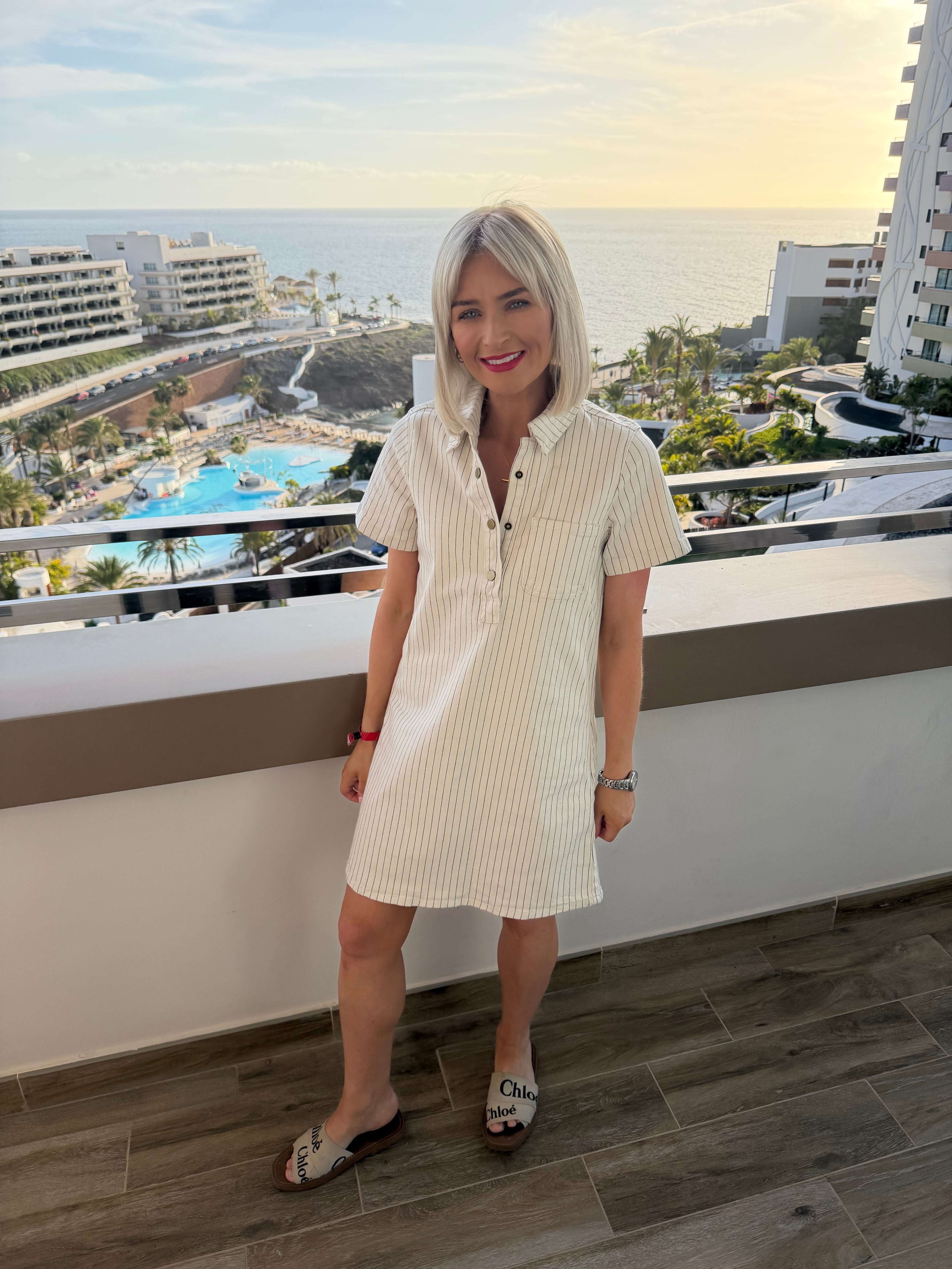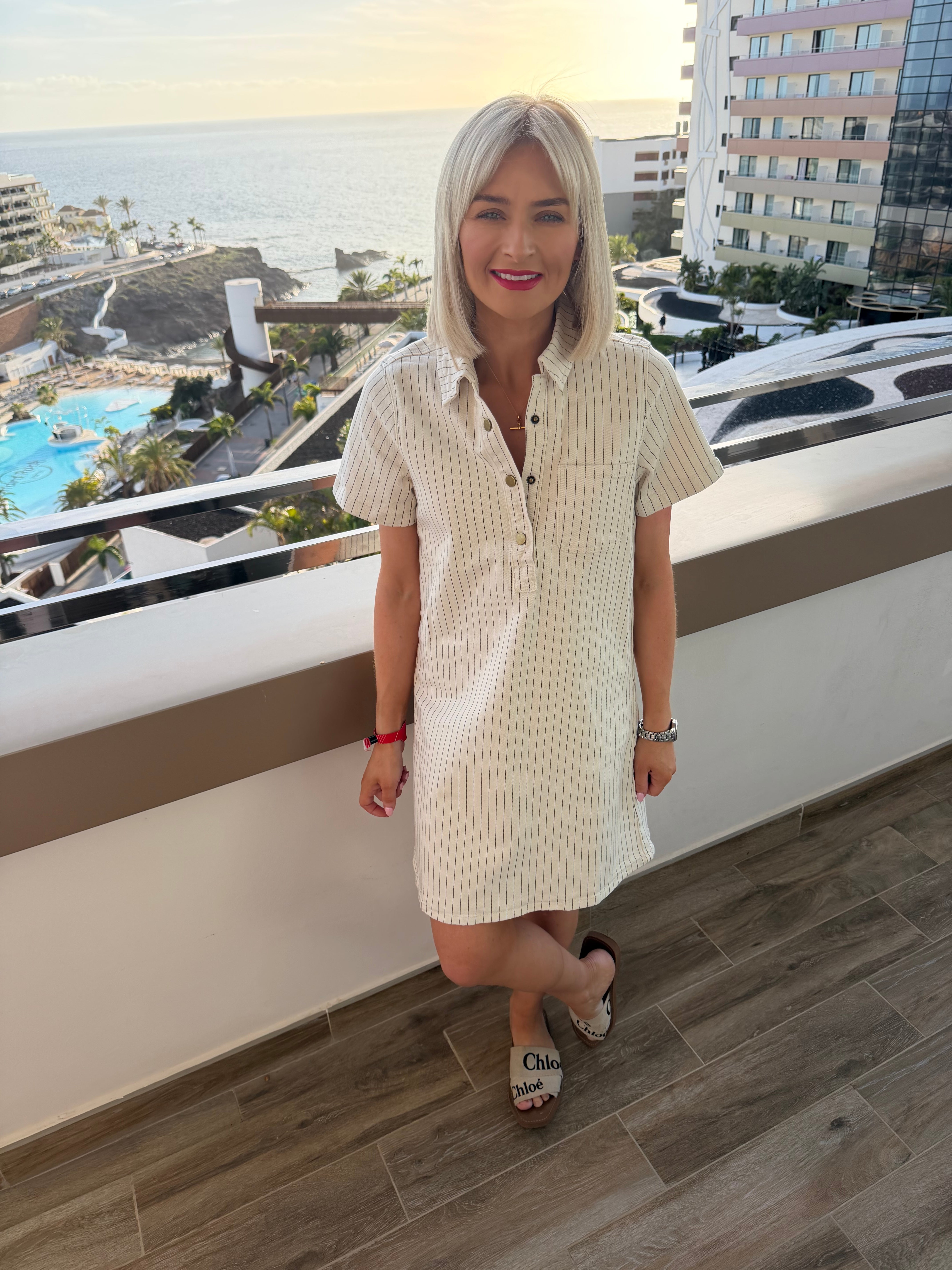 This is a fab cream denim dress with a fine pinstripe. Above knee length, short sleeves.