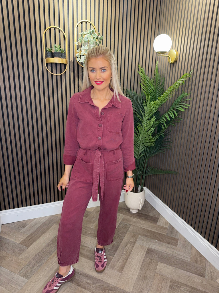 Long sleeve, lightweight denim jumpsuit. Button up with belt detailing. Front square pockets. Available in more colours.