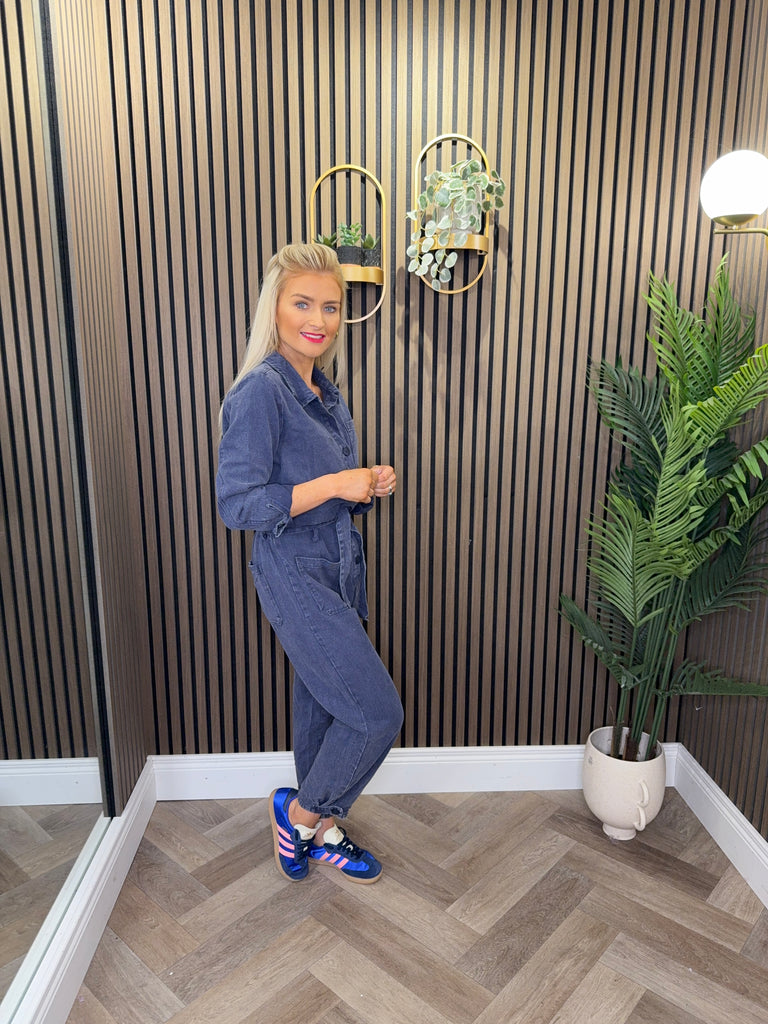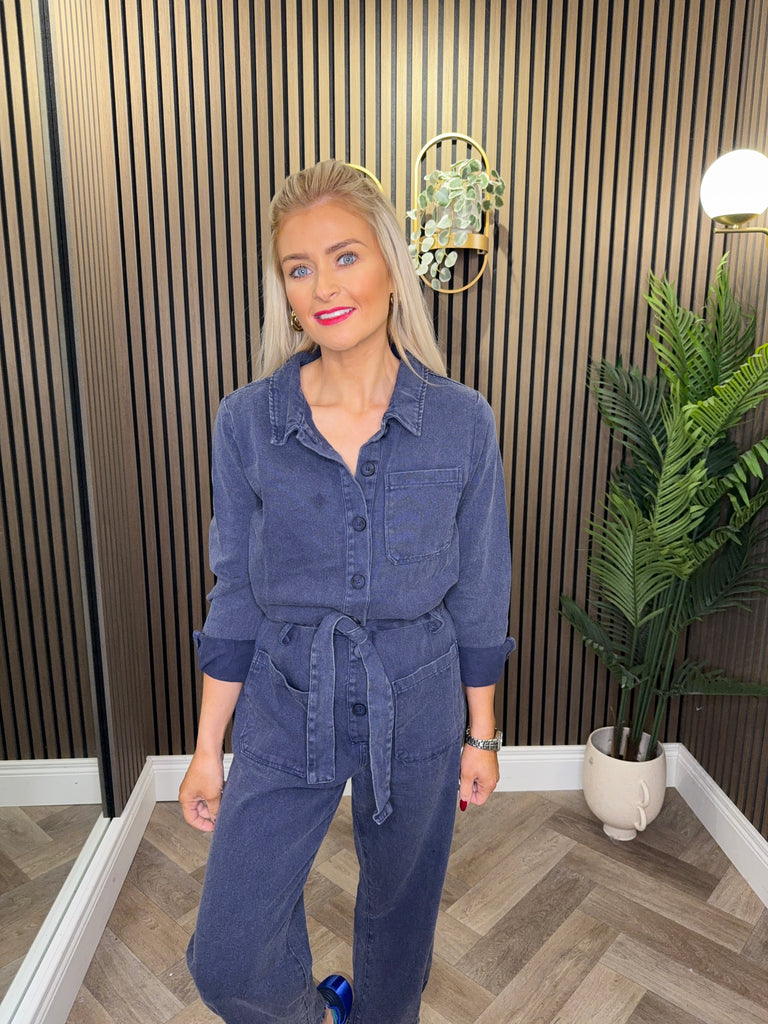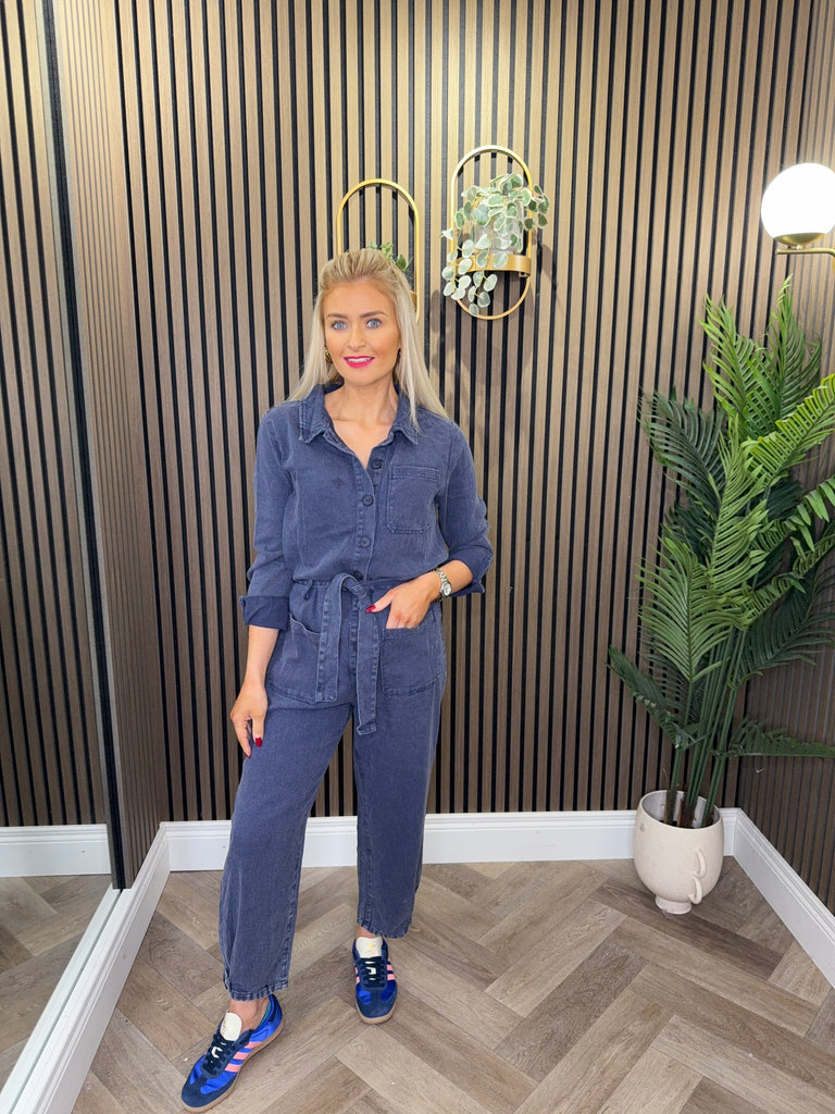 Long sleeve, lightweight denim jumpsuit. Button up with belt detailing. Front square pockets. Available in more colours.