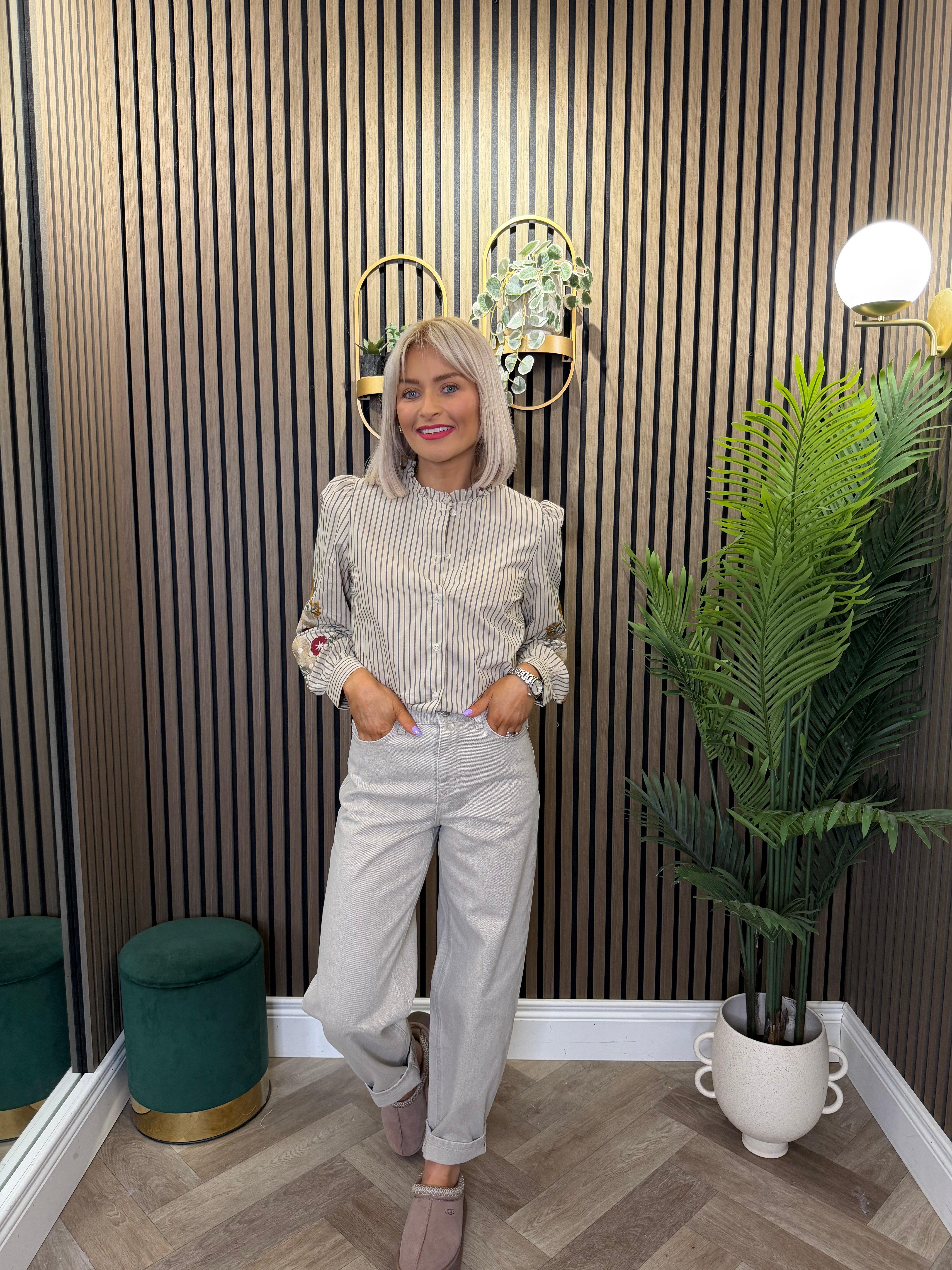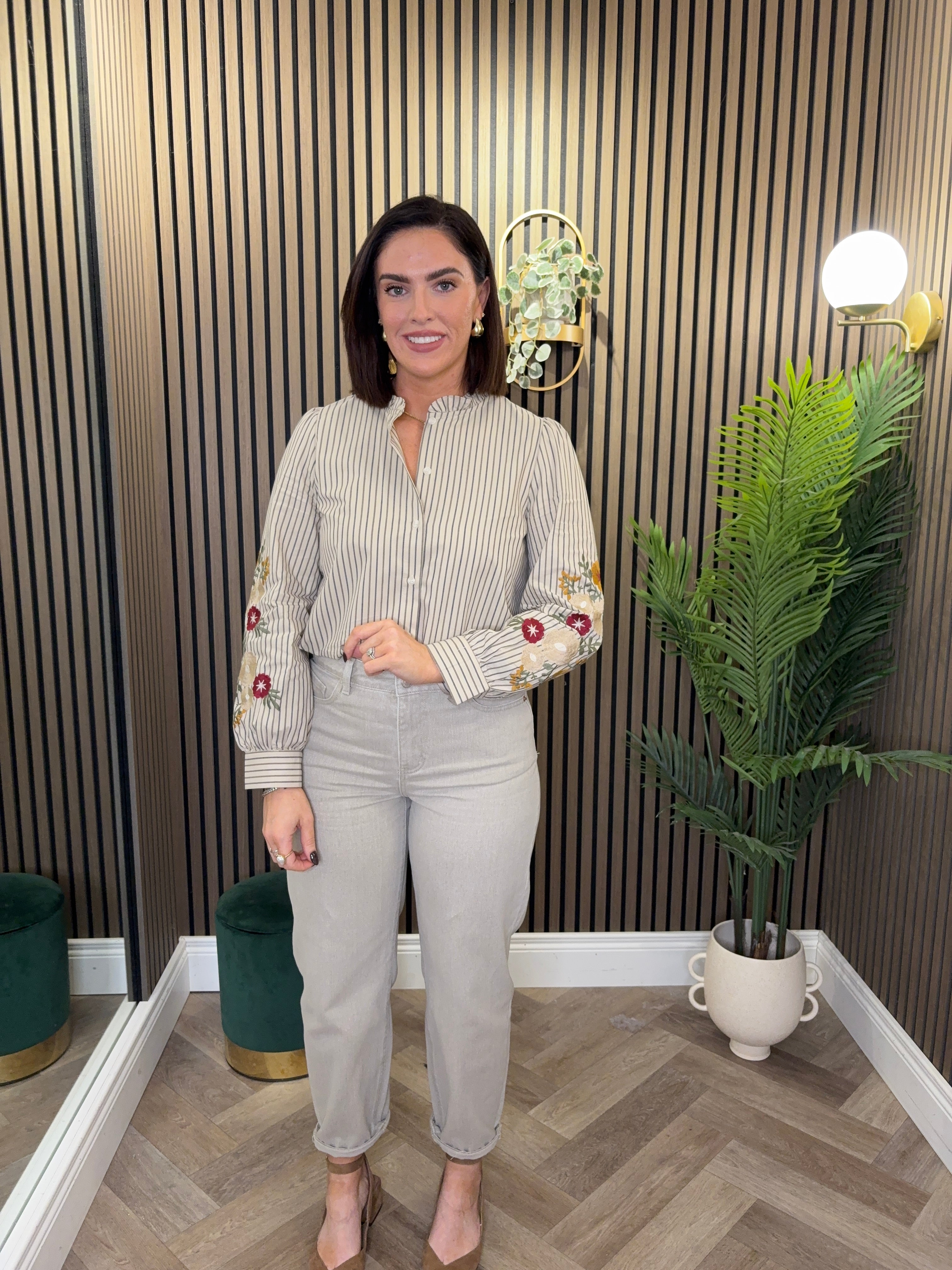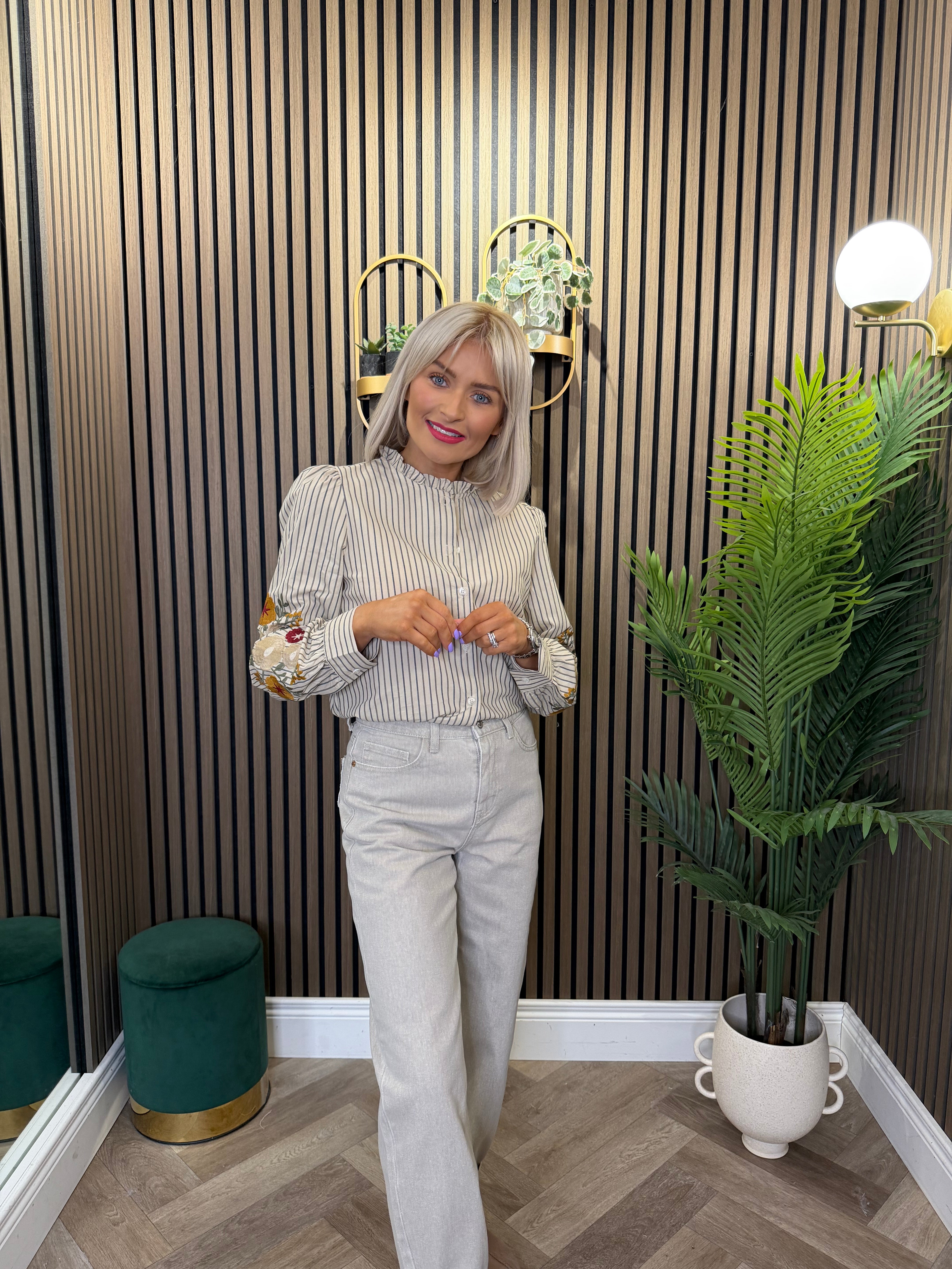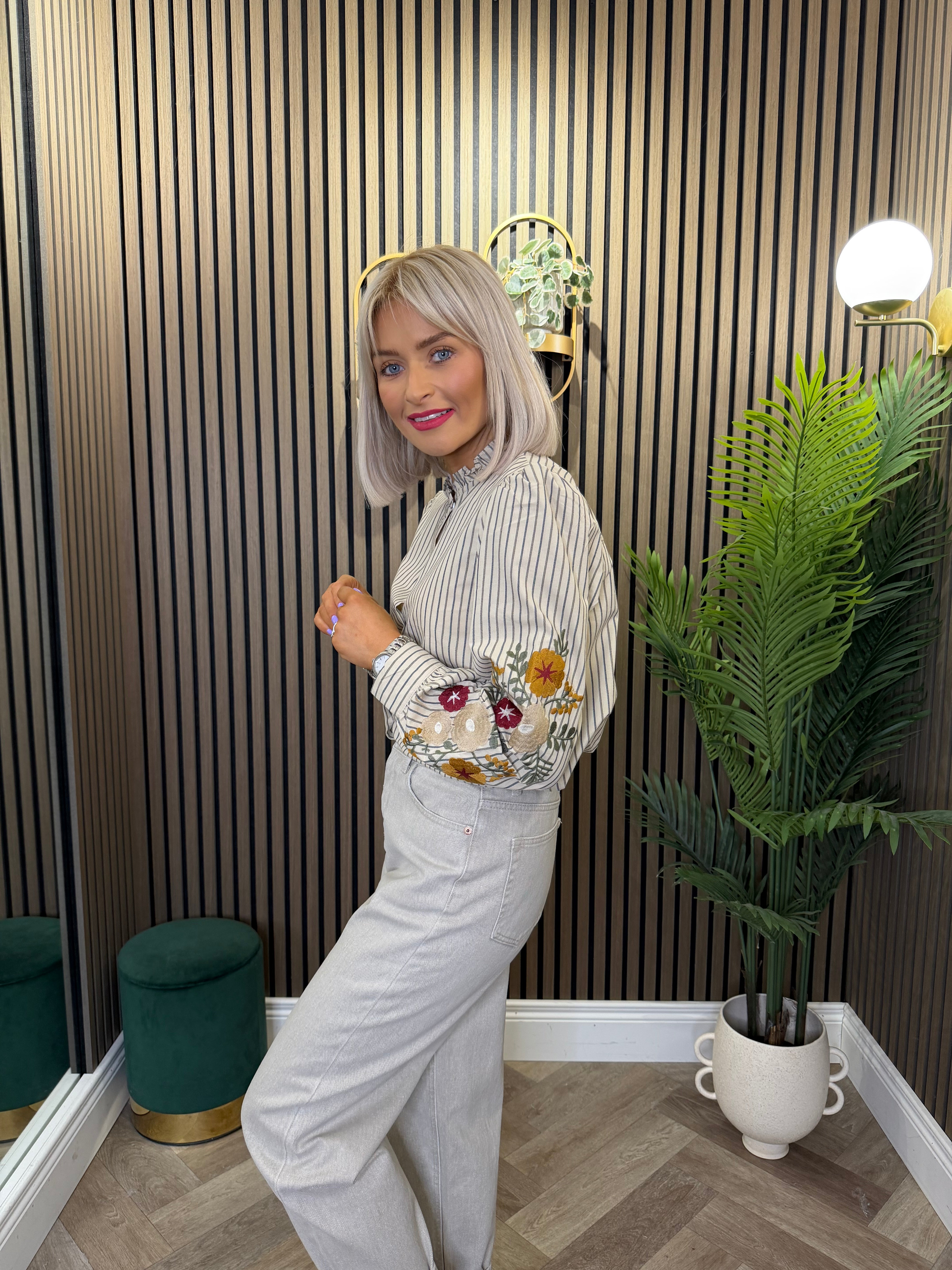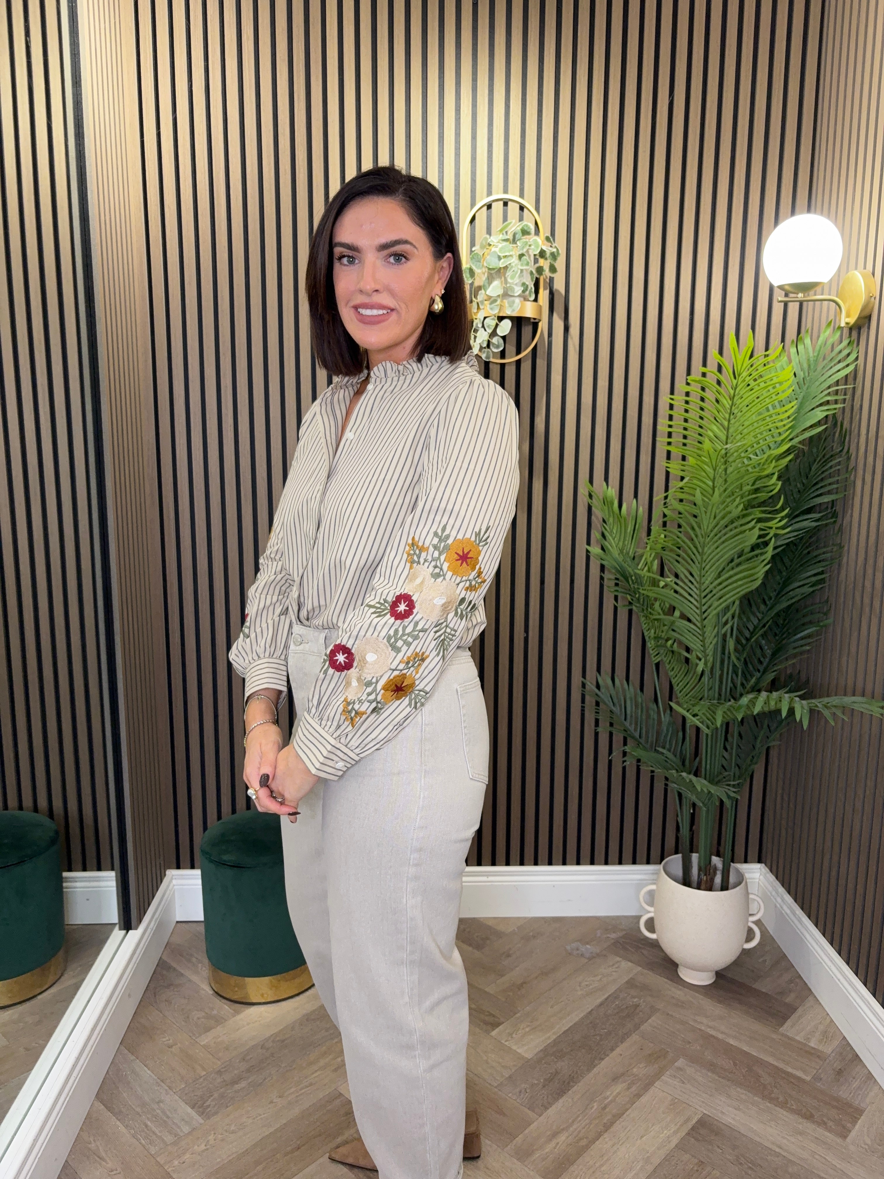 Long sleeve, button up blouse. Small frill collar detailing. Stripe print with flower embroidery detailing on the sleeve.