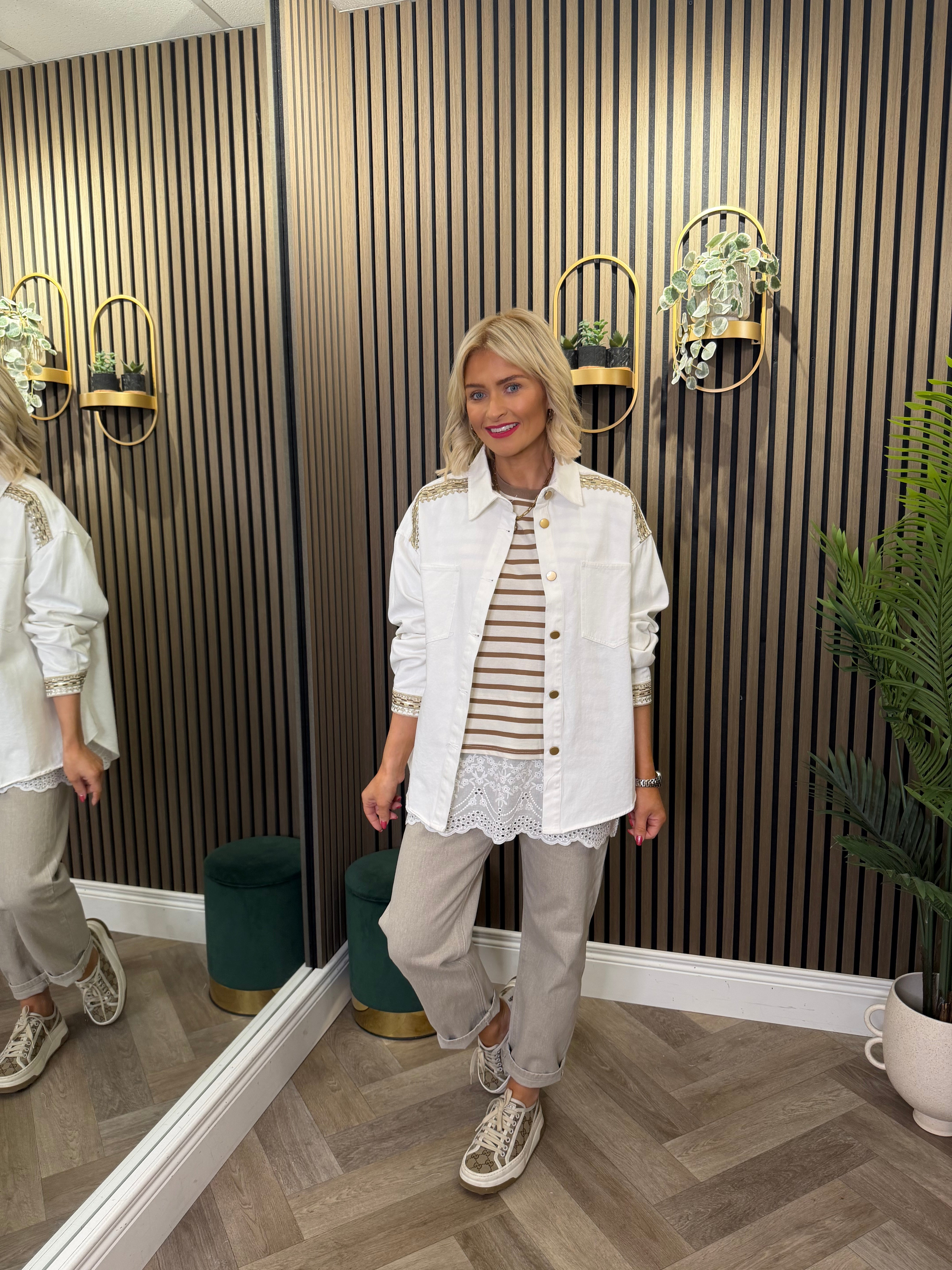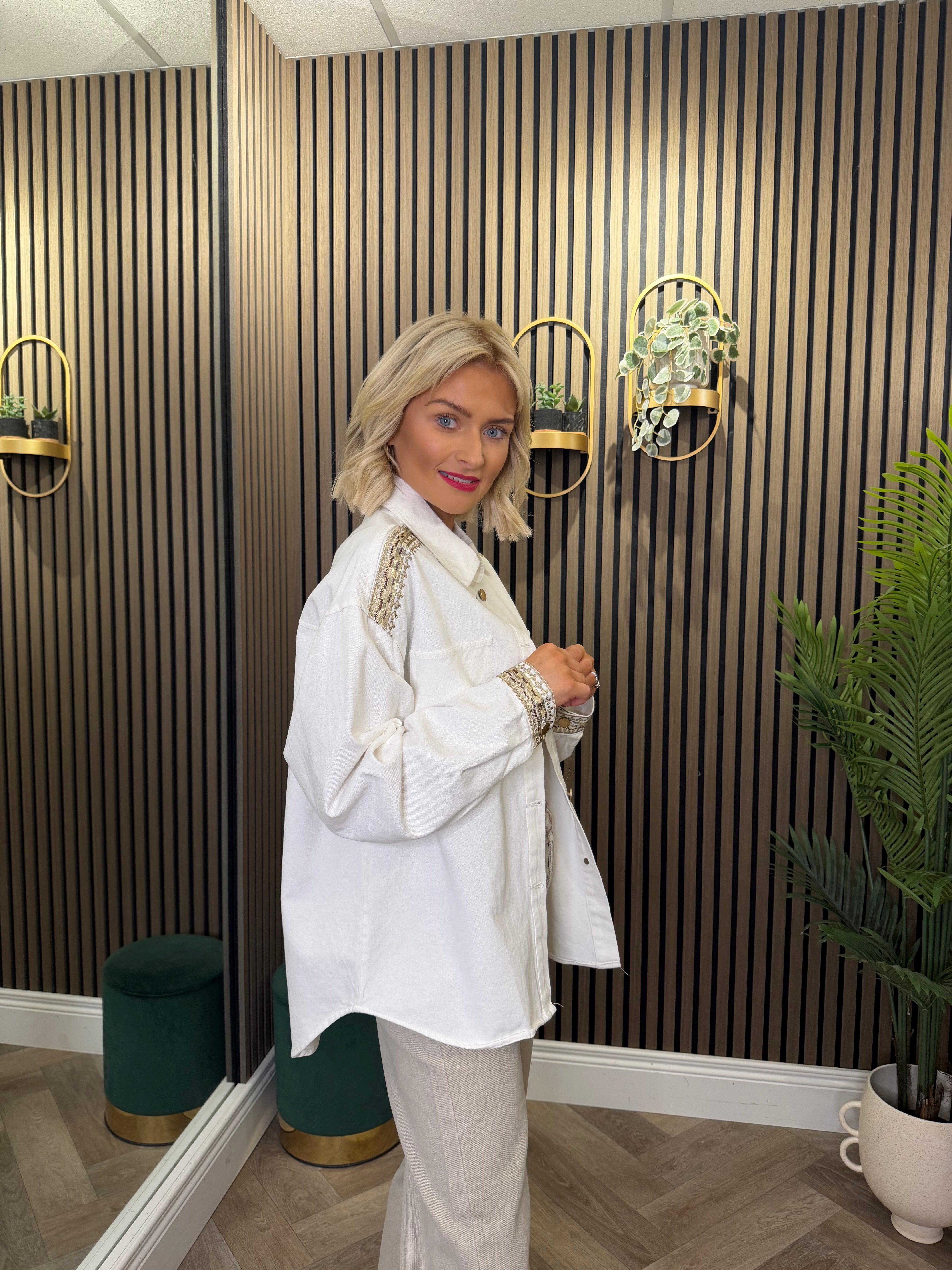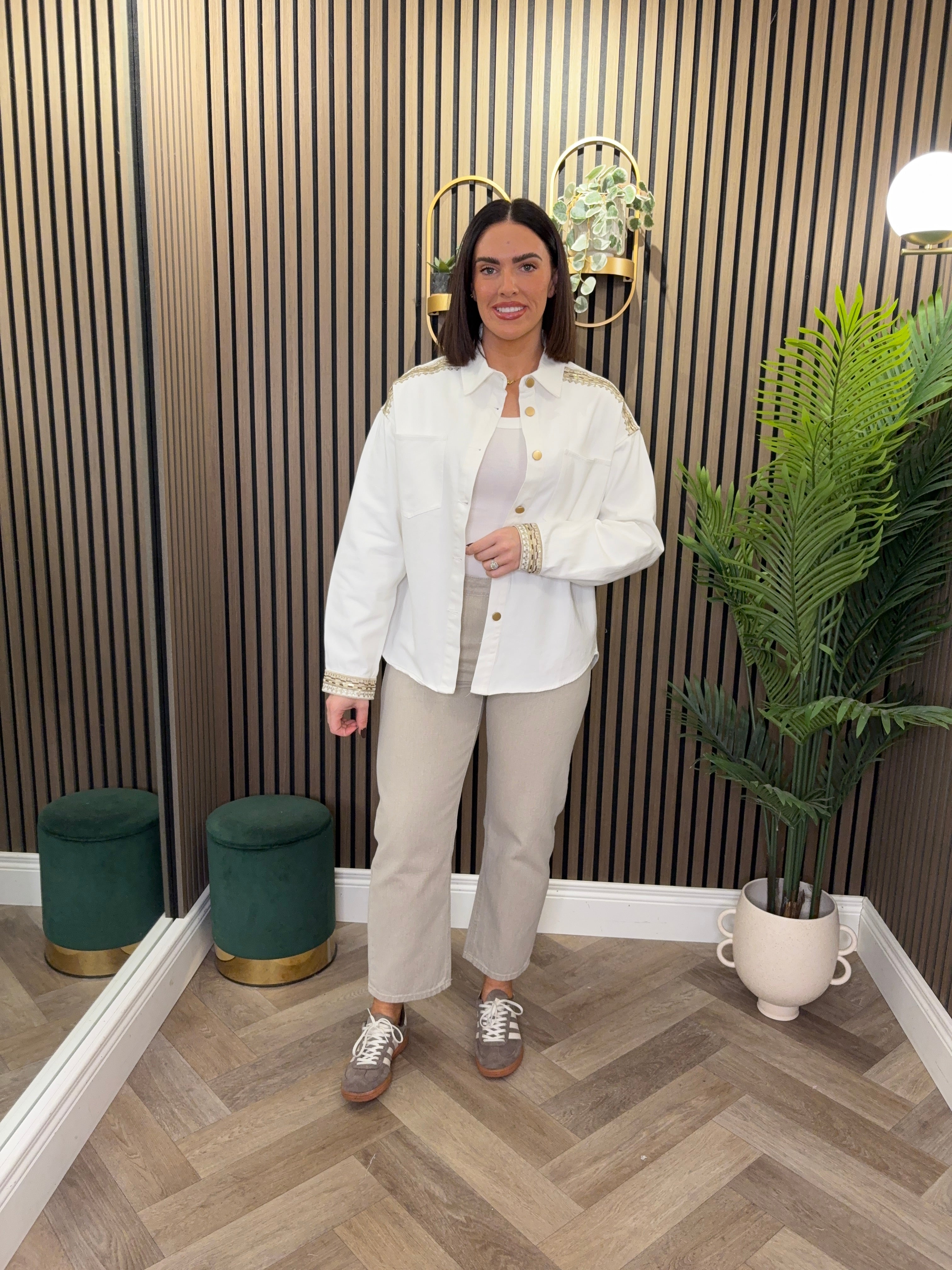 Long sleeve, relaxed style, white denim shacket. Gold embroidered detailing at the top. Gold button up.
