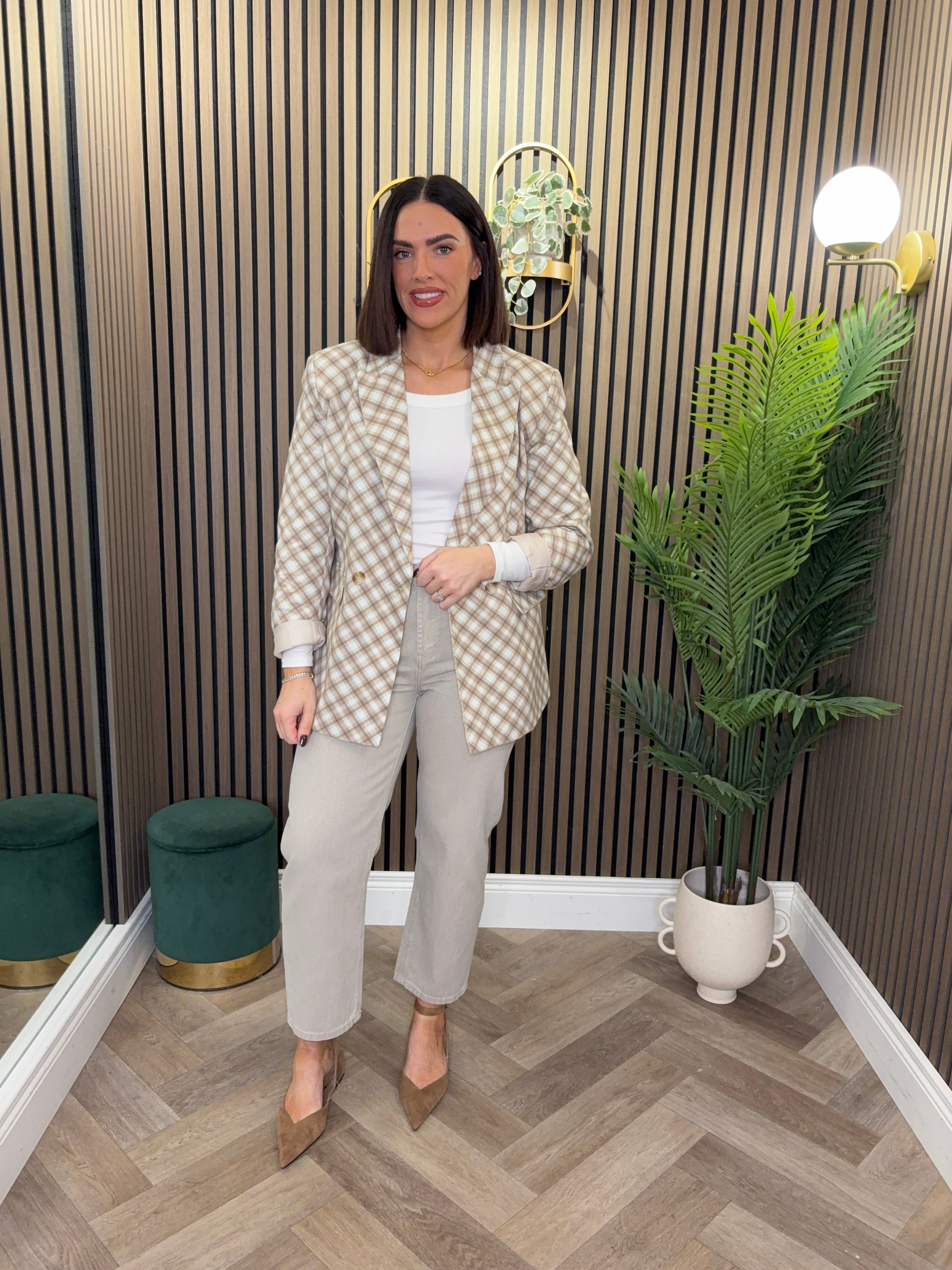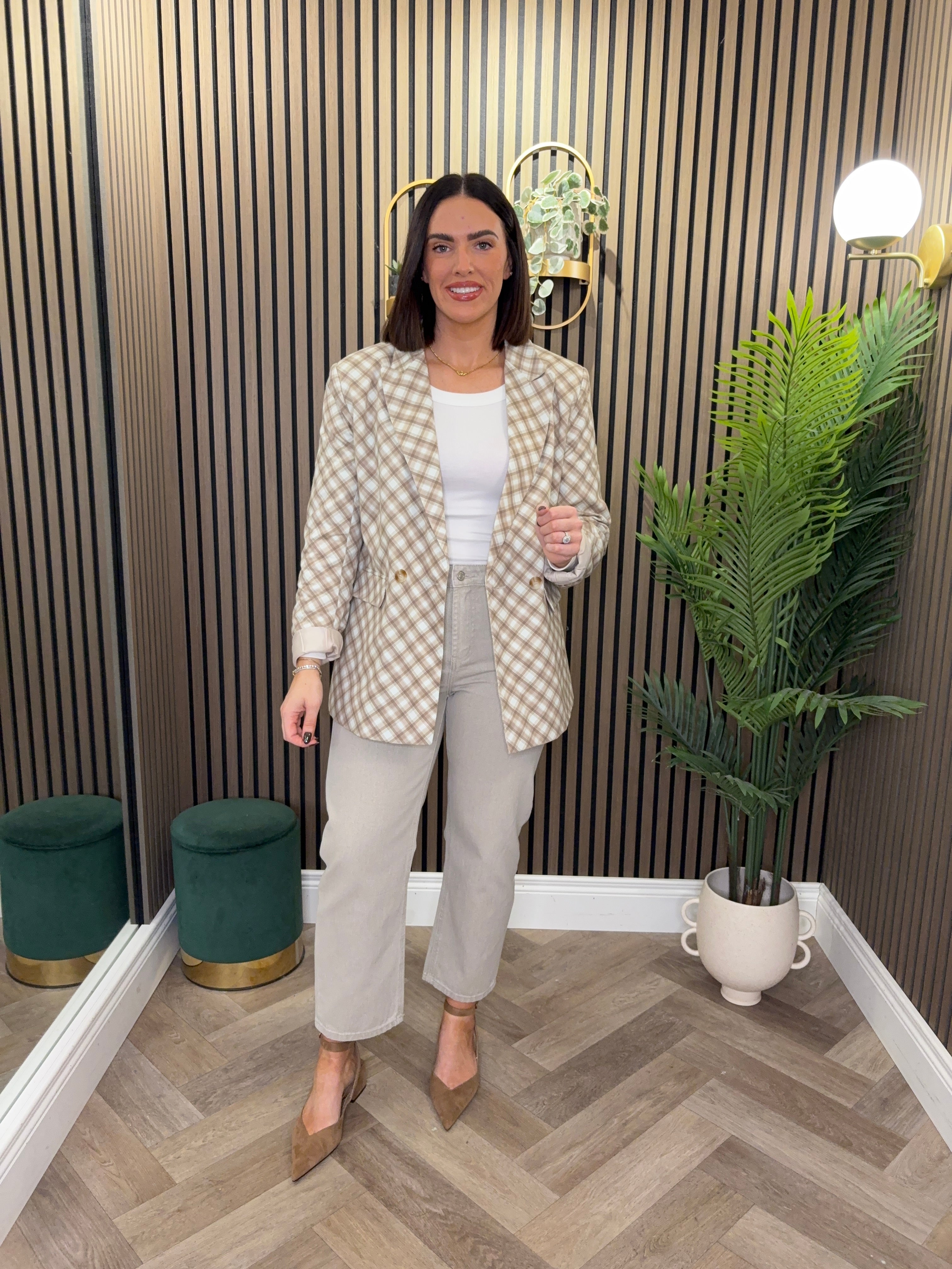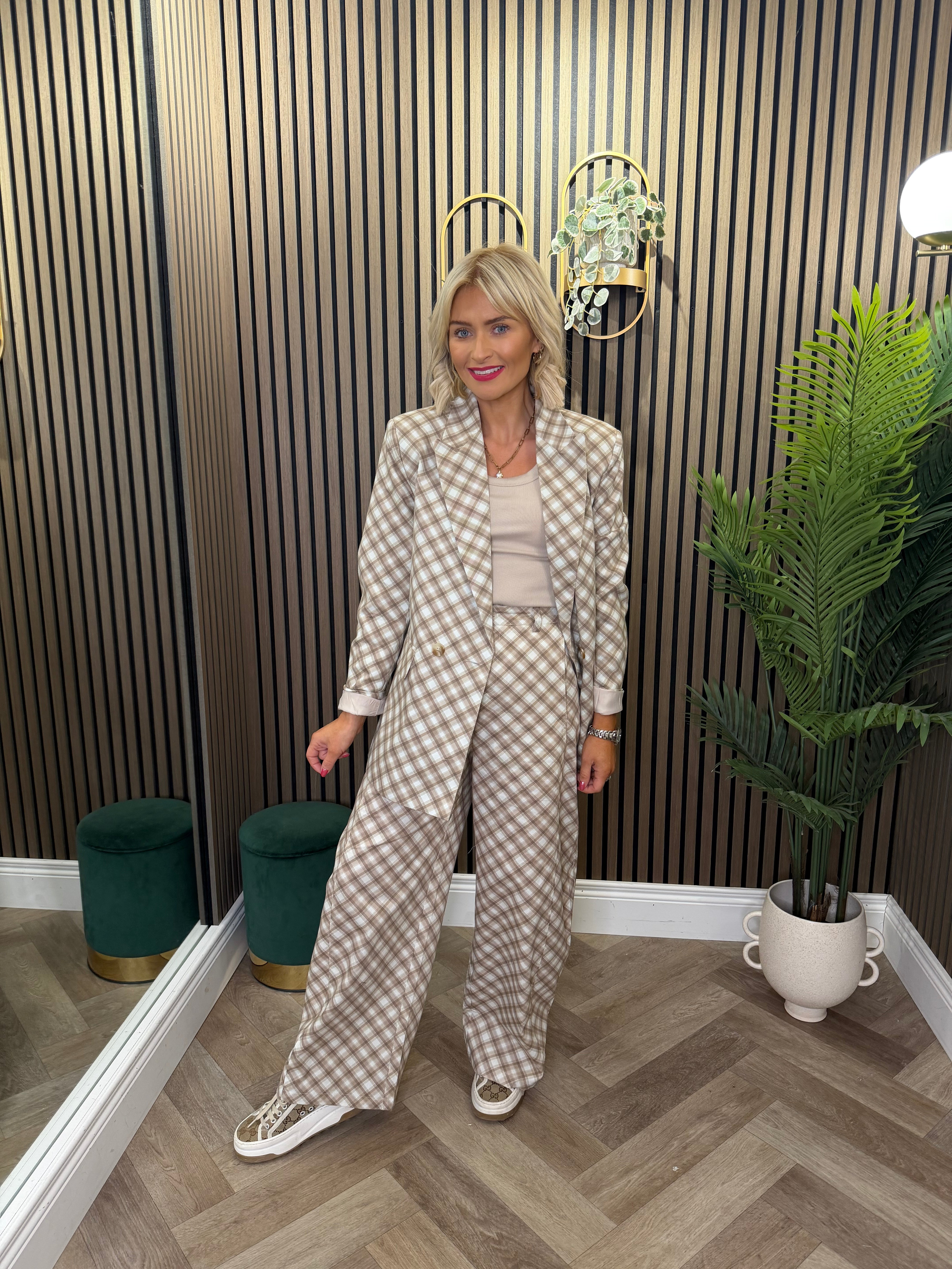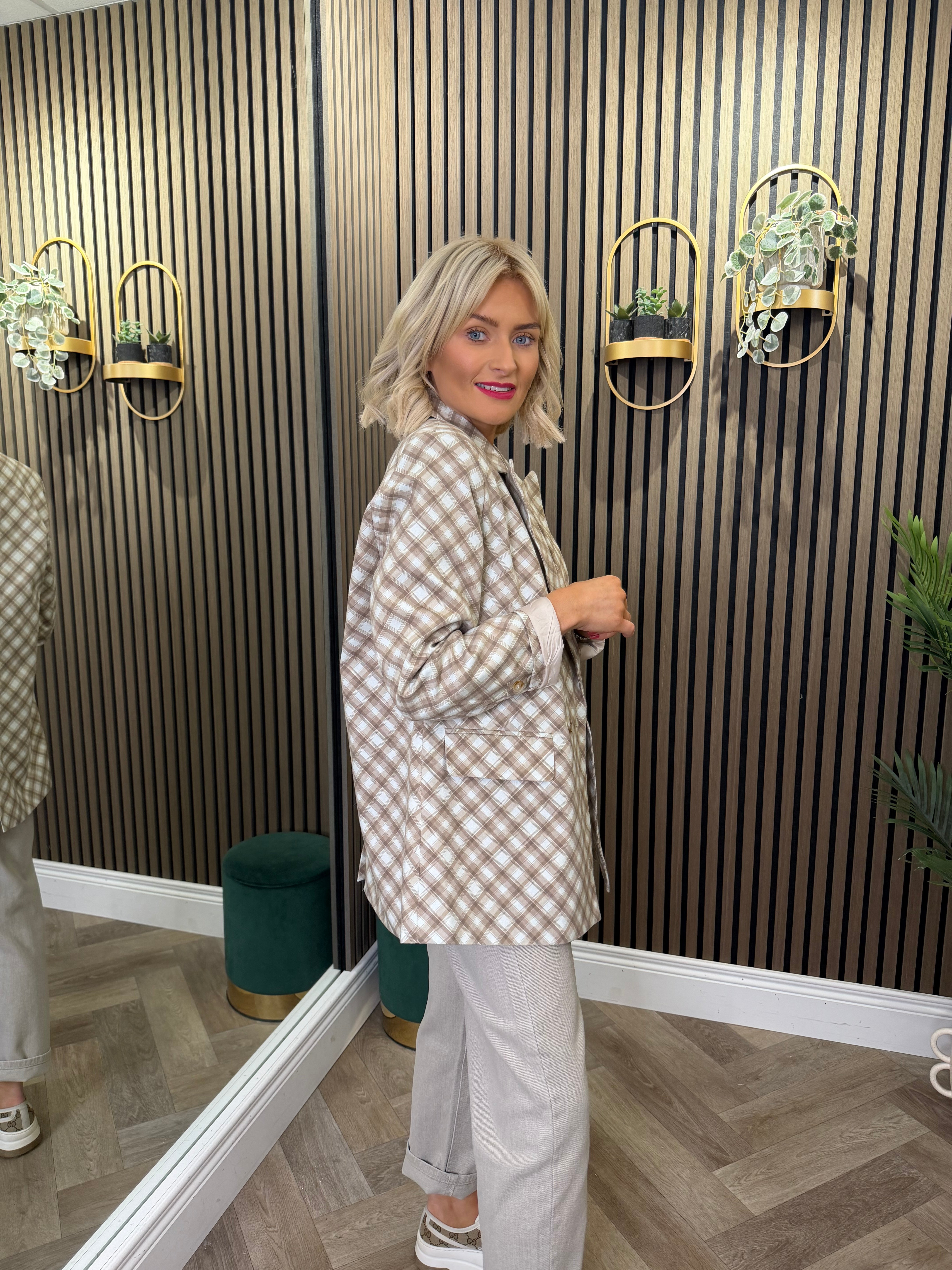 Long sleeve, check style blazer. Relaxed style. Matching trousers available.
