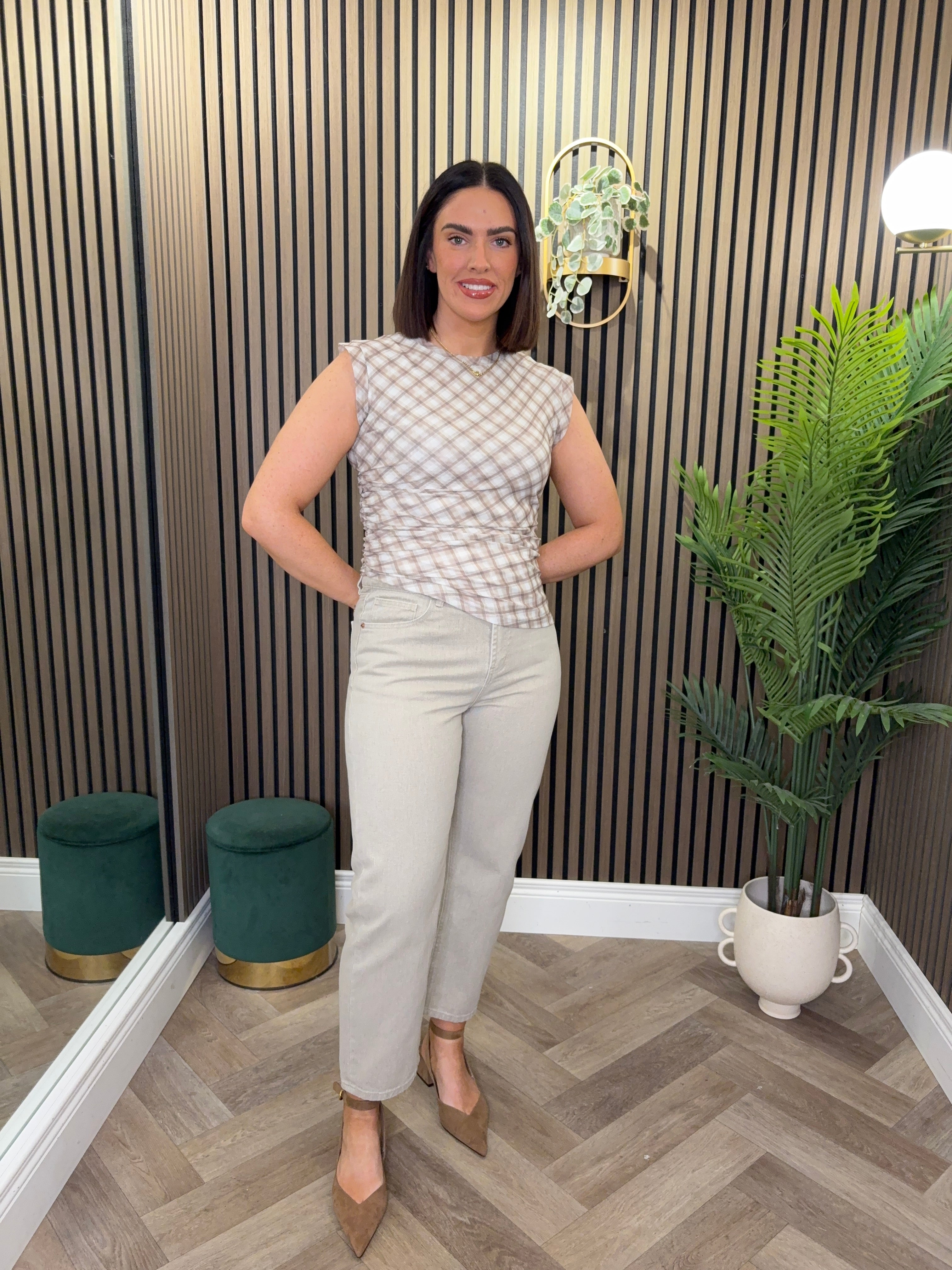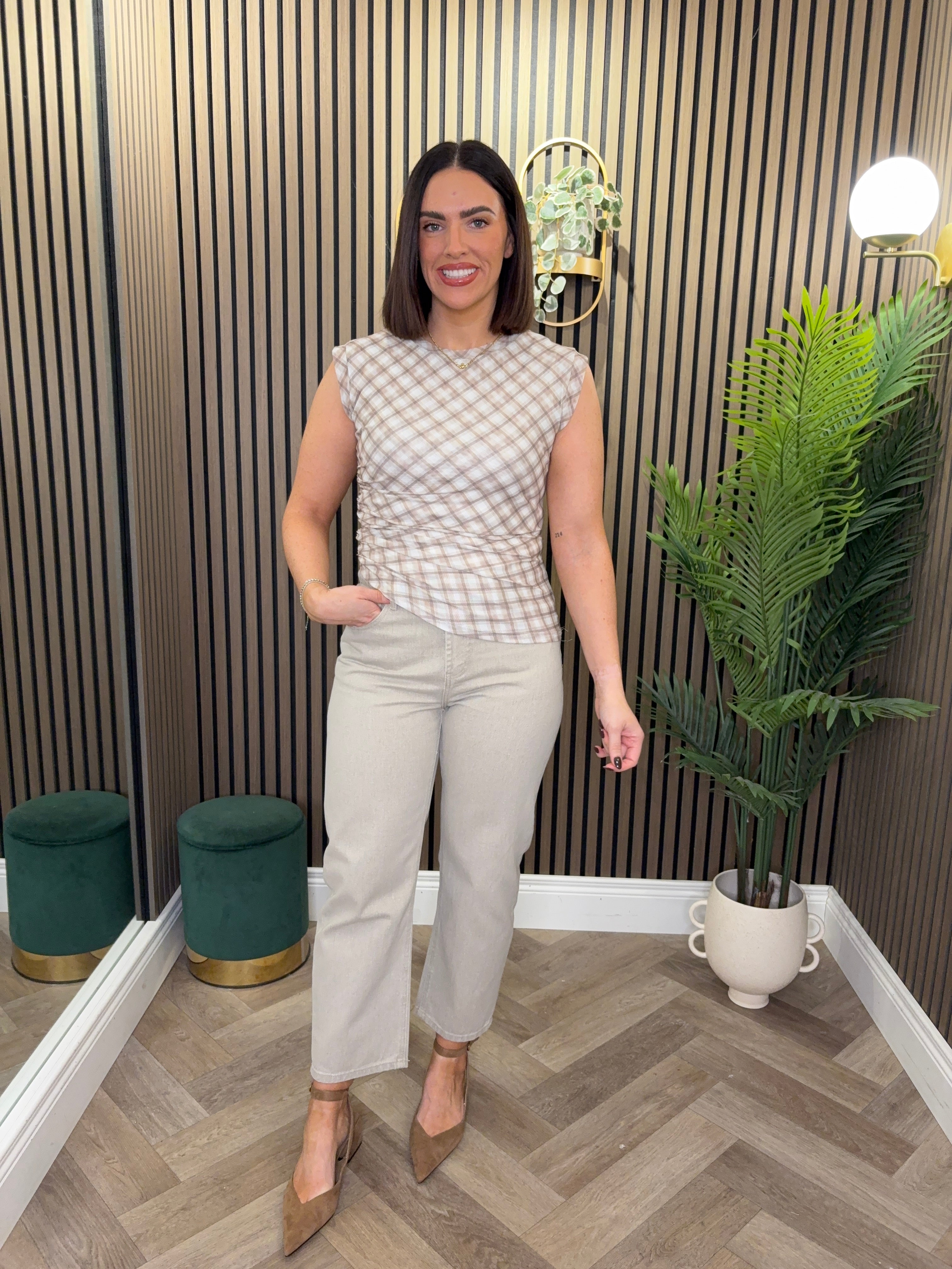 Round neckline, sleeveless style top. Ruched detailing at the sides. Check print.