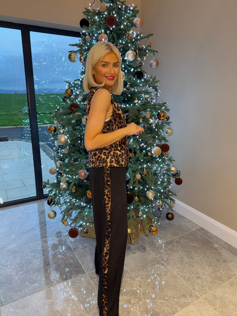 High waisted, full length, wide leg style trousers. Elasticated waisted with draw string detailing. Black with leopard print trim detailing.