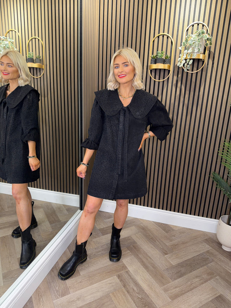 Black leopard print, denim style dress. Oversized frill collar detailing.