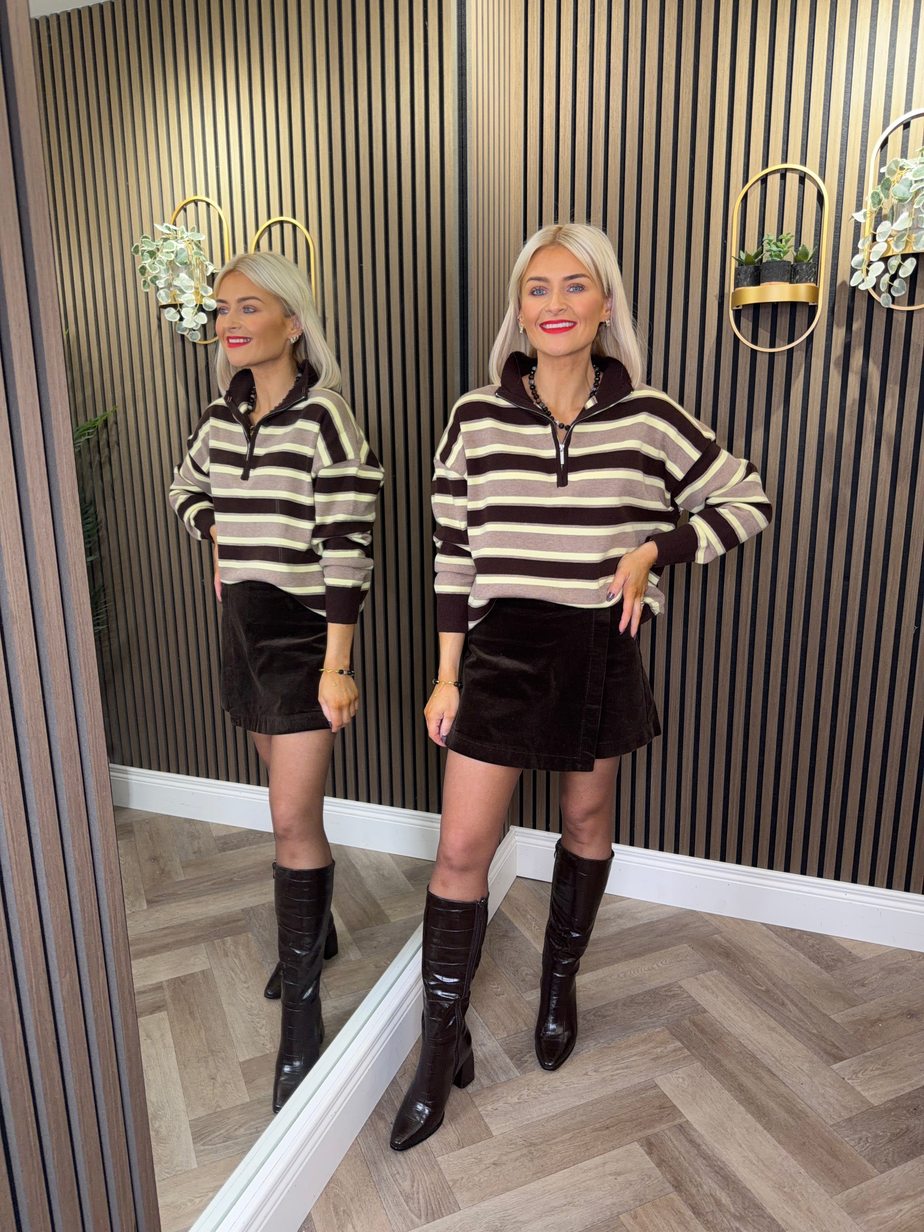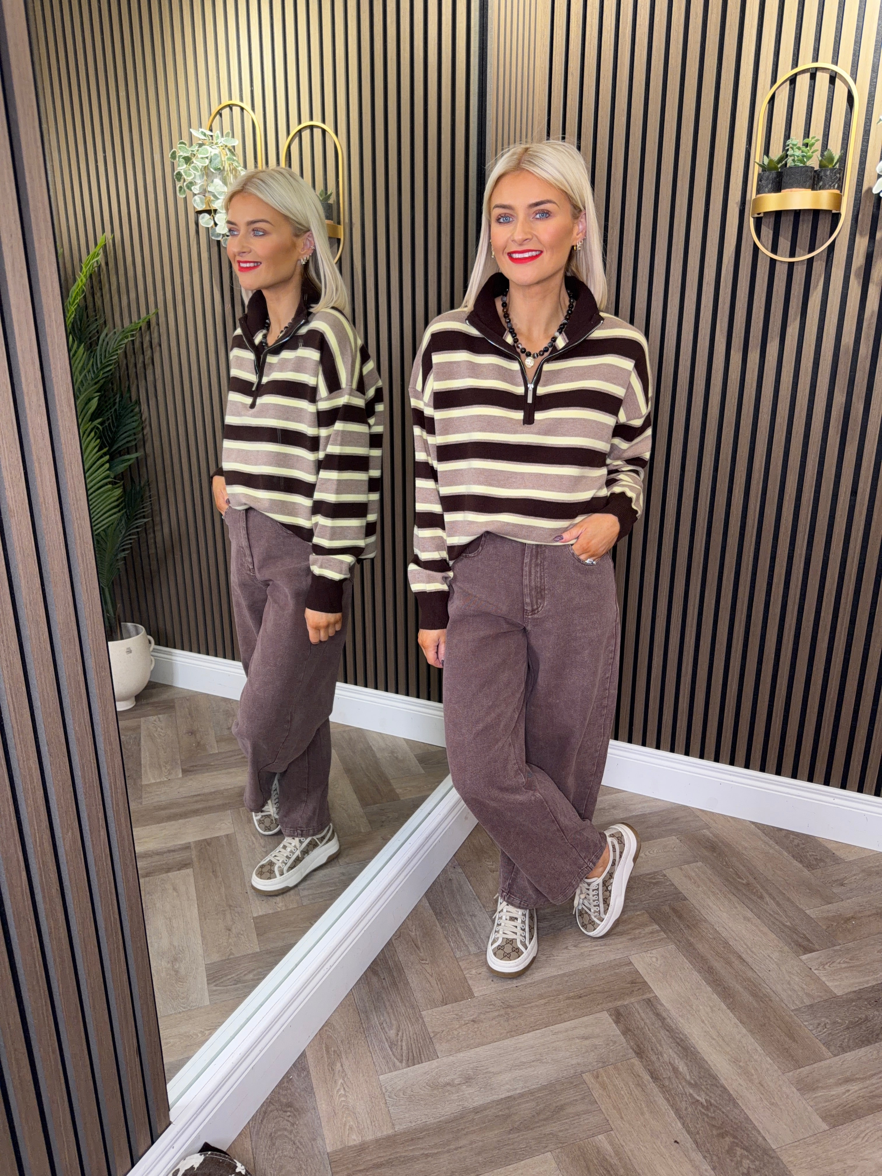 1/4 zip, long sleeve jumper. Brown, yellow and taupe stripe. Relaxed fit.