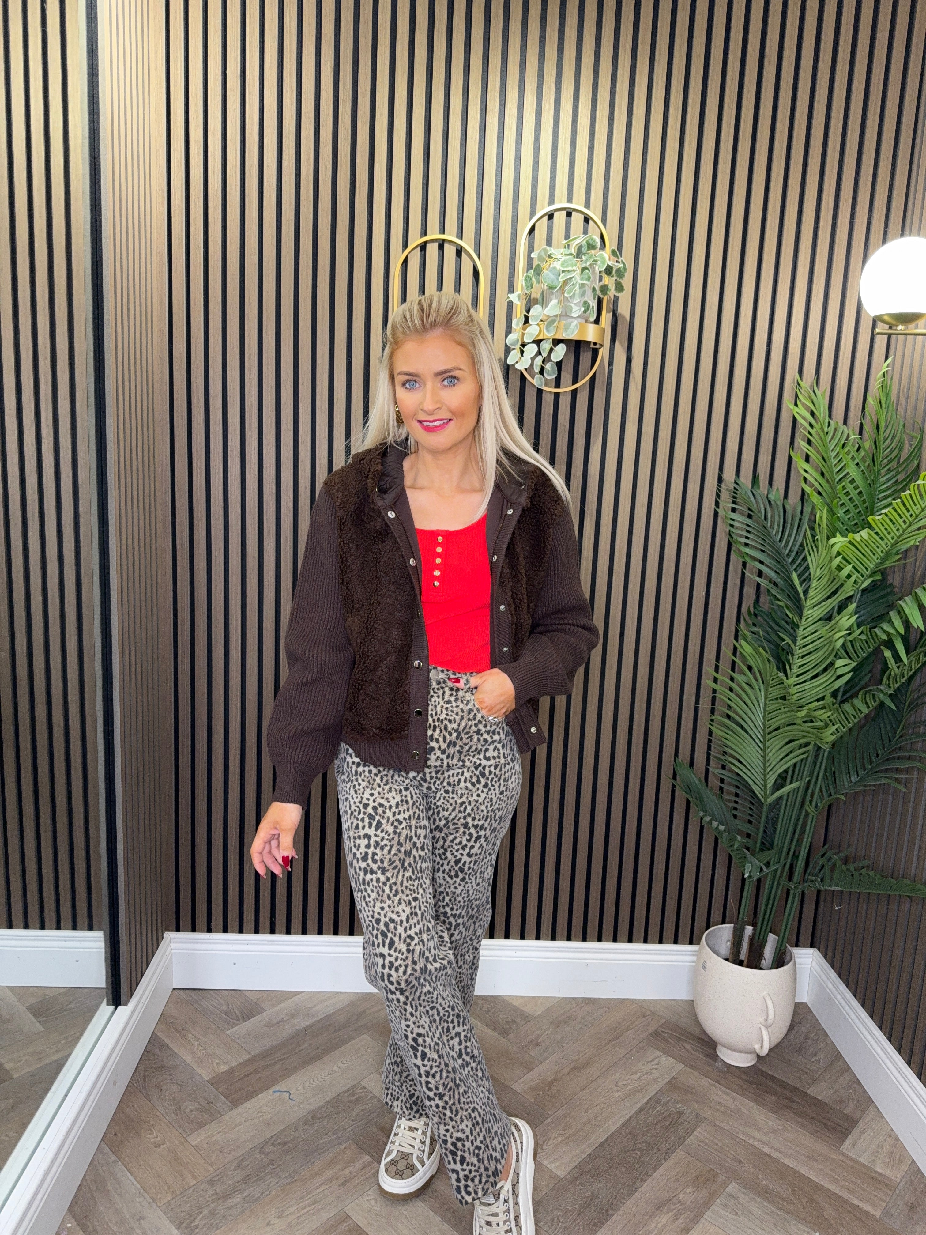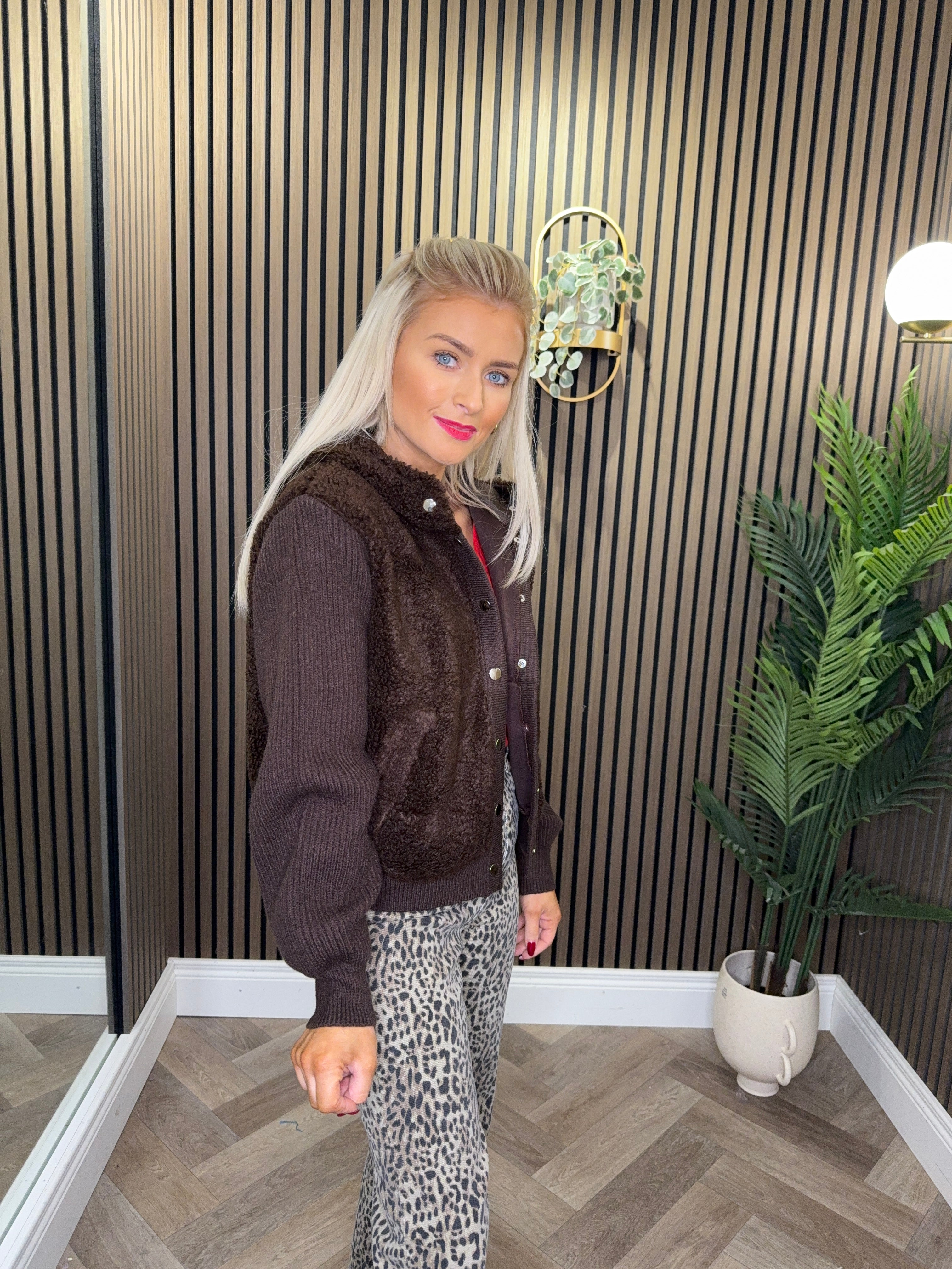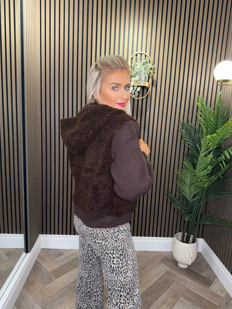 Teddy fabric jacket with knitted sleeve detailing. Button up and side pockets. Teddy fur hood. Available in more colours.