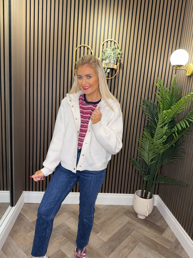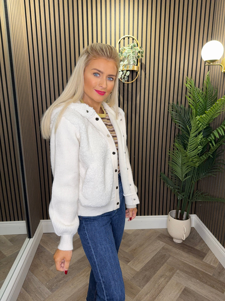 Teddy fabric jacket with knitted sleeve detailing. Button up and side pockets. Teddy fur hood. Available in more colours.