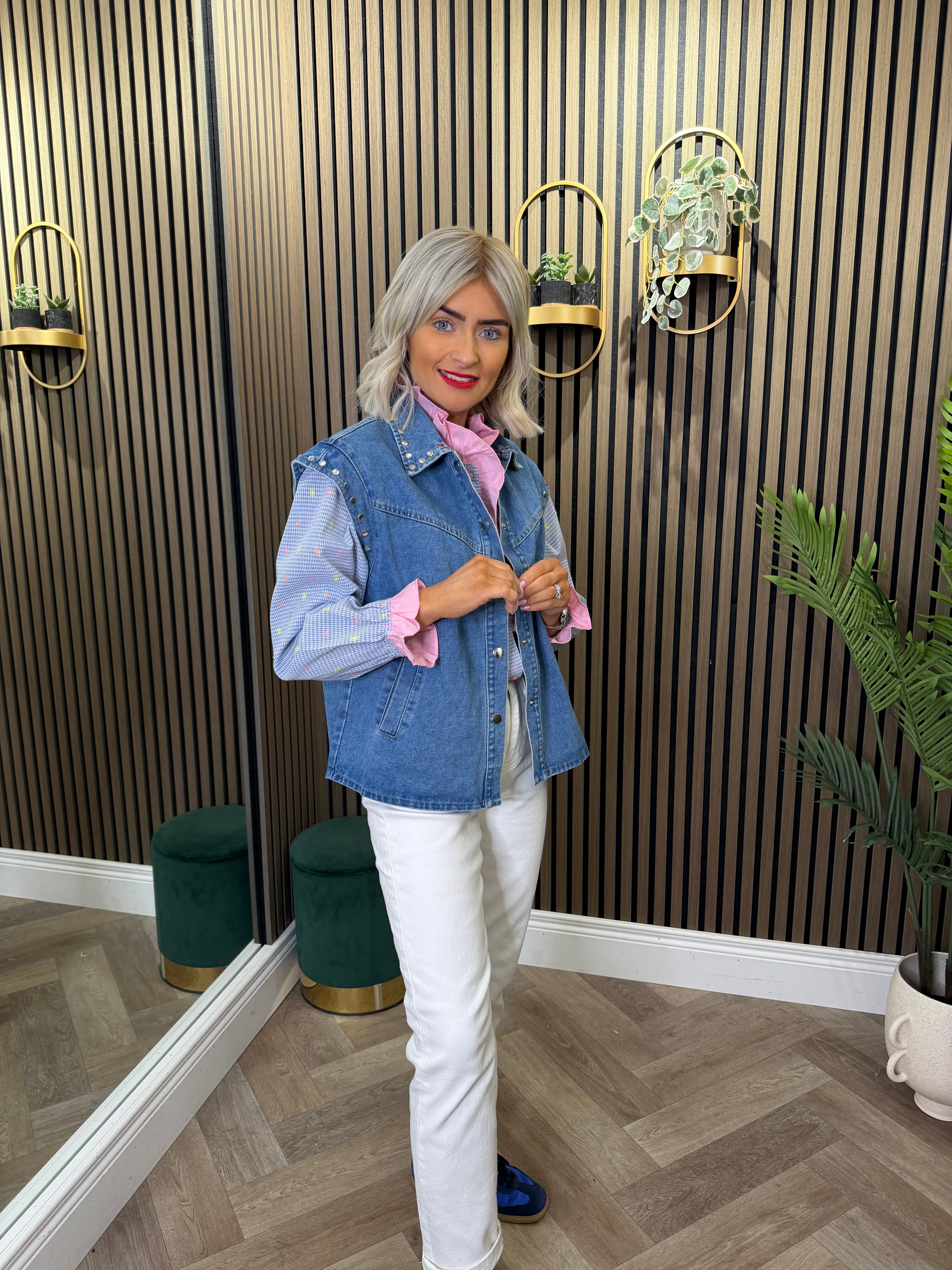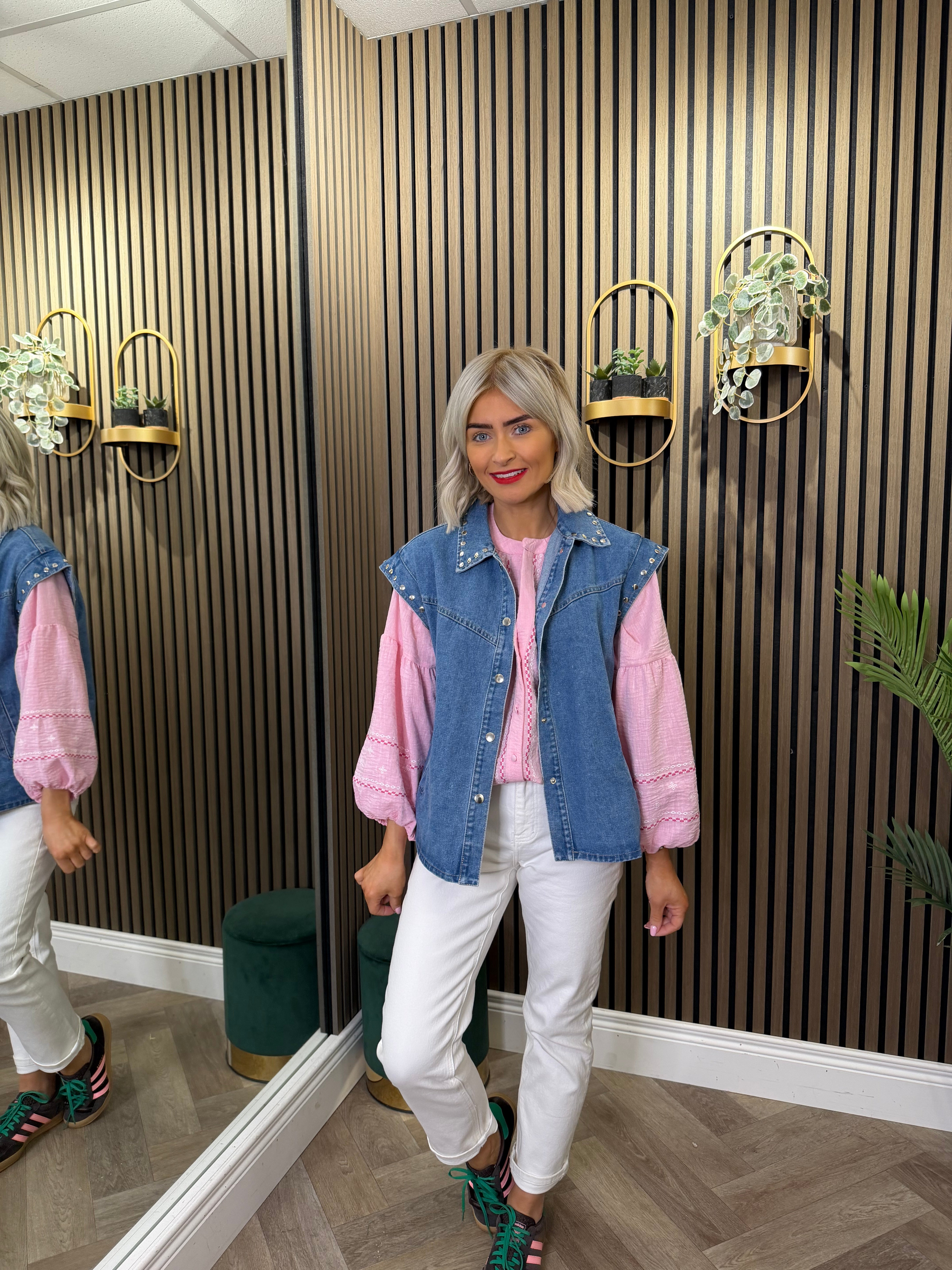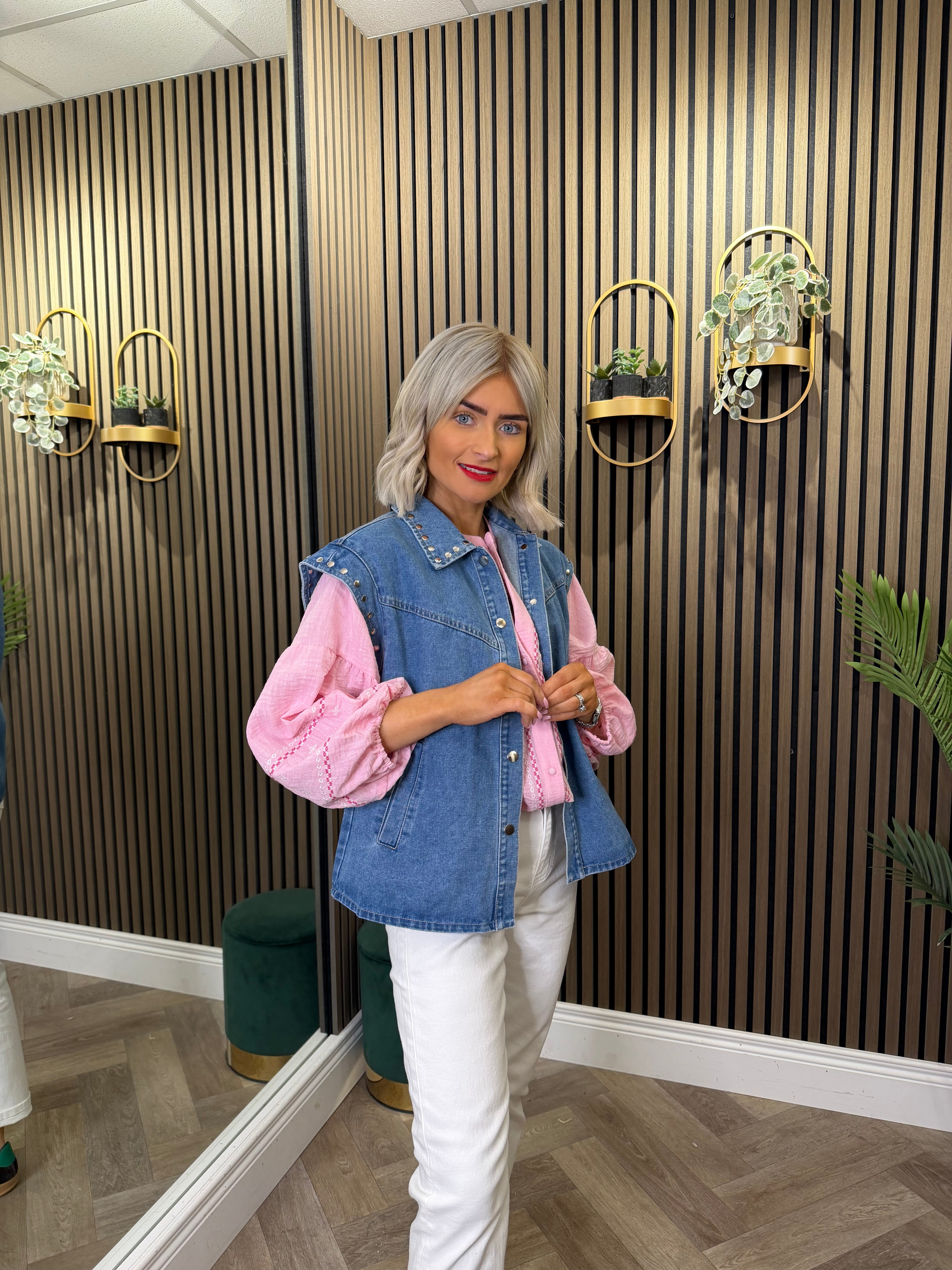 Sleeveless, denim style gilet. Stud detailing. Button up.
