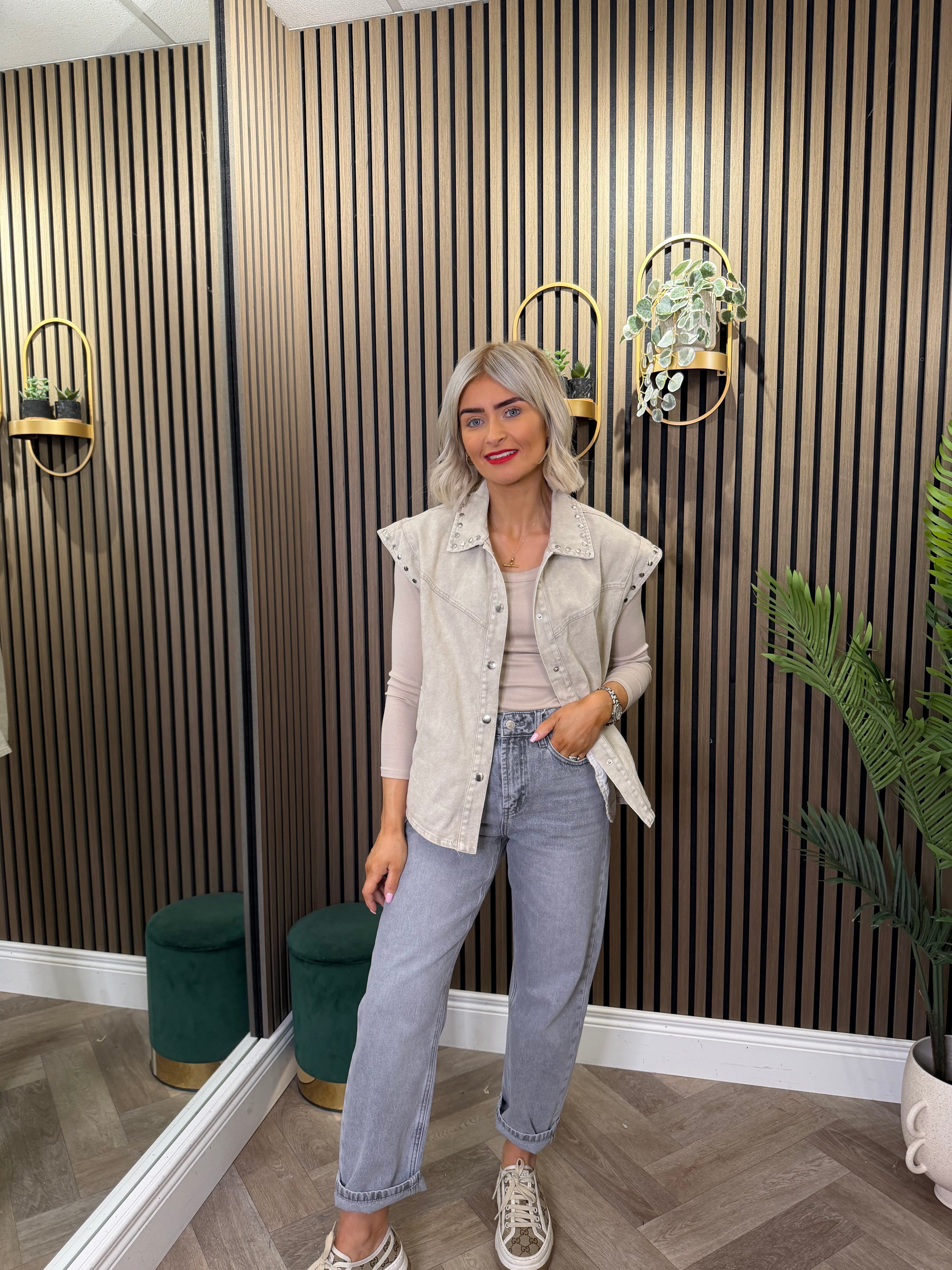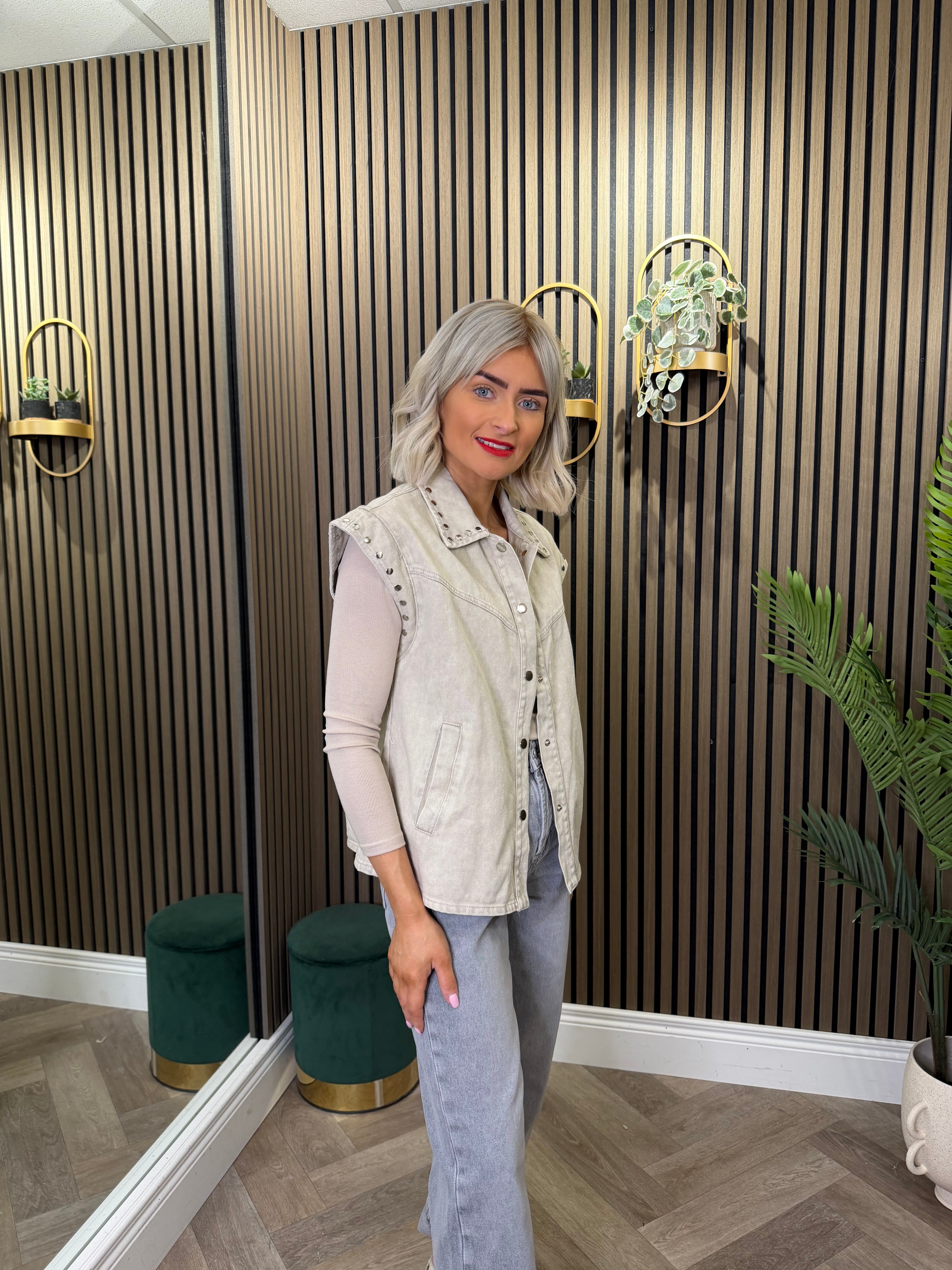 Sleeveless, denim style gilet. Stud detailing. Button up.