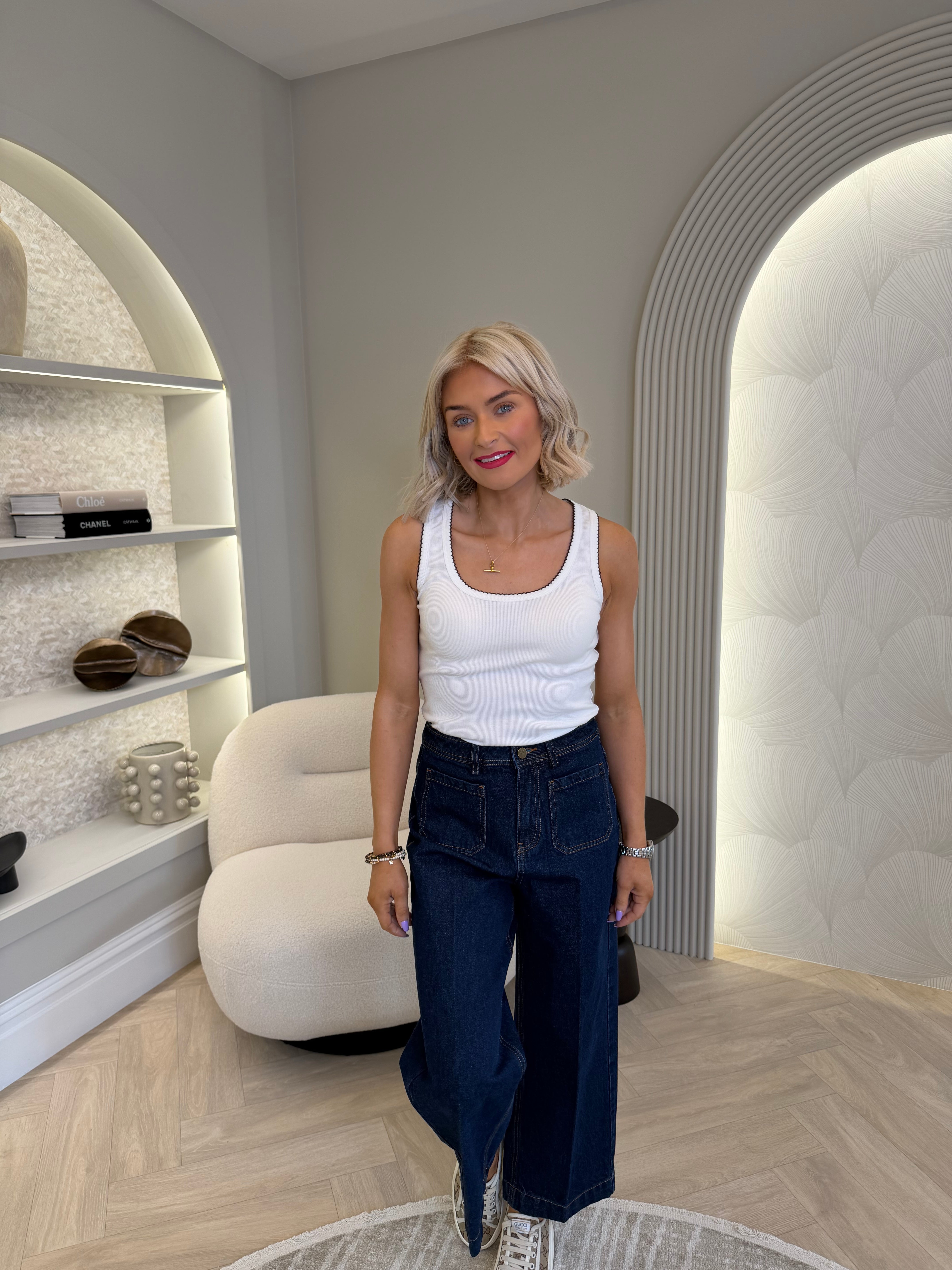 Sleeveless, ribbed white vest with small brown scallop detailing around the neckline.