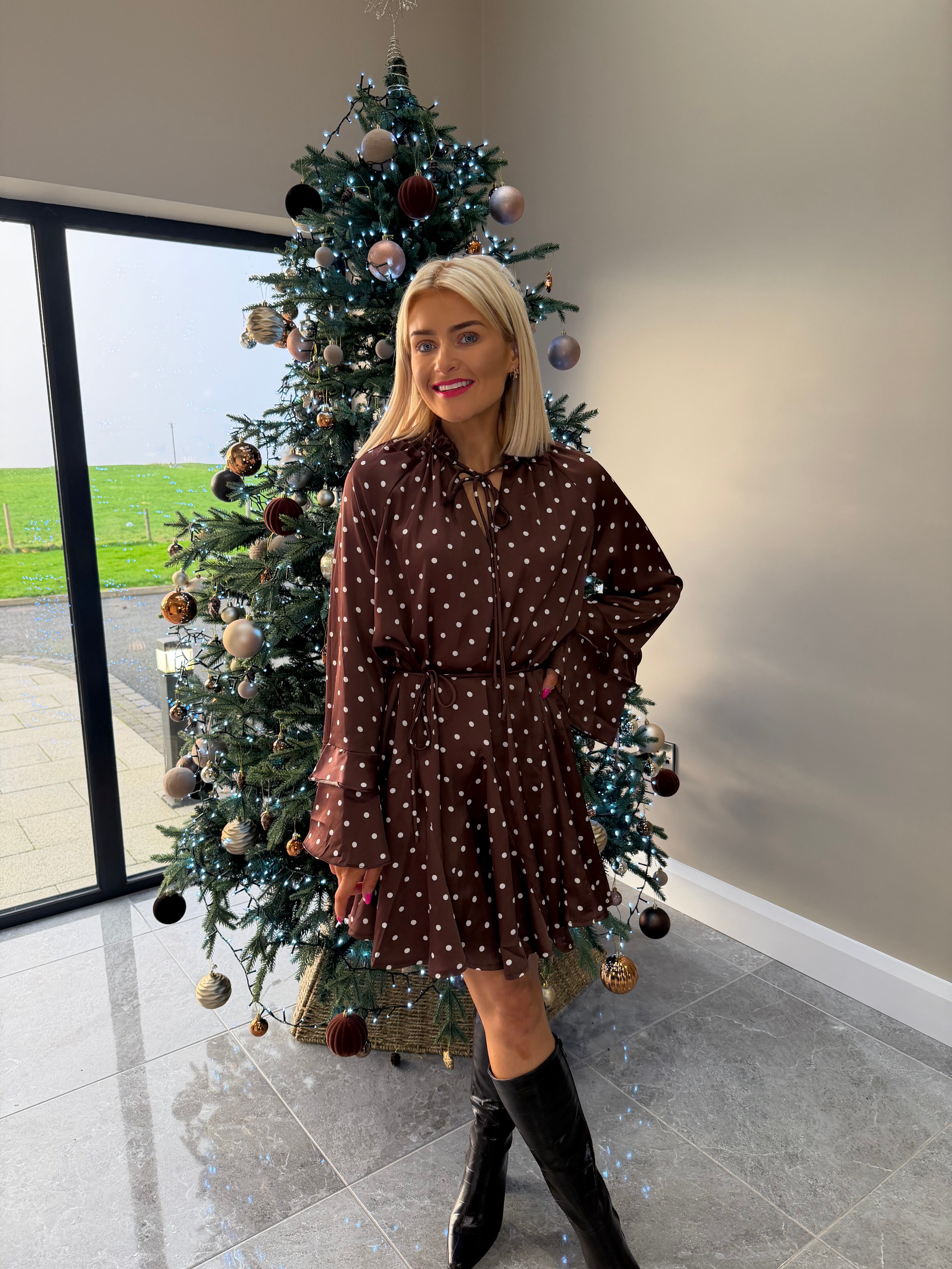 Long sleeve, V neckline, skater style dress. Tie belt. Dottie print. Available in more colours.