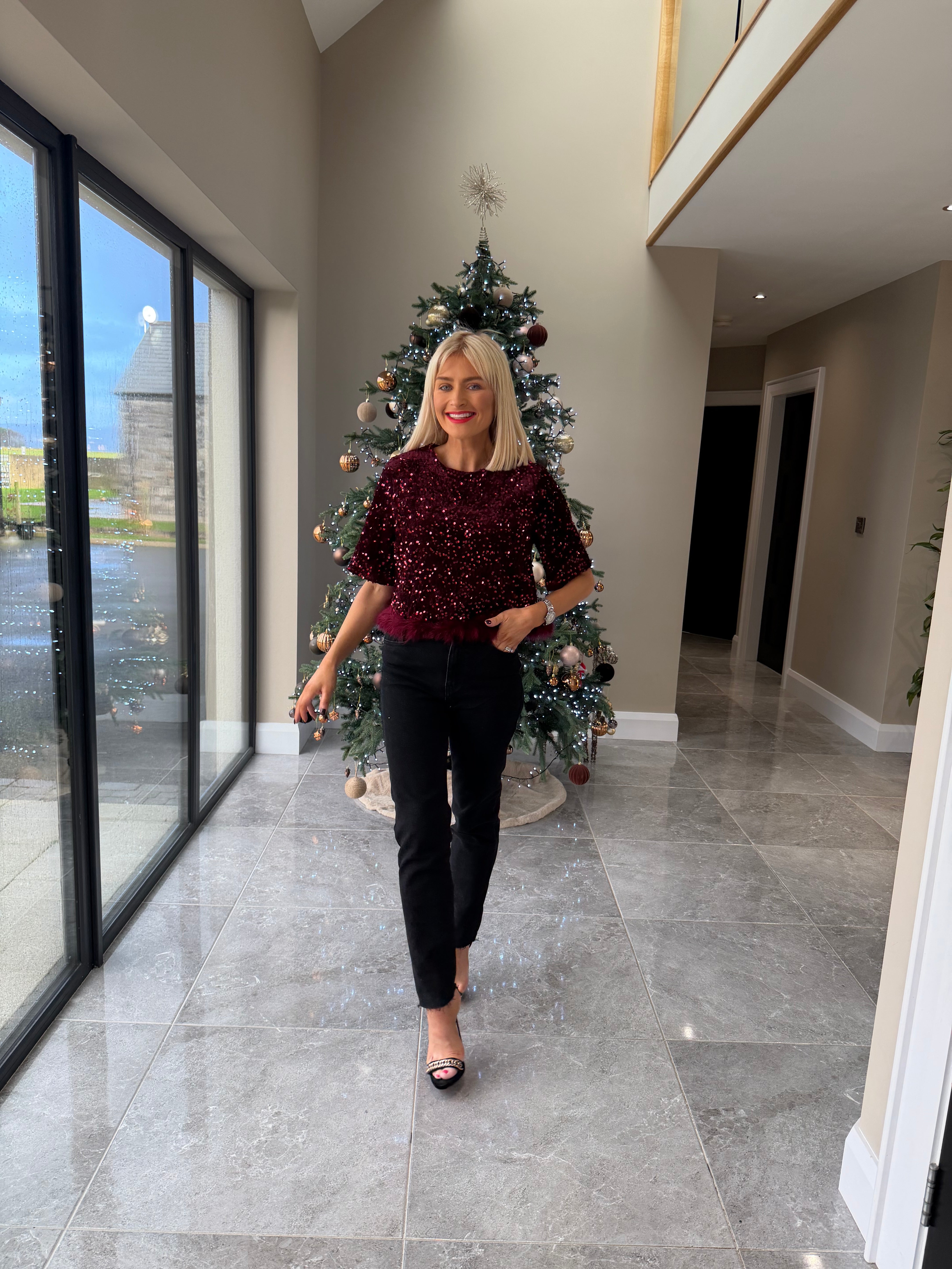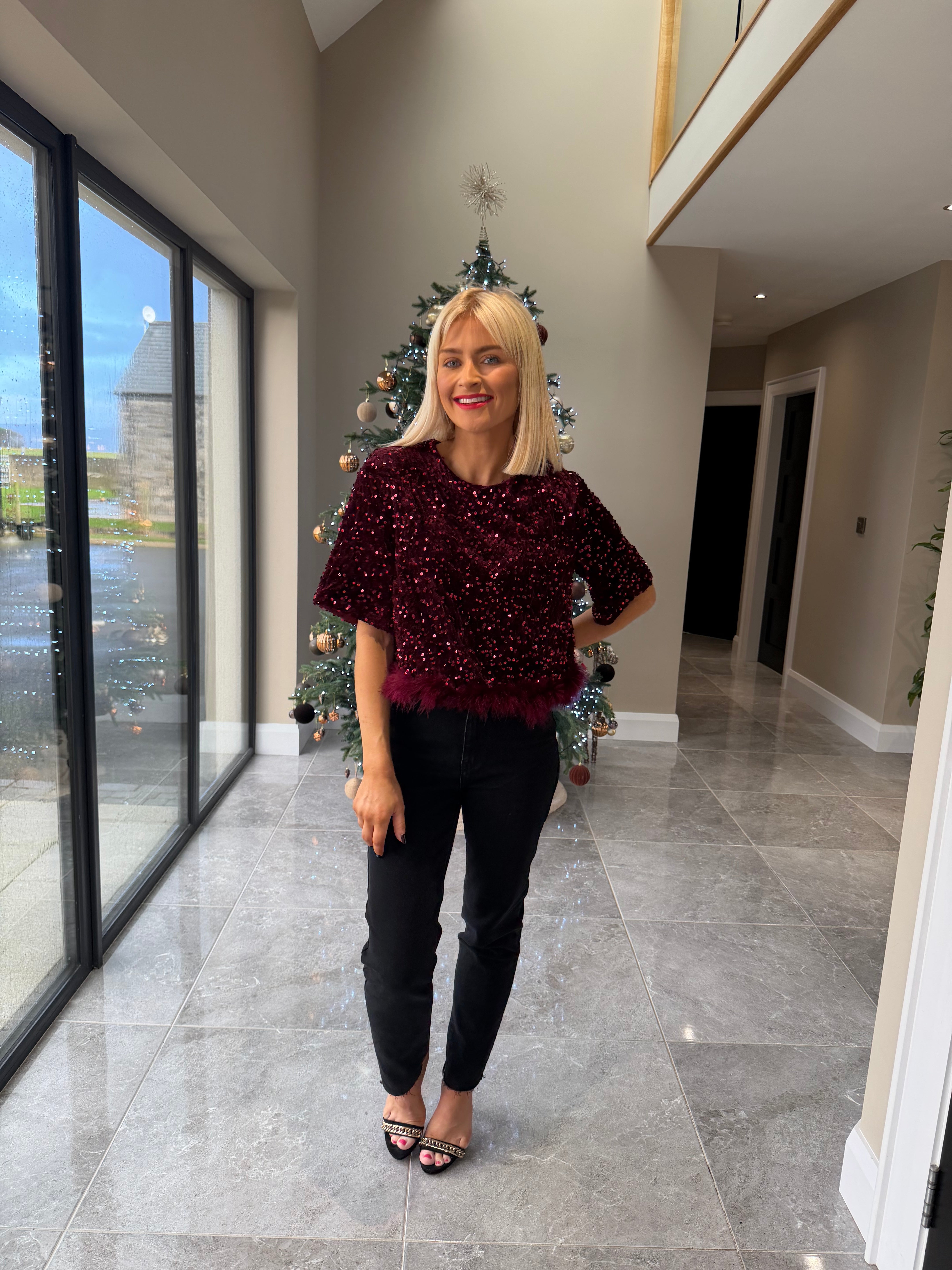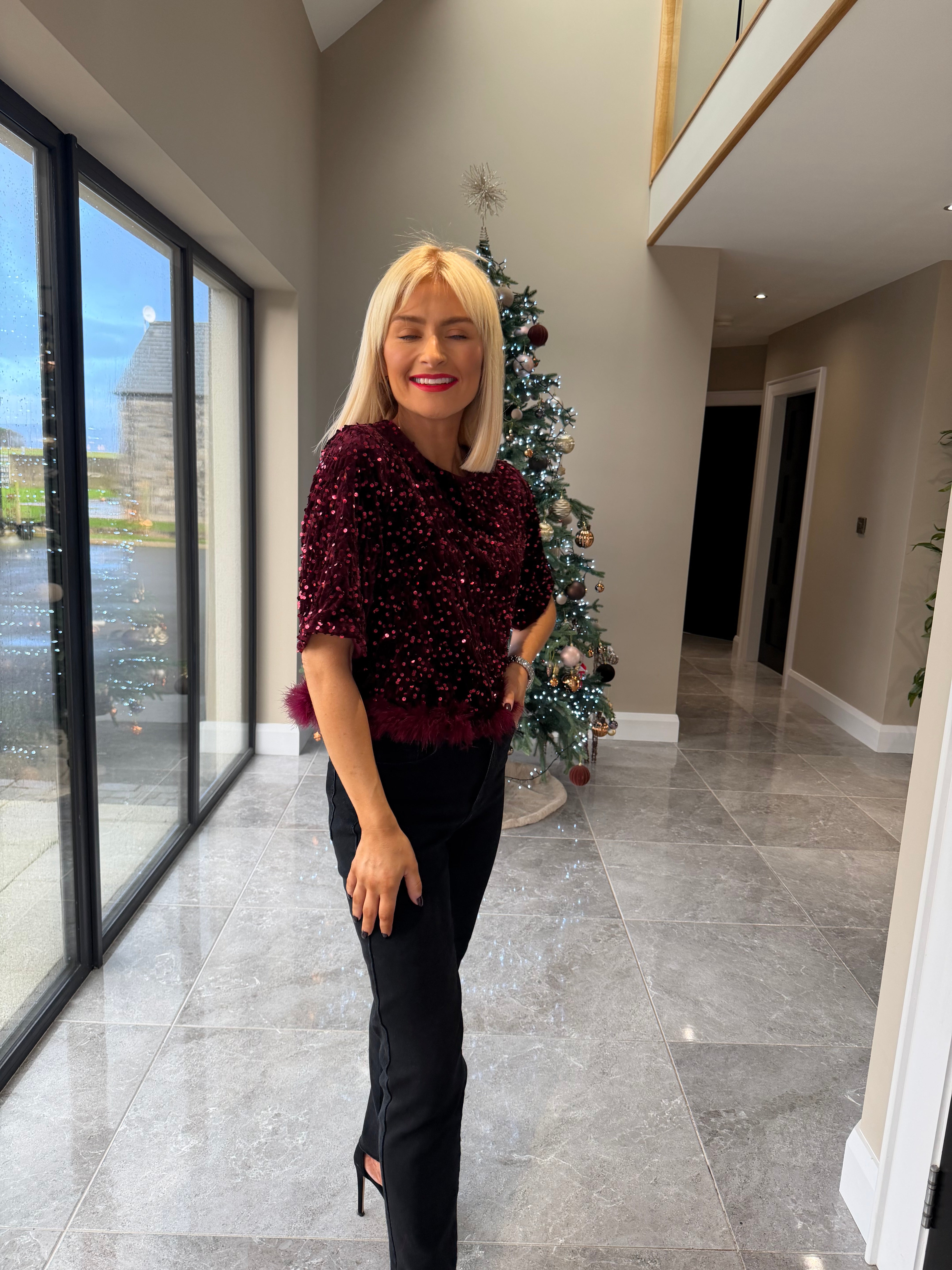 Julia 3/4 Sleeve Sequin Top Burgundy