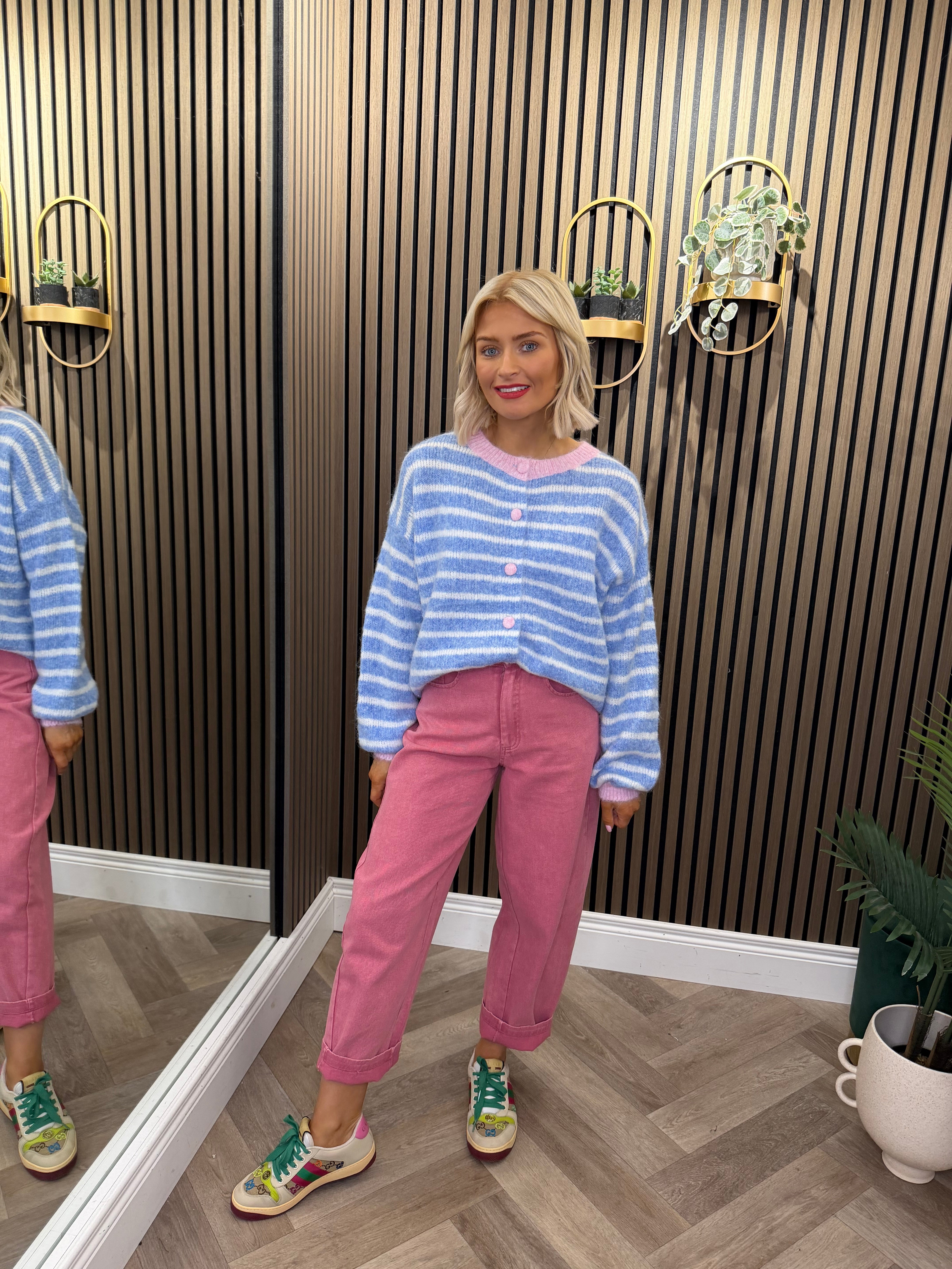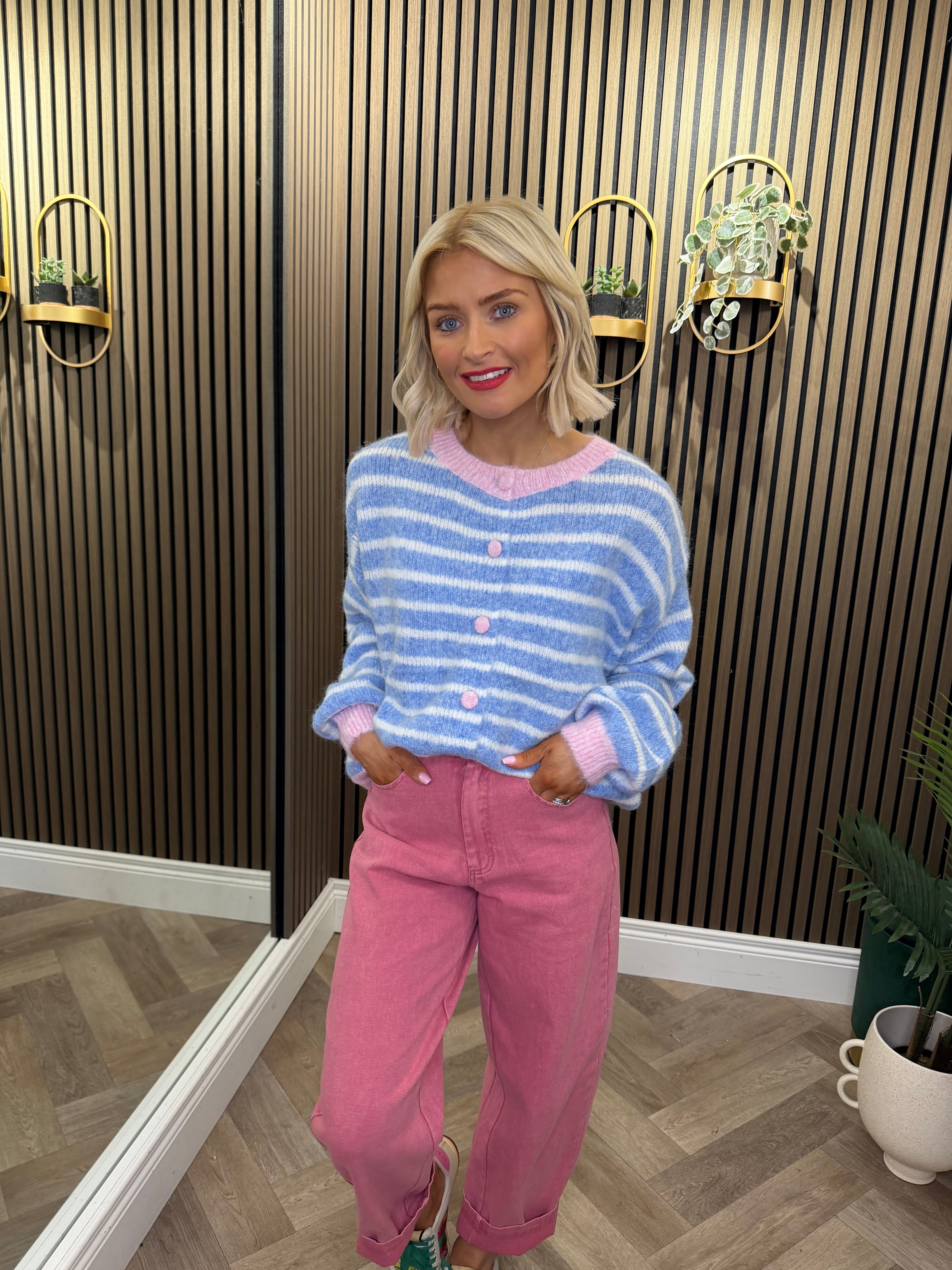 Long sleeve, round neckline, button up, knitted cardigan. Stripe print. Available in more colours.