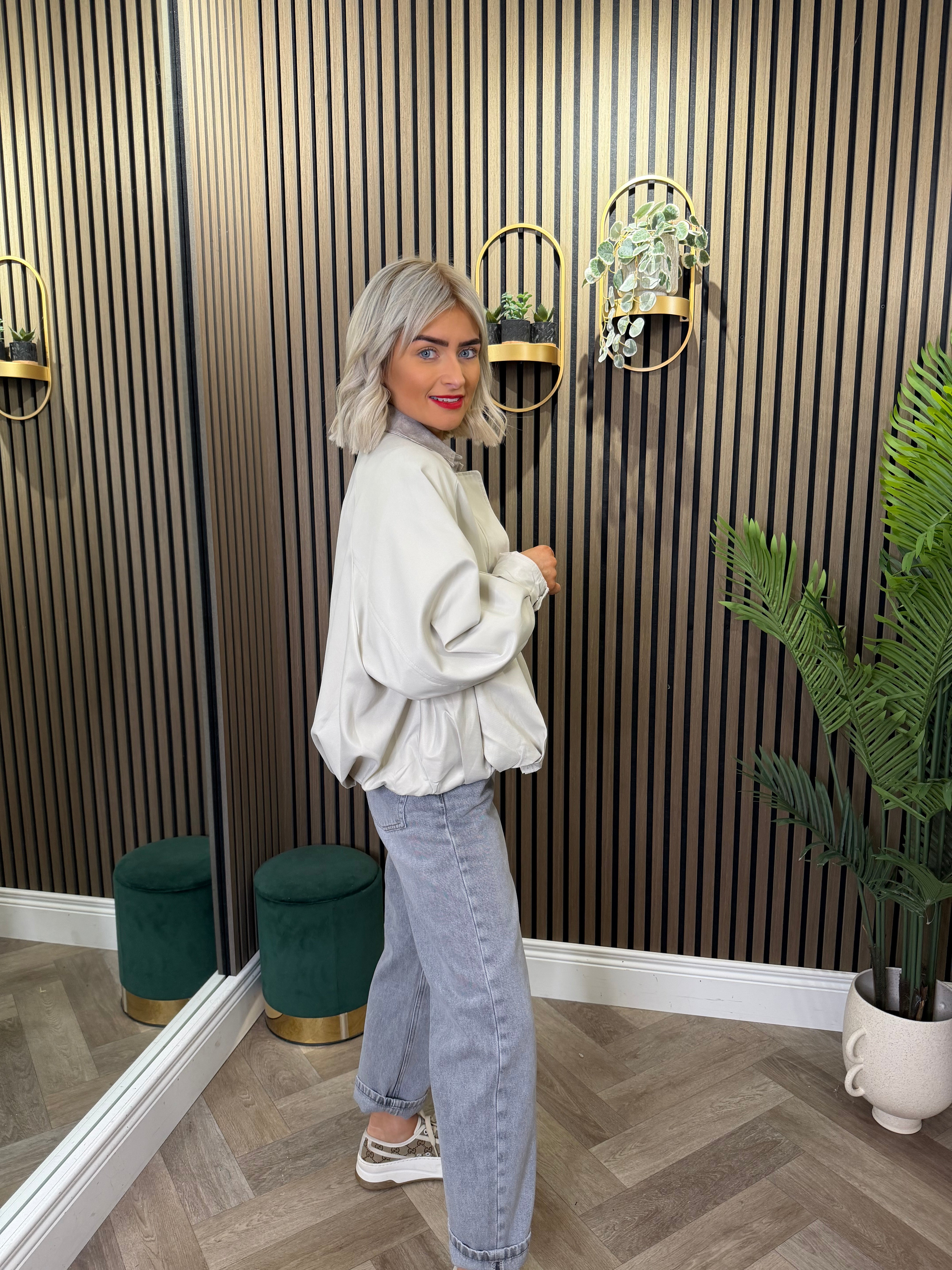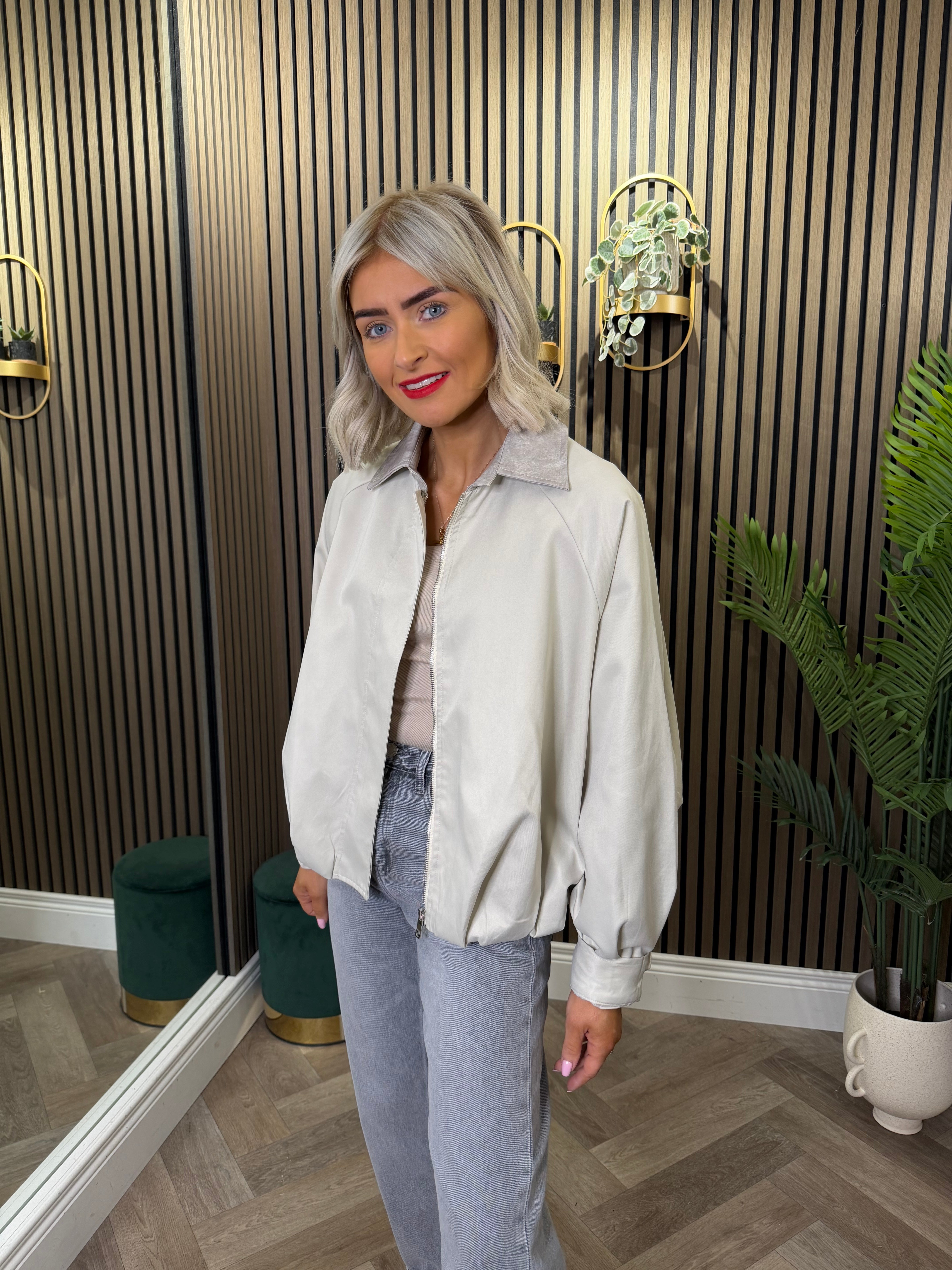 Long sleeve, zip up greige jacket. Faux leather style collar.