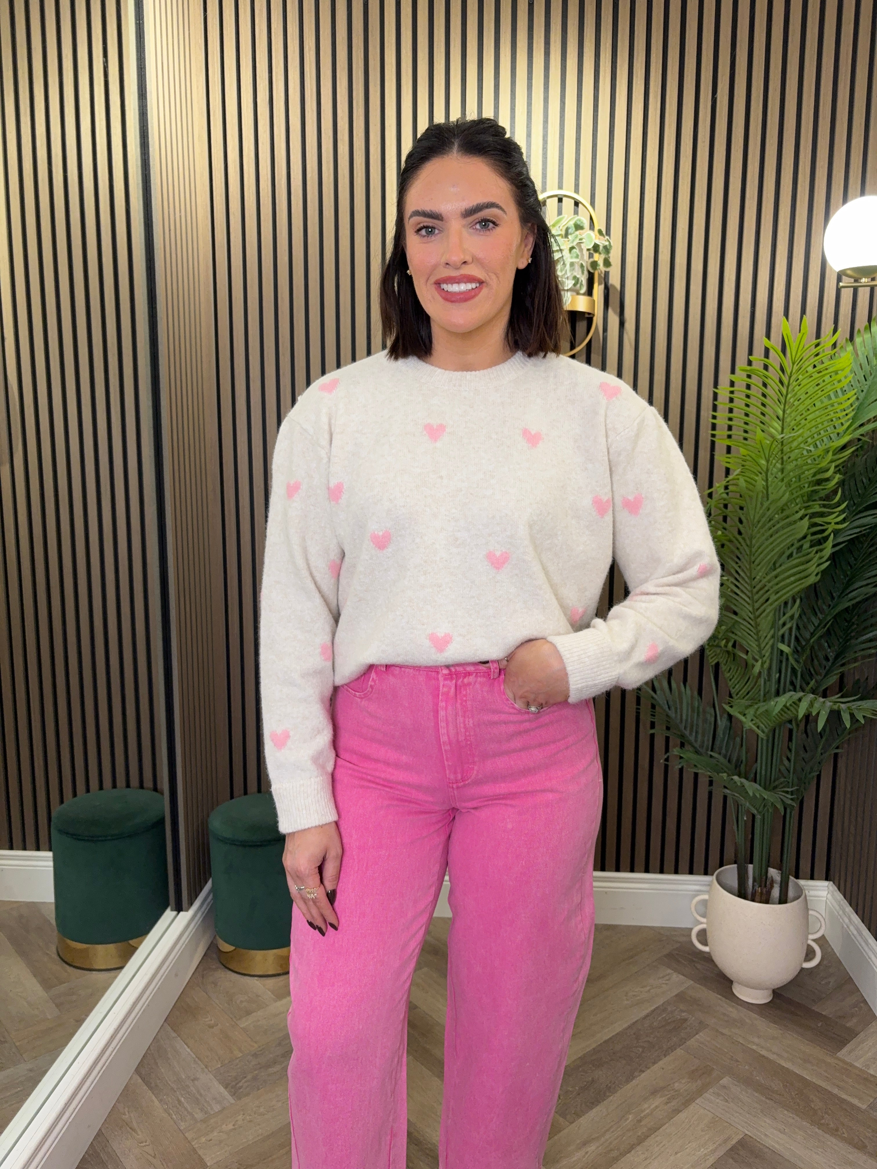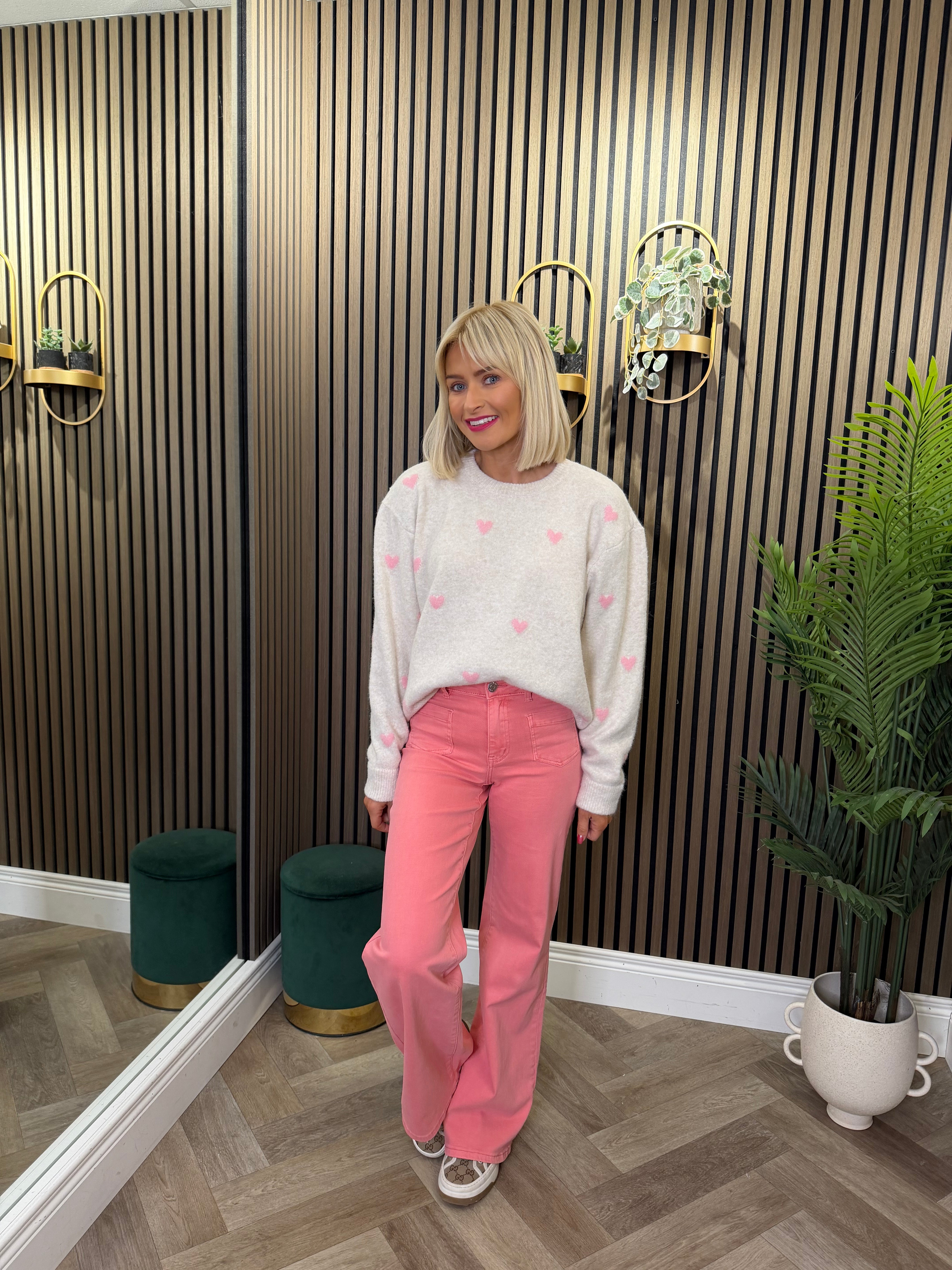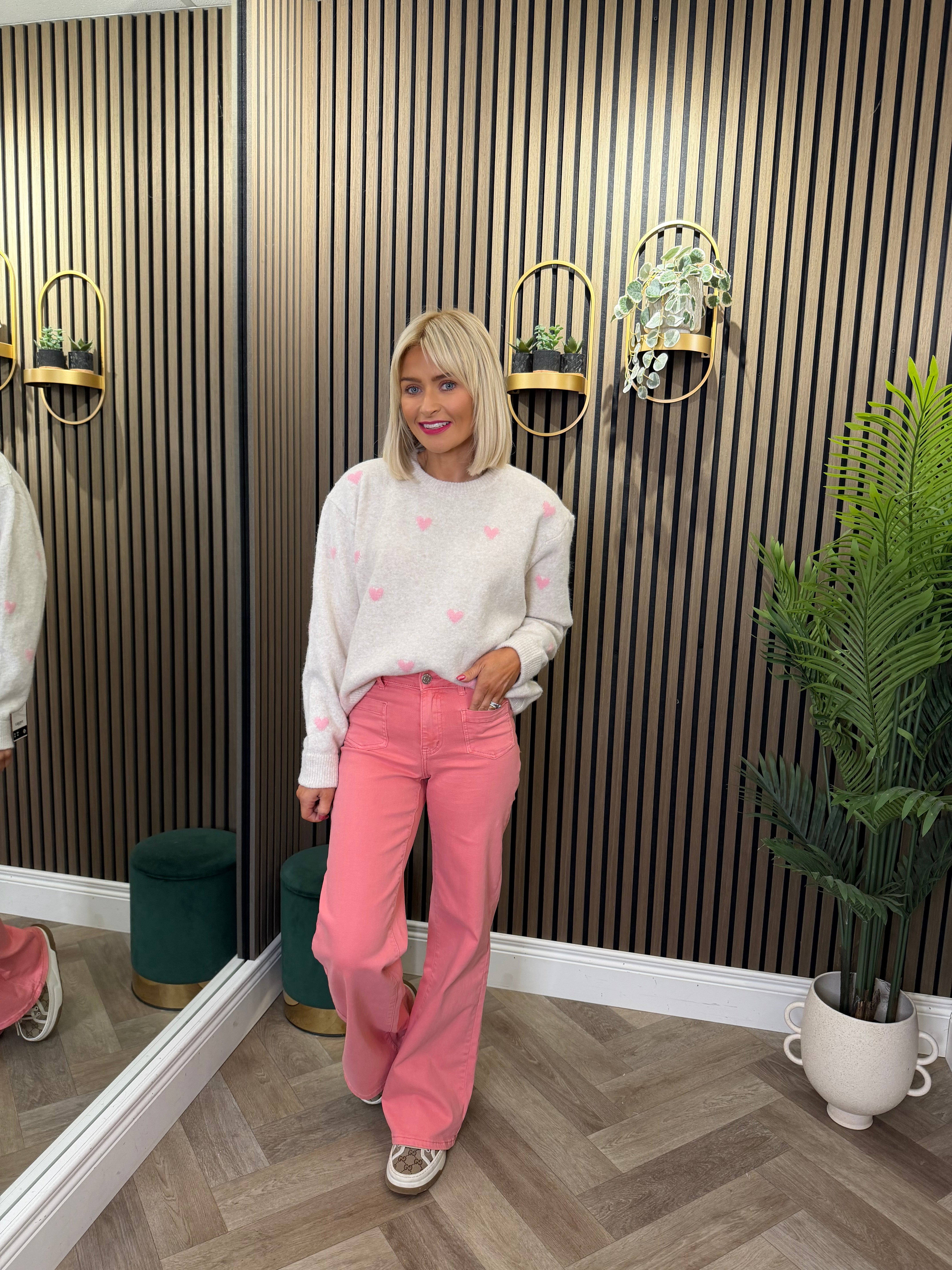 Long sleeve, round neckline, knit style jumper. Heart detailing. Available in more colours.