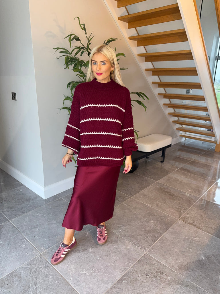 High waisted, midi length, satin/silk style skirt. Available in more colours.