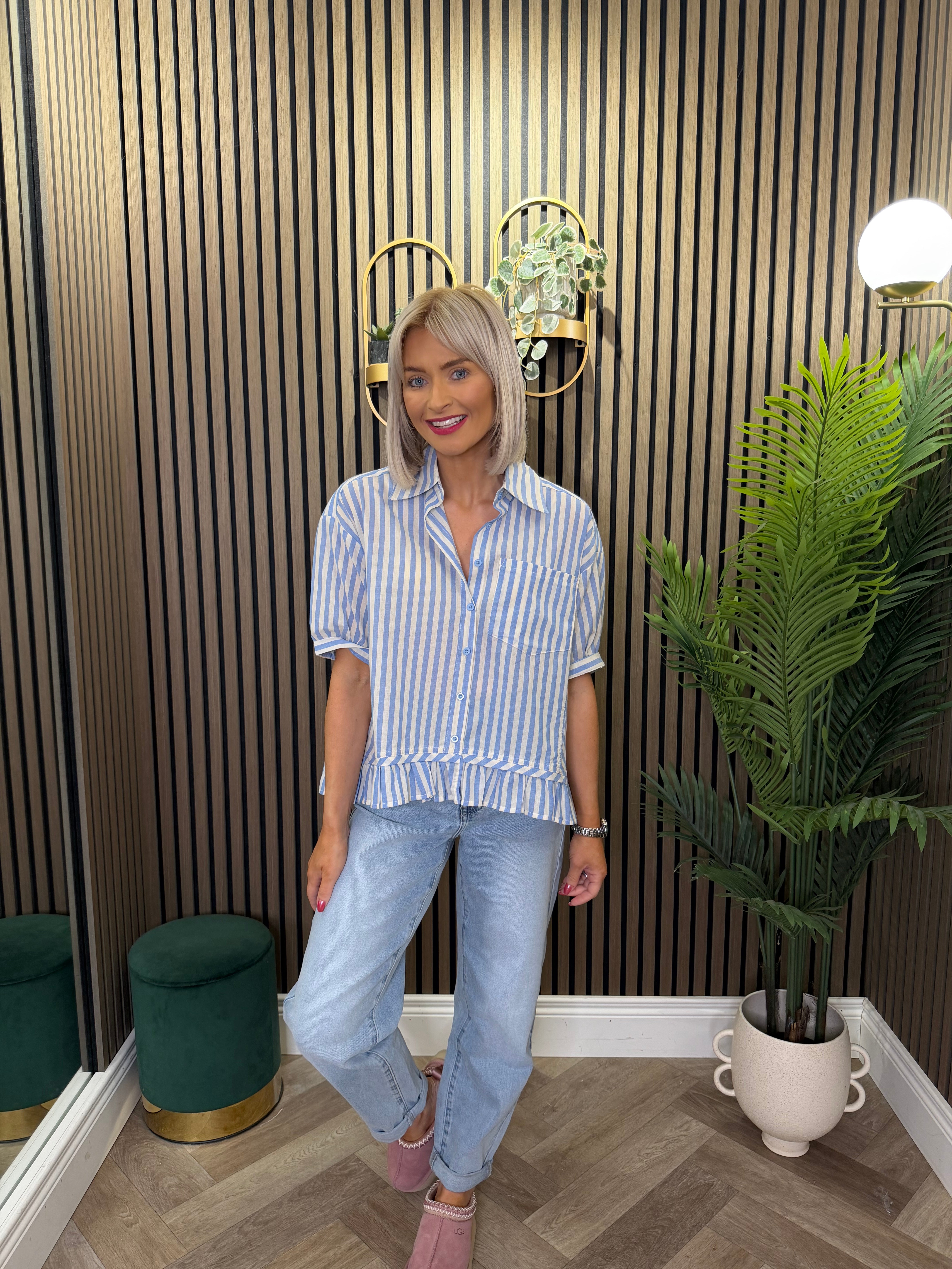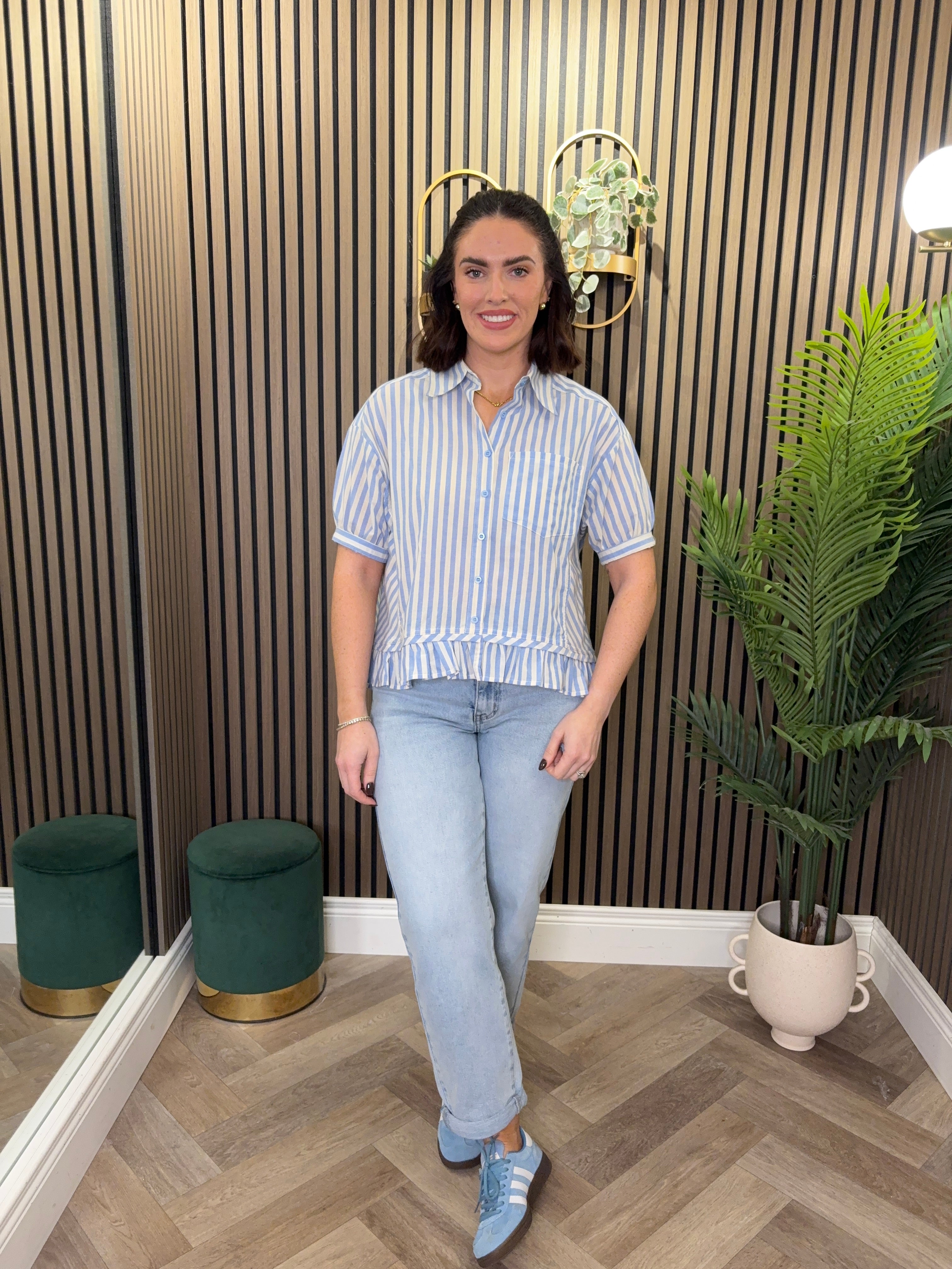 Short sleeve, button up, stripe shirt. Peplum, frill detailing.