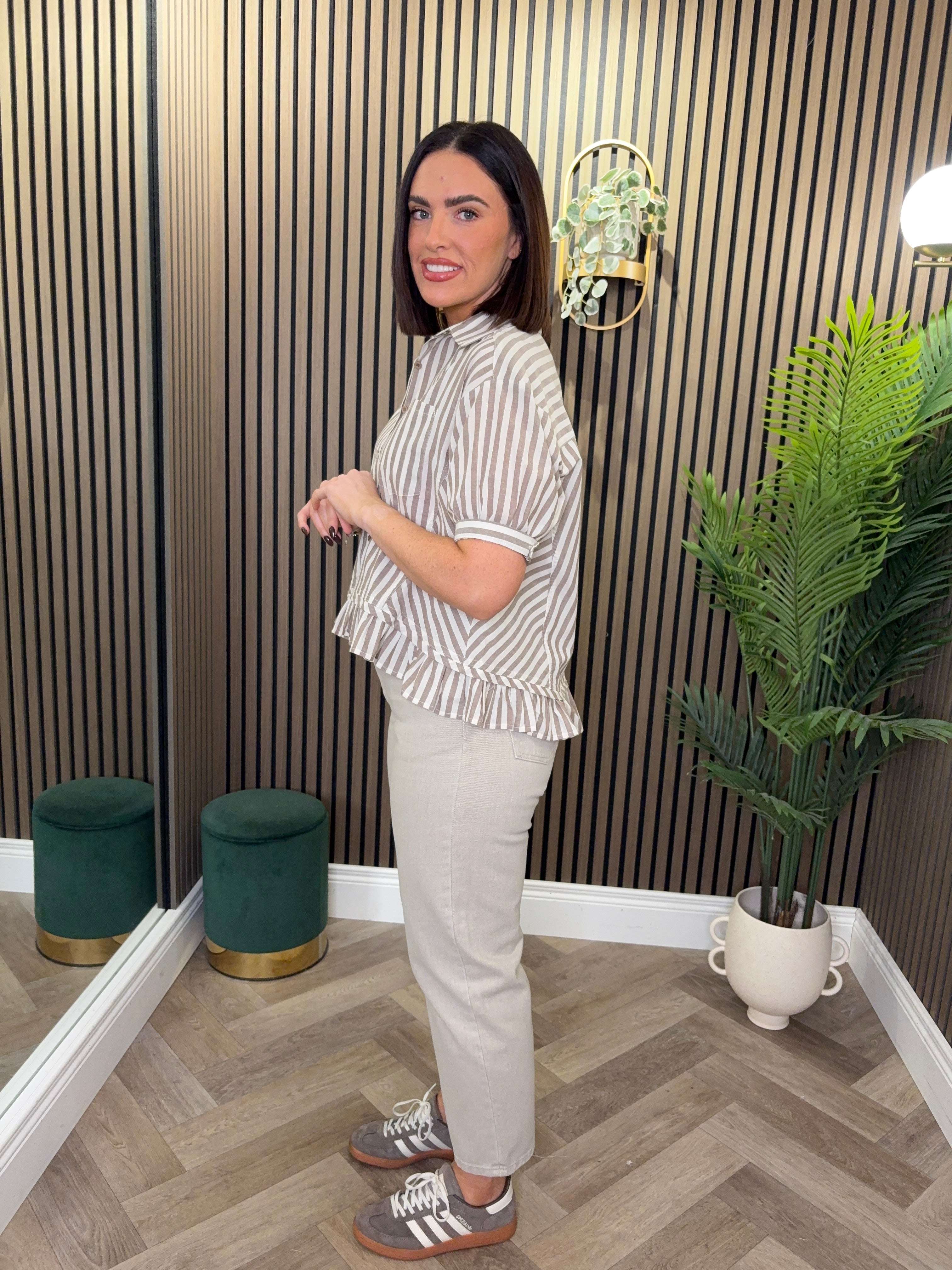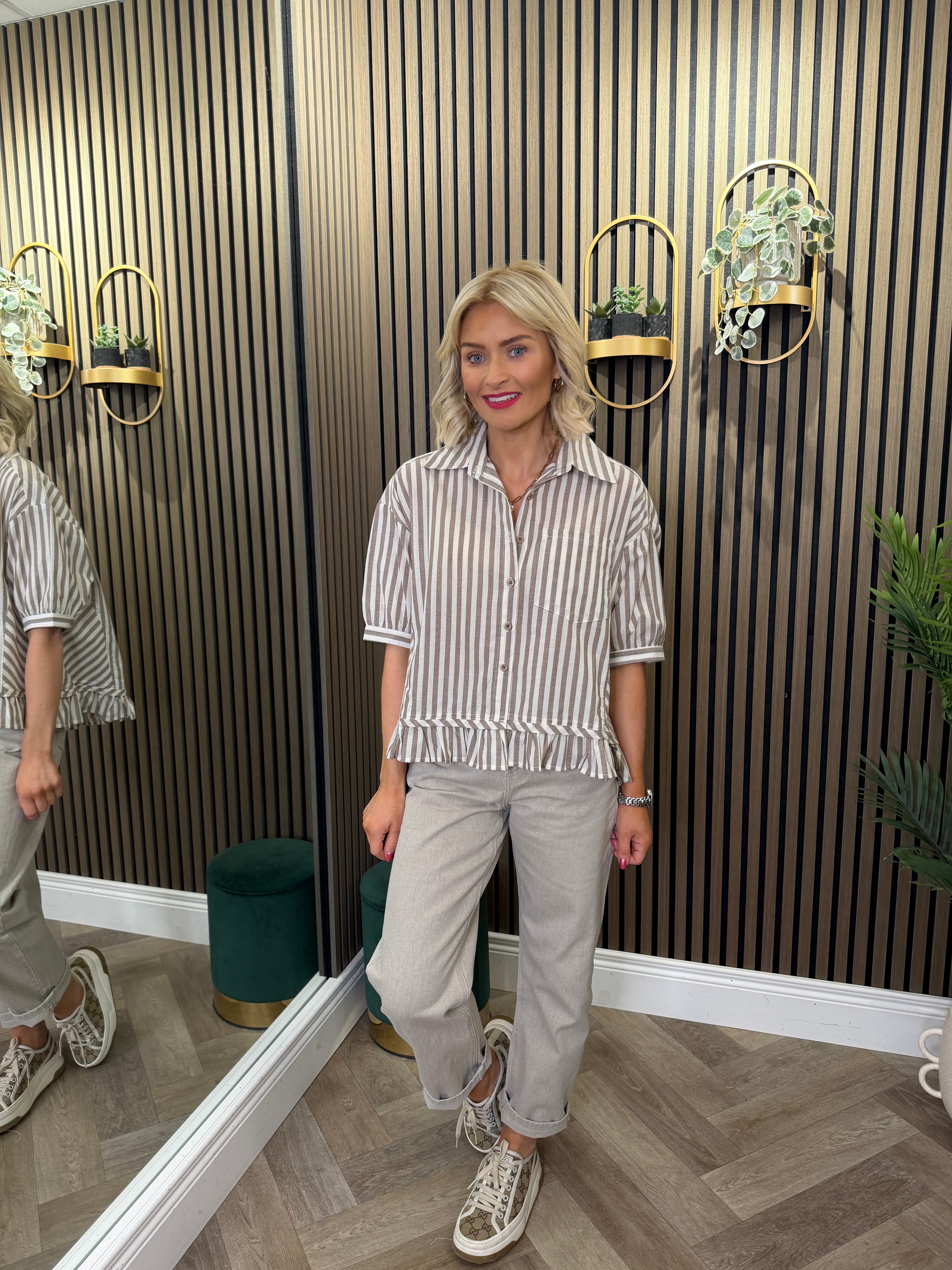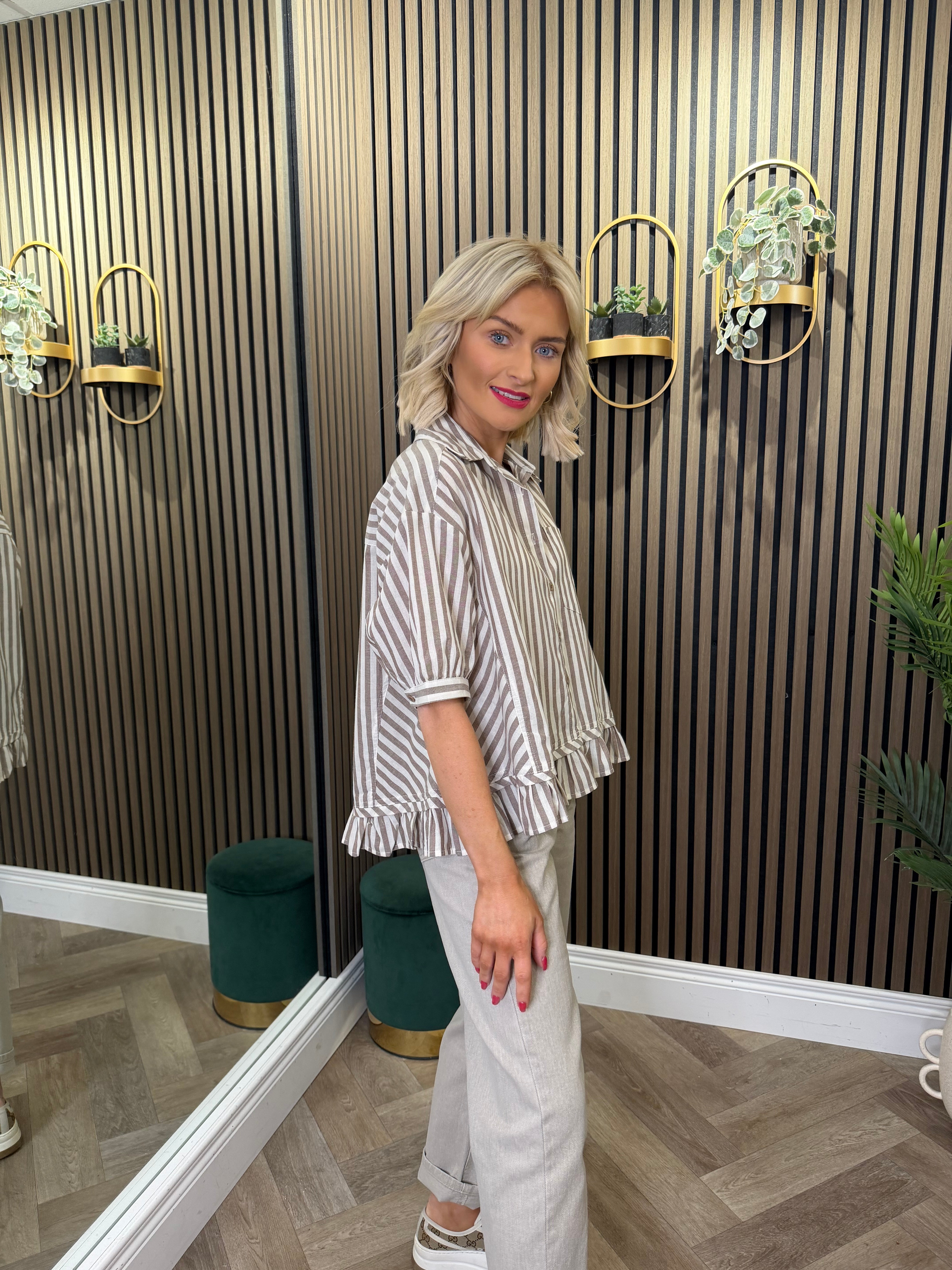 Short sleeve, button up, stripe shirt. Peplum, frill detailing.