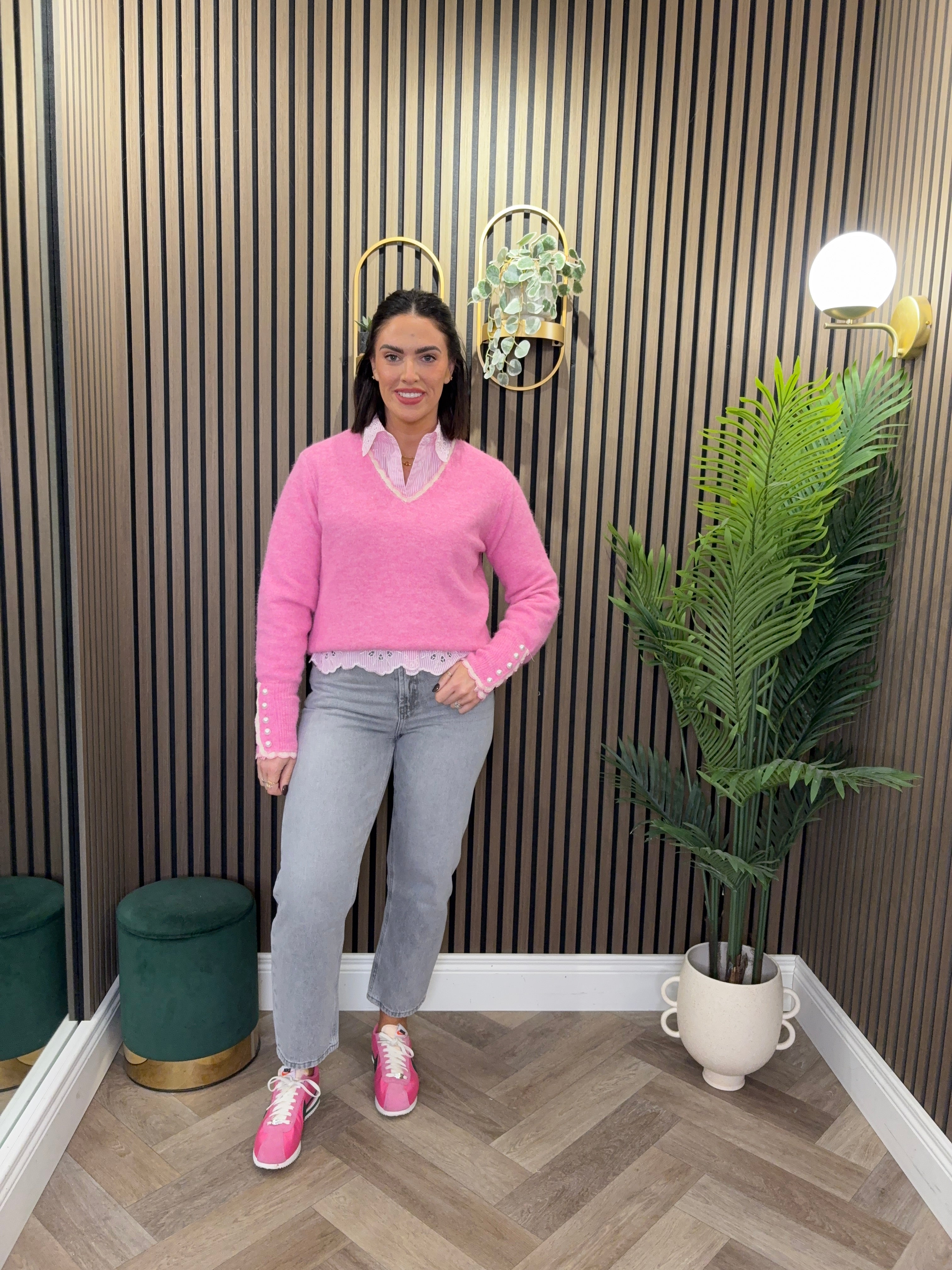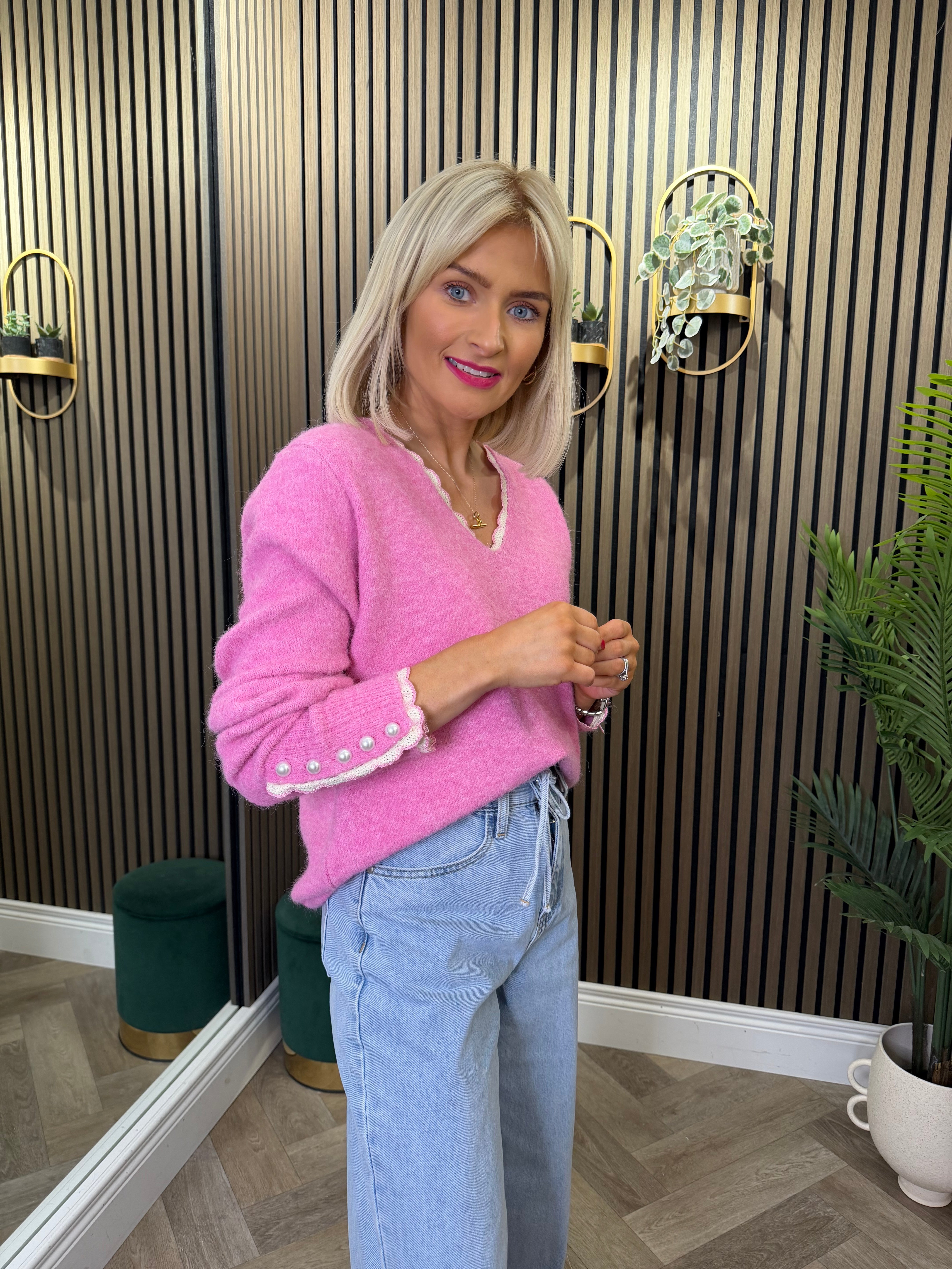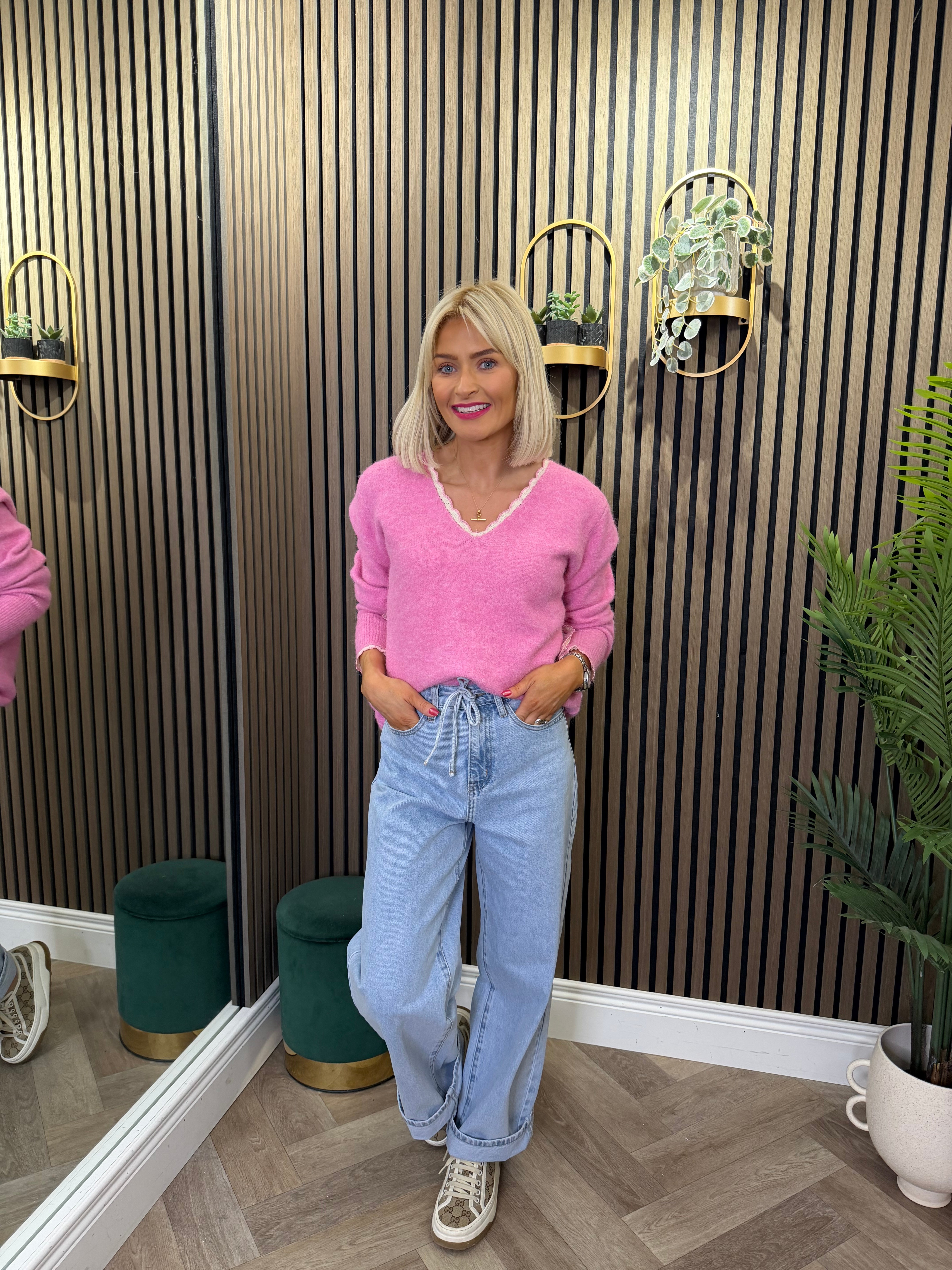 Long sleeve, knit style jumper. V neckline with small frill detailing. Available in more colours.