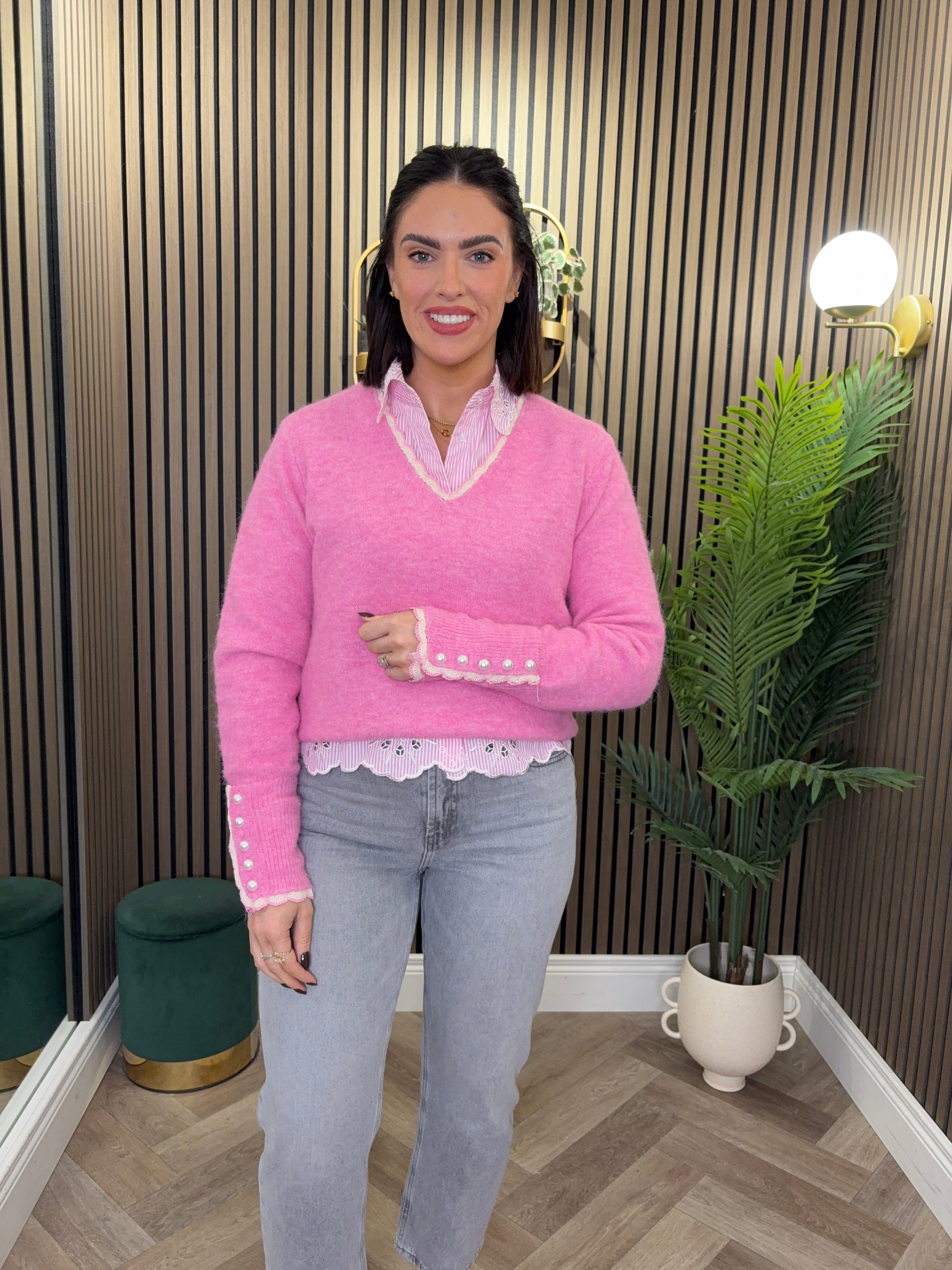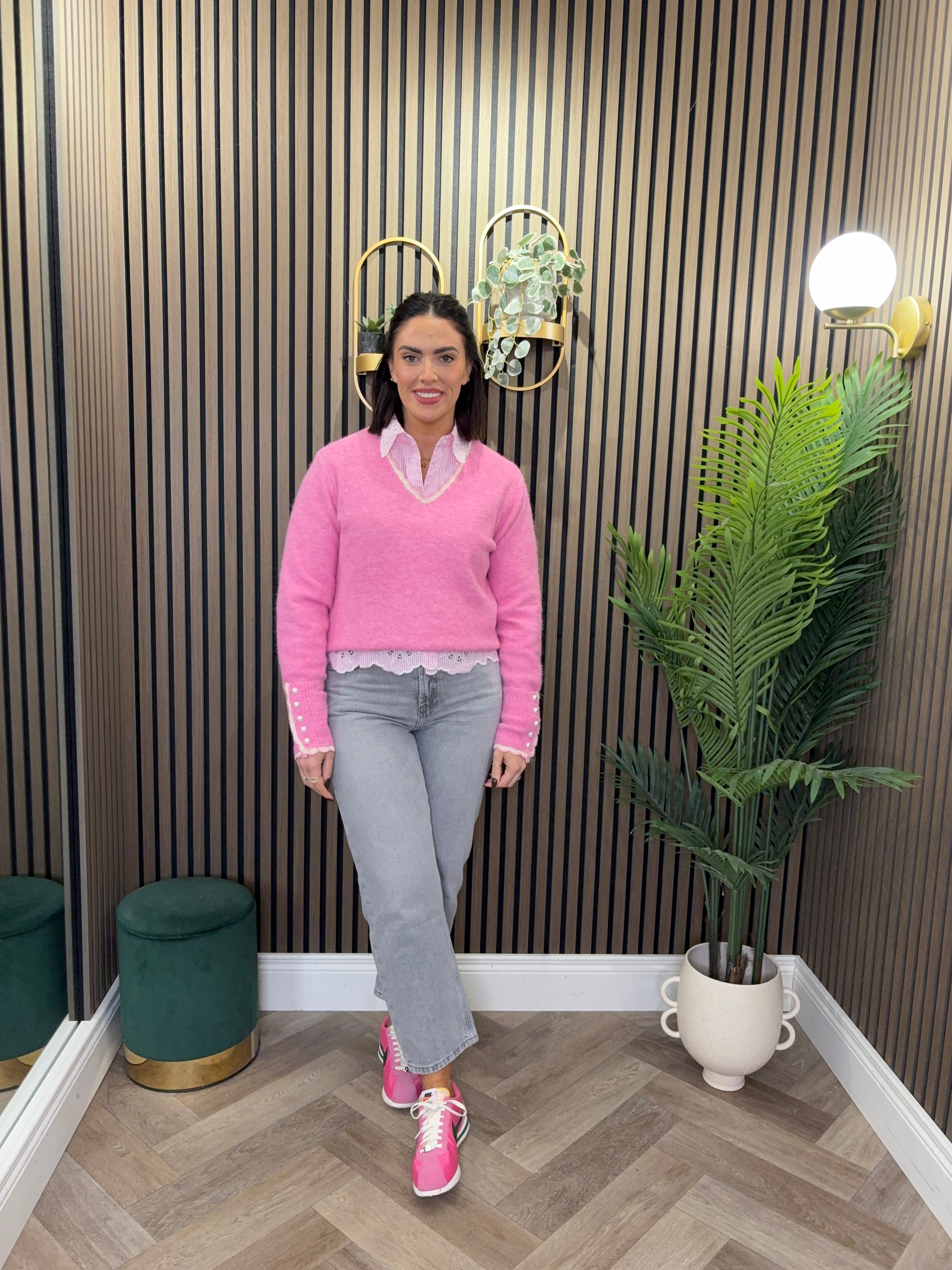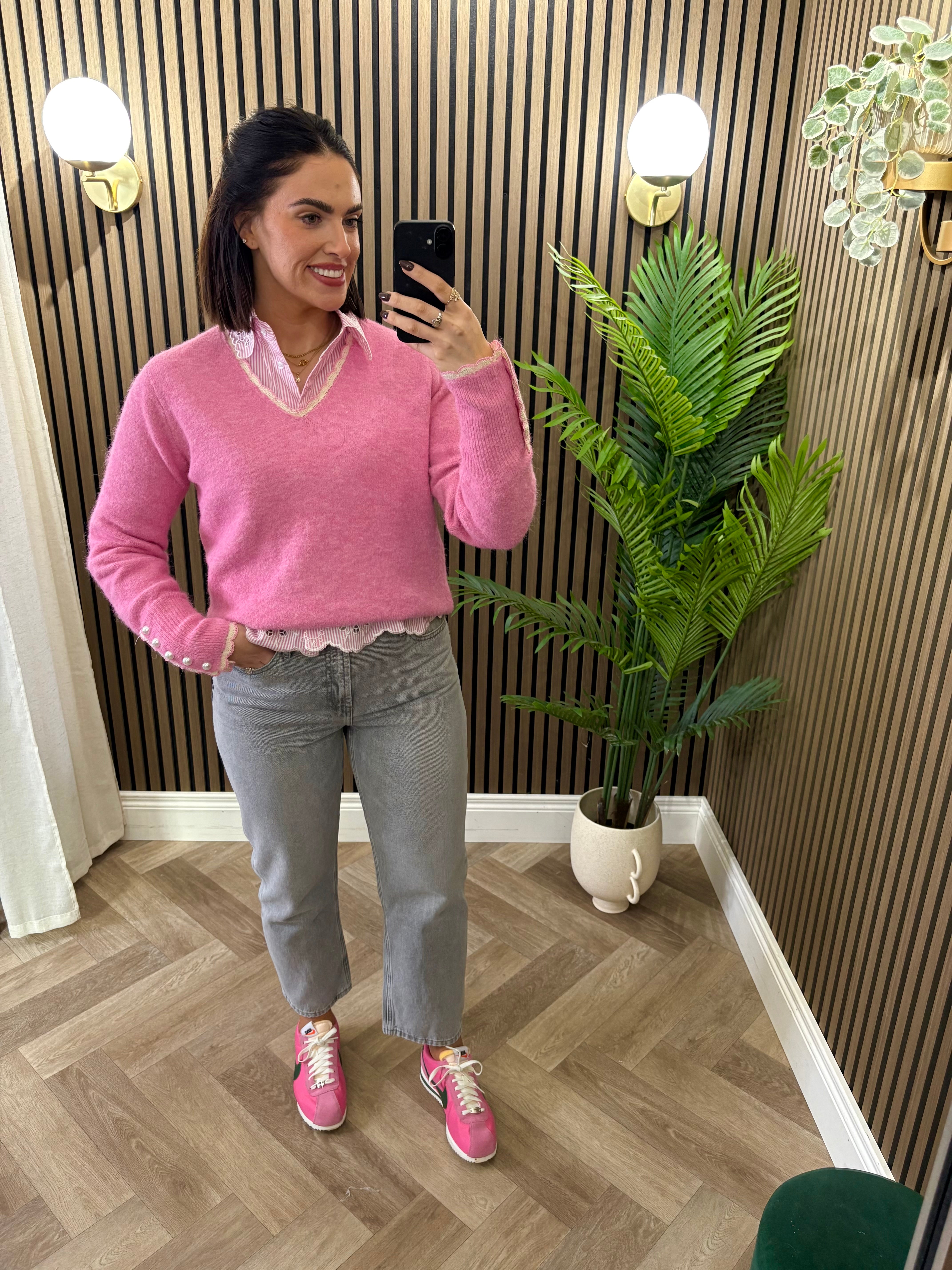 Long sleeve, knit style jumper. V neckline with small frill detailing. Available in more colours.