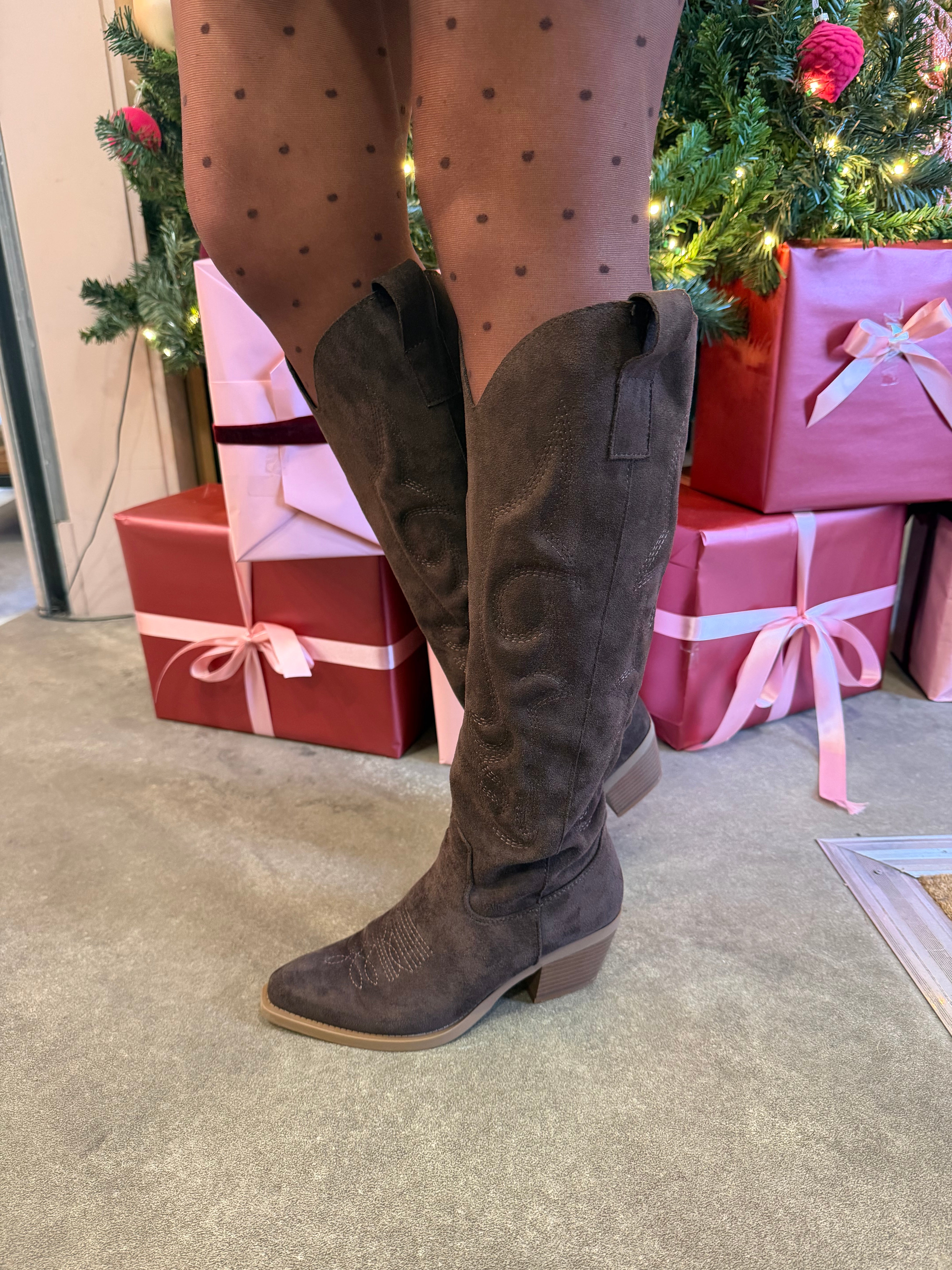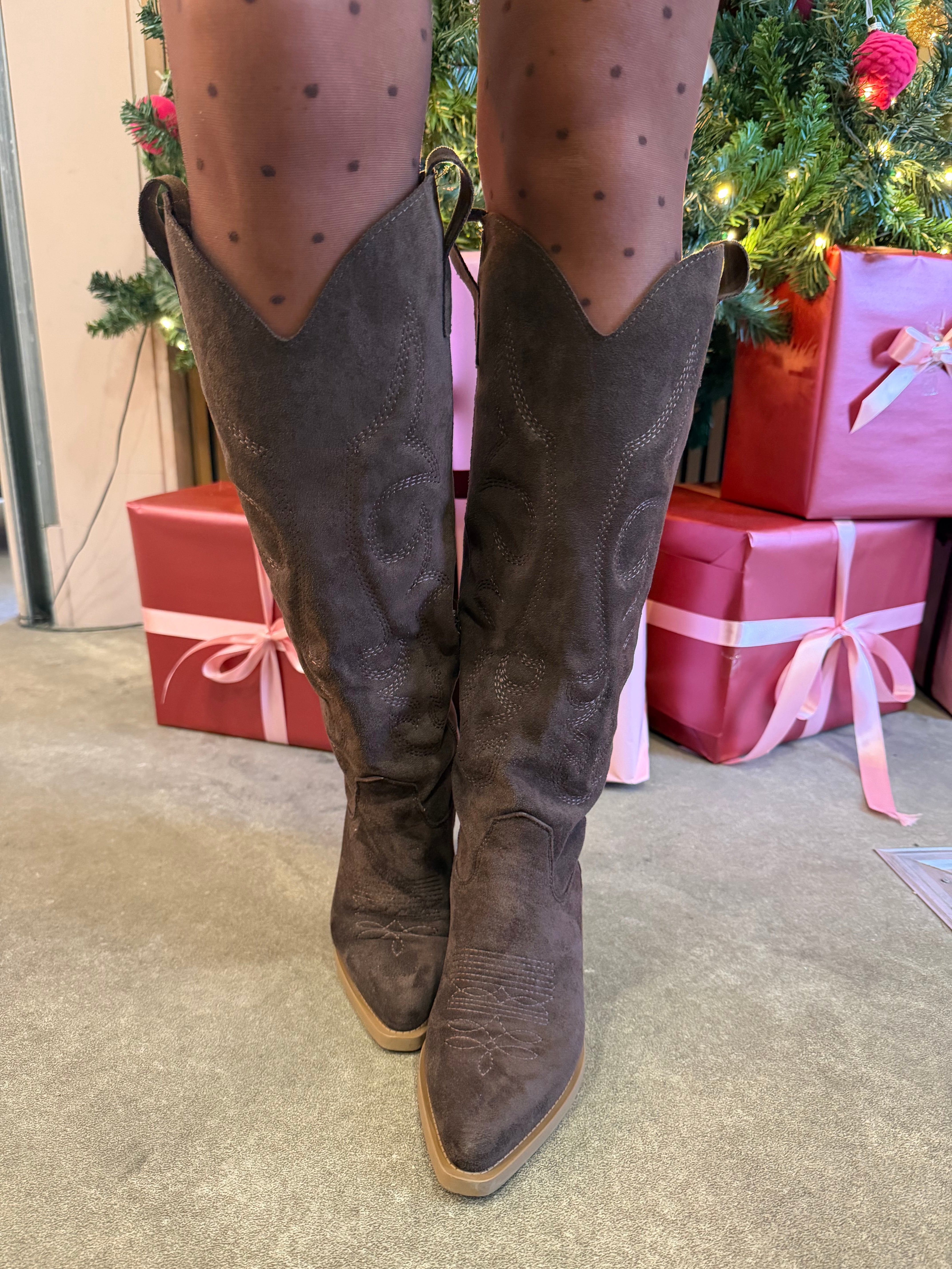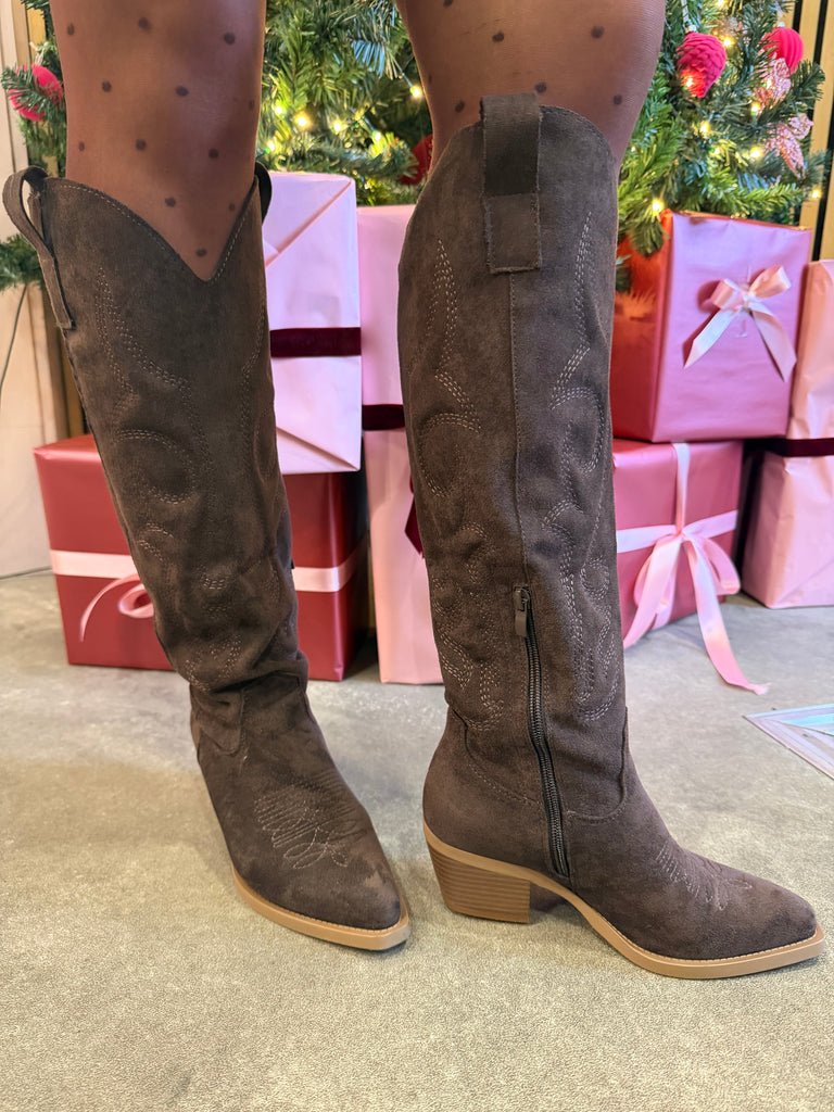 Knee length, cow boy style boots. Brown suede. Small block heel.